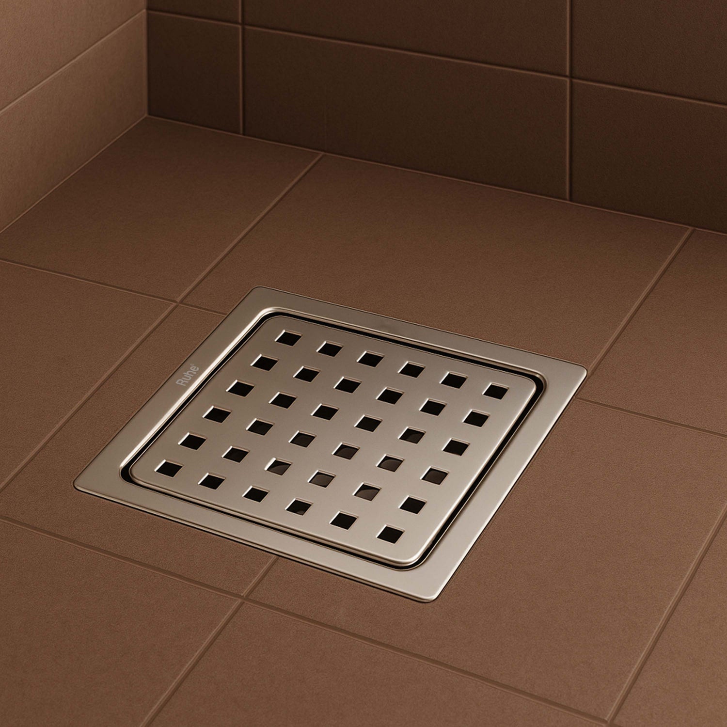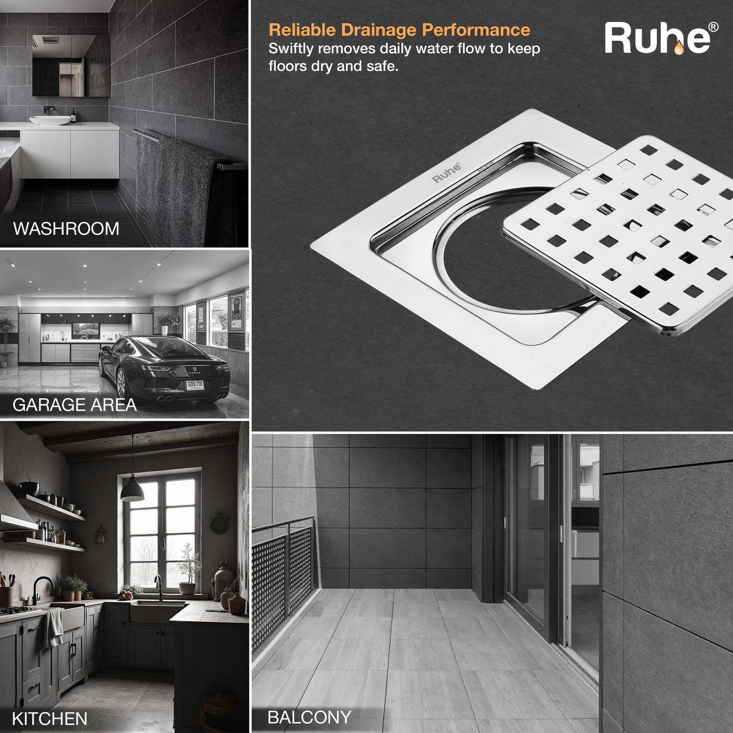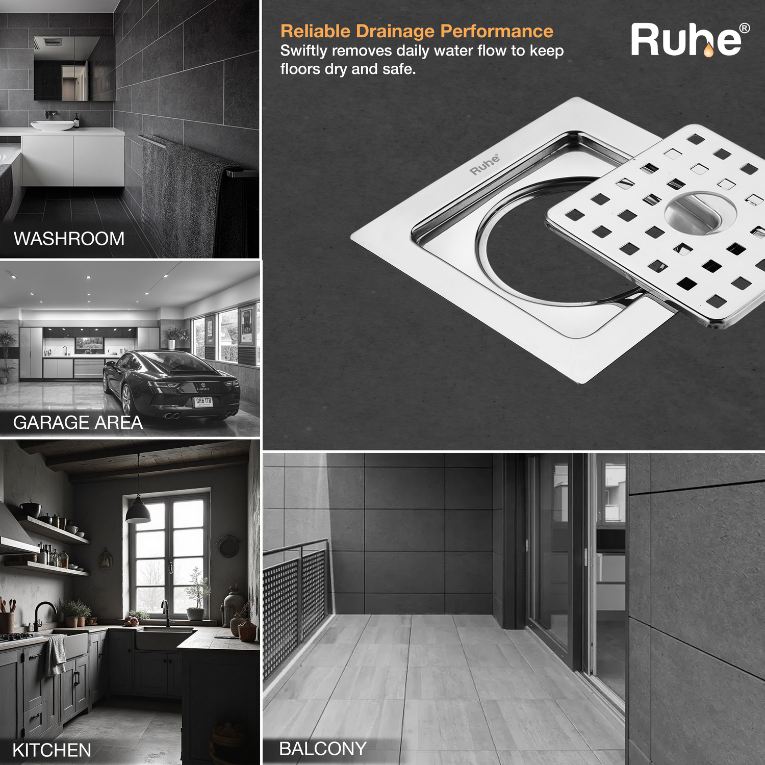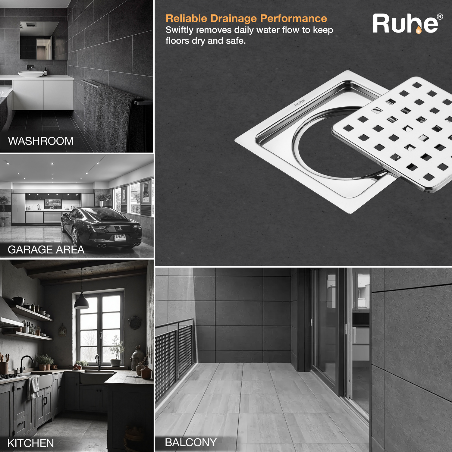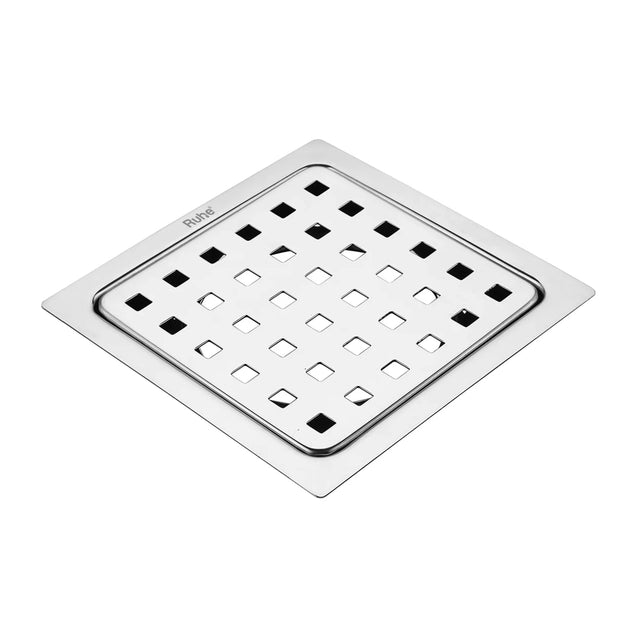 Ruhe Check Square Flat Cut Floor Drain is a square-grid, flat-edged, durable floor drain that enables quick drainage and comes with 10 years of warranty.