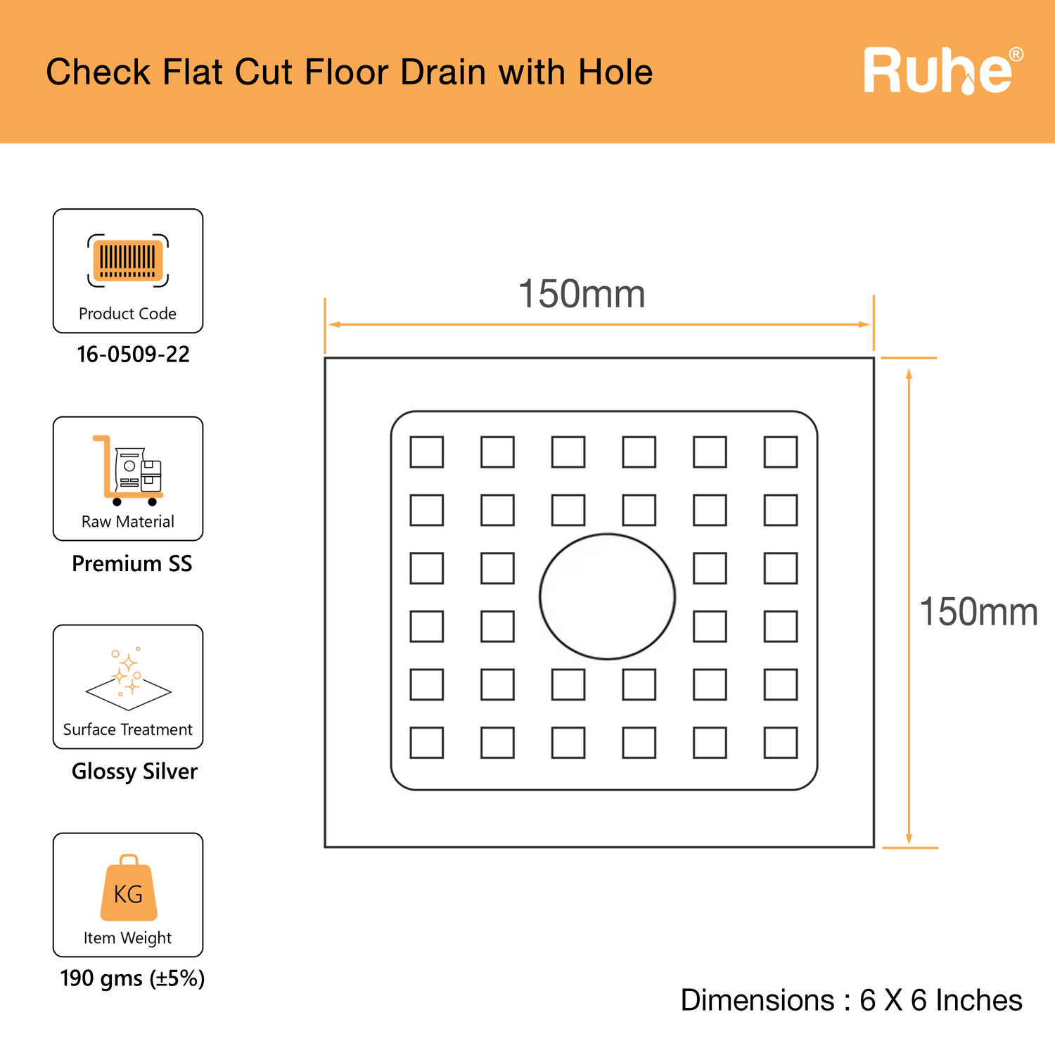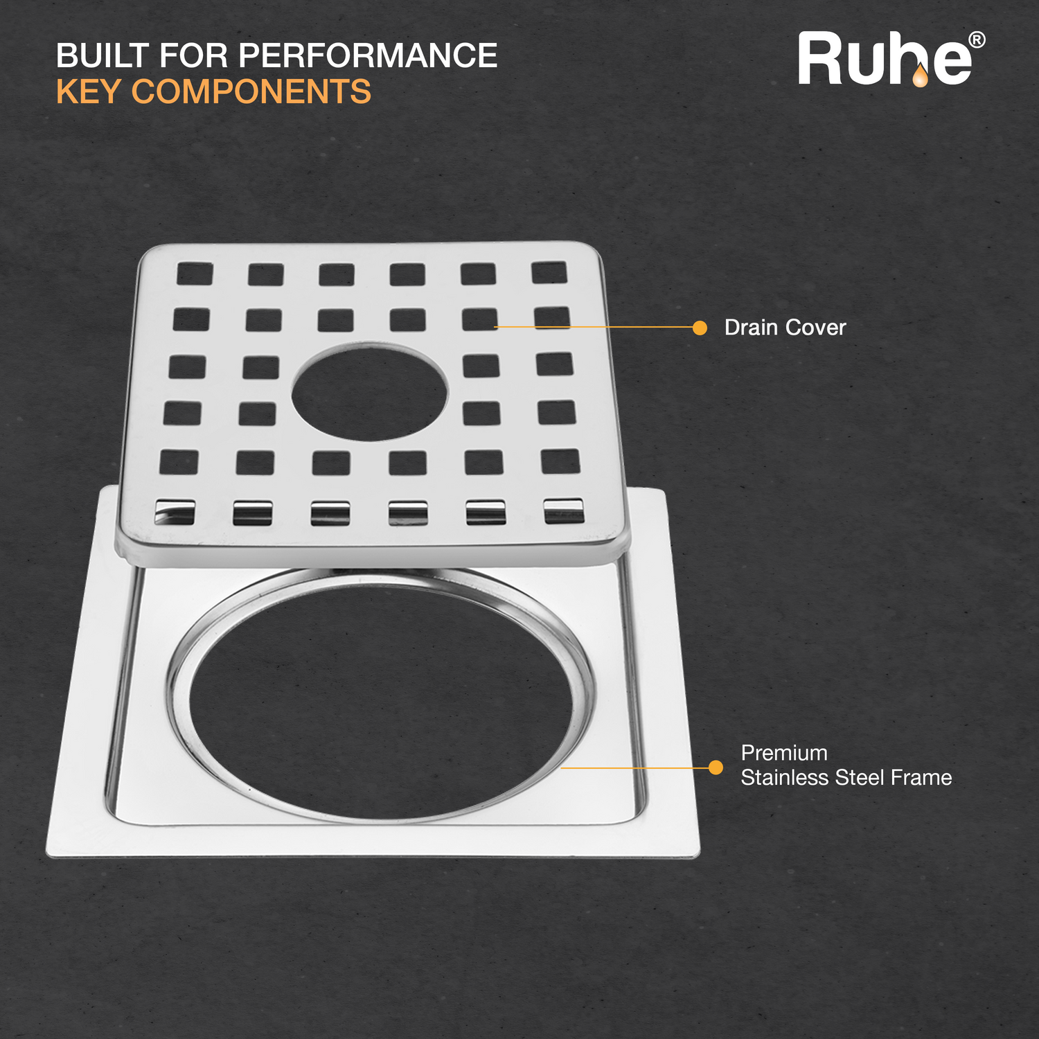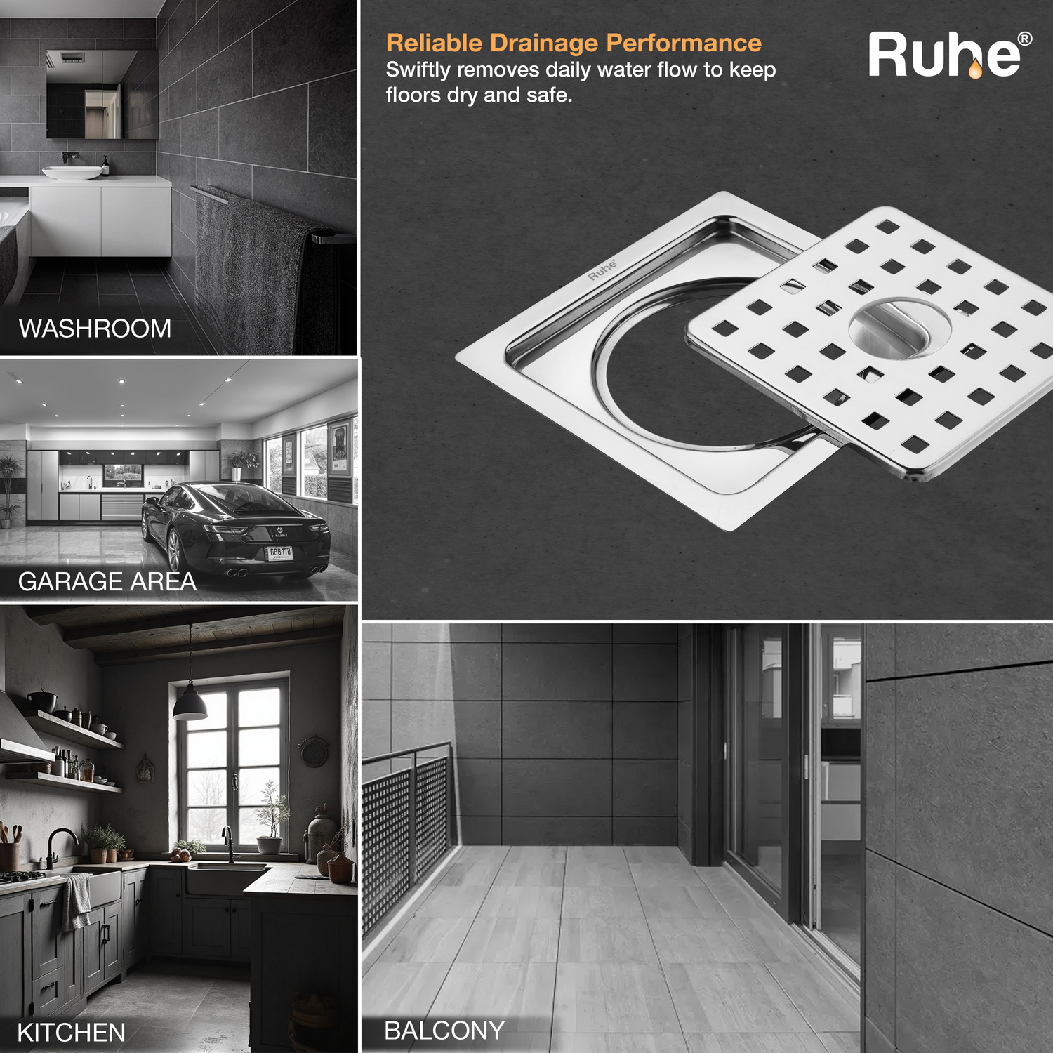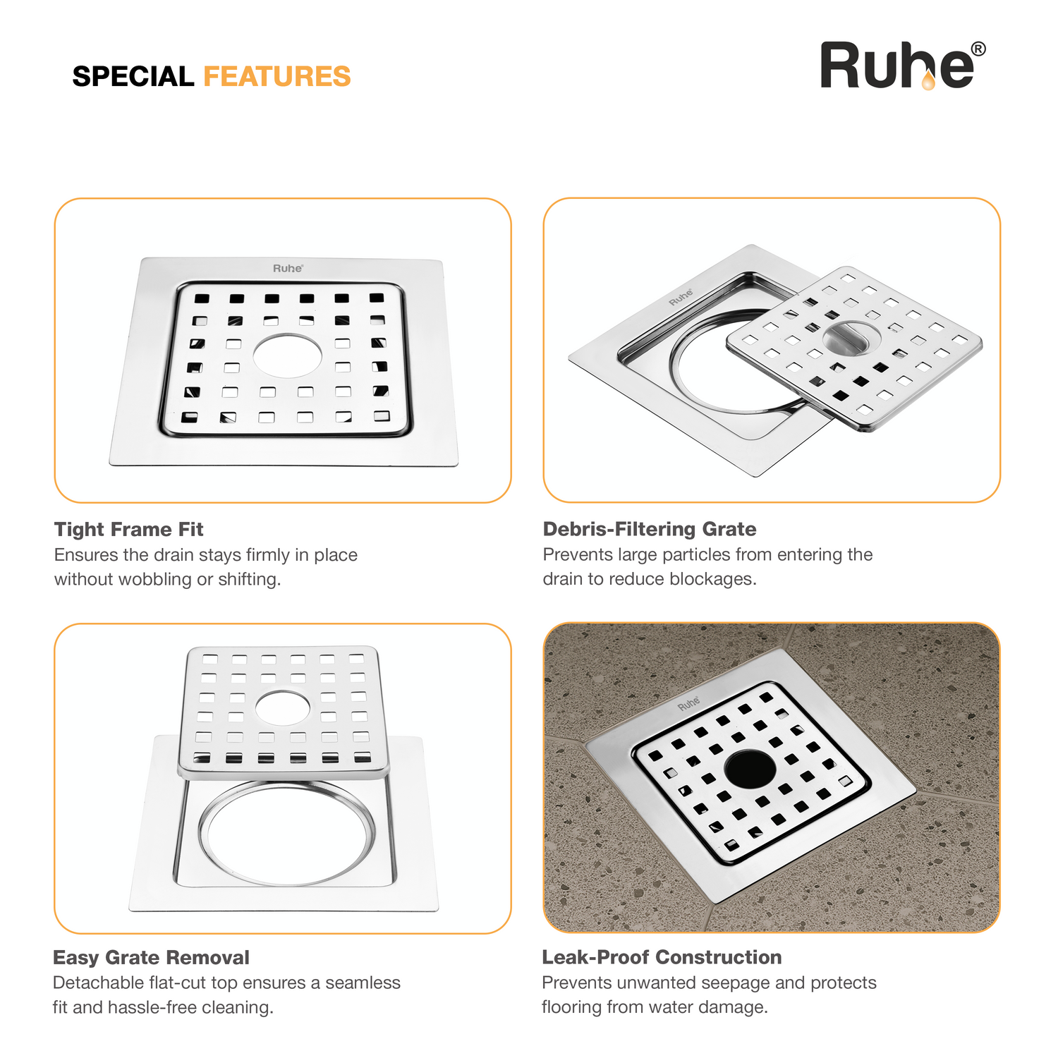 Ruhe Check Square Flat Cut Floor Drain is a square-grid, flat-edged, durable floor drain that enables quick drainage and comes with 10 years of warranty.