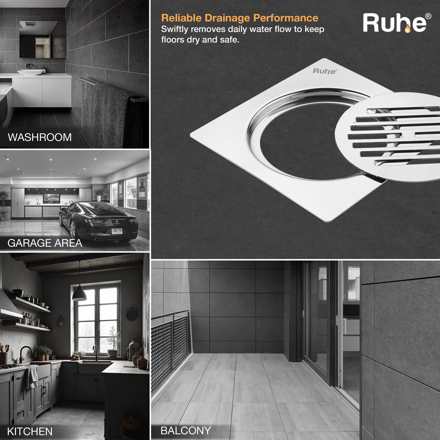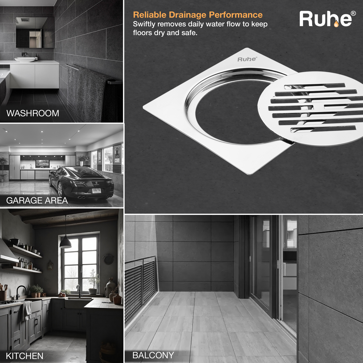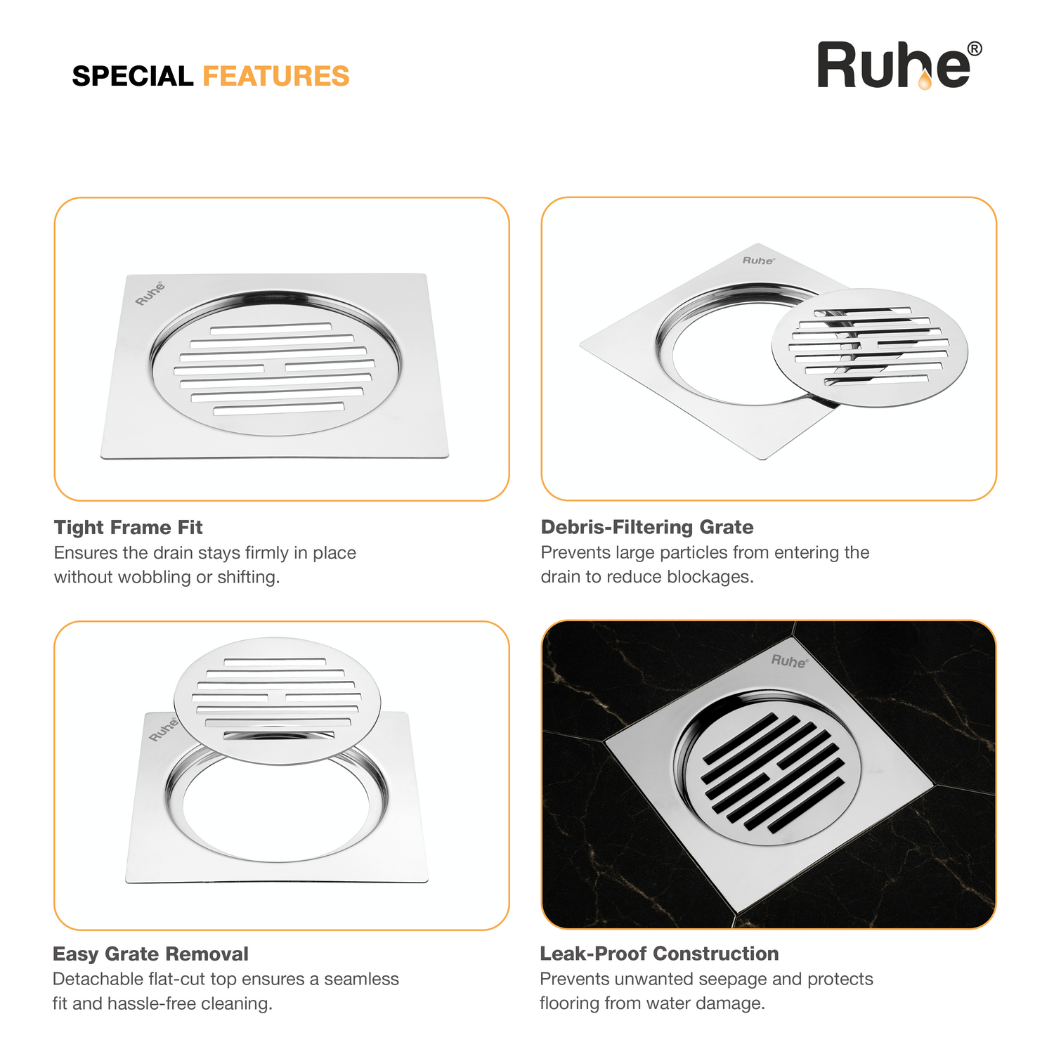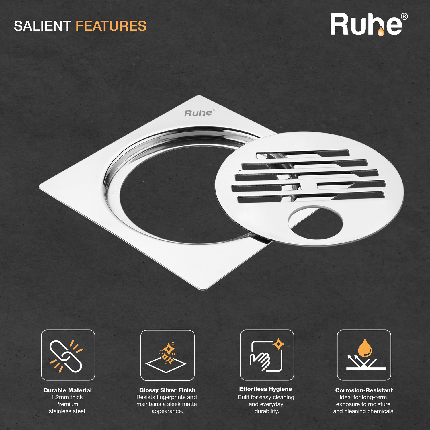 Floor Drains are manufactured in Premium Stainless Steel equipped with non-corrosive and rust-resistant qualities.