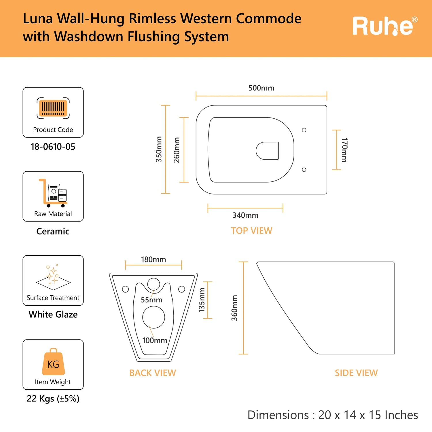 Luna Wall-Hung Rimless Western Commode with Washdown Flushing System