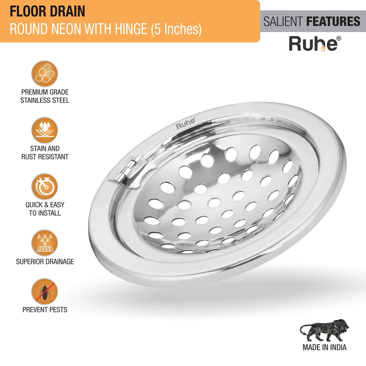 Ruhe Round Neon Floor Drain is a basic, most-selling and everlasting drain jali with intense efficacy and intricate design that comes with a hinged grating top.