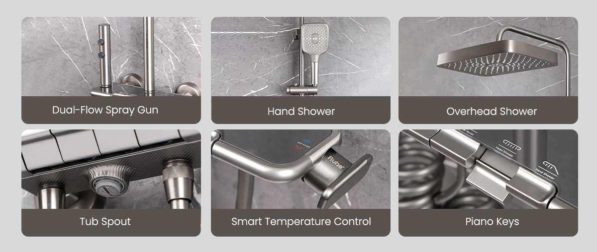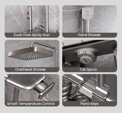 Made from solid brass ingot, this 4-in-1 Smart Shower Panel offers independent control of overhead shower, hand shower, spray gun, and tub spout.