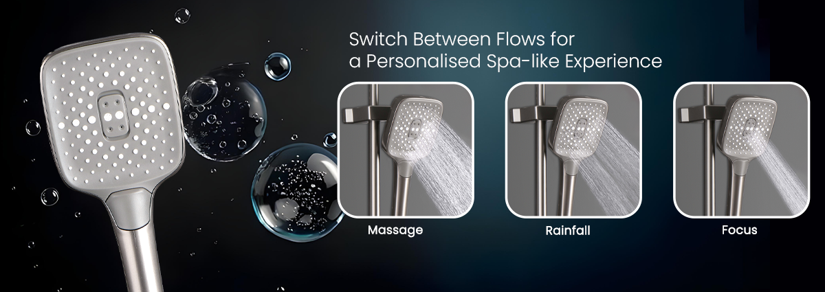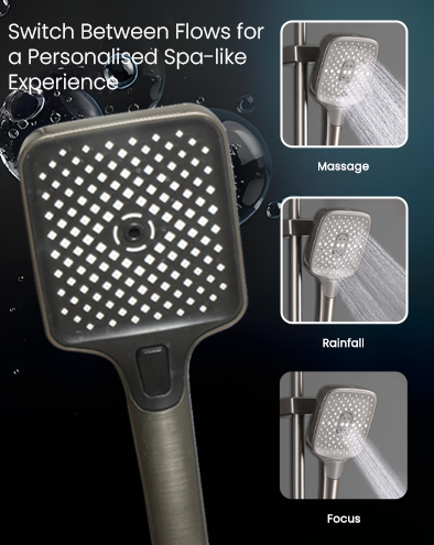 • Triple-flow hand shower with rainfall, massage & focus modes