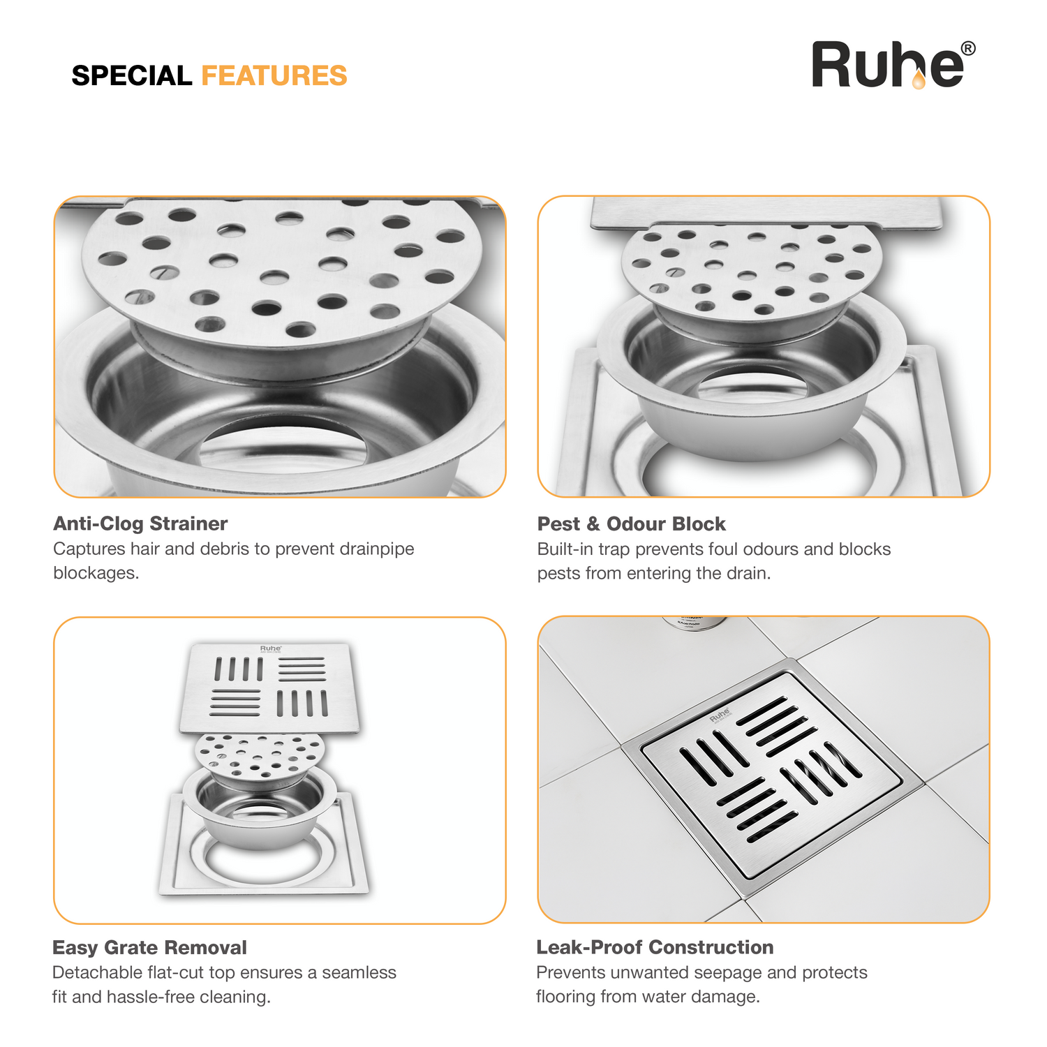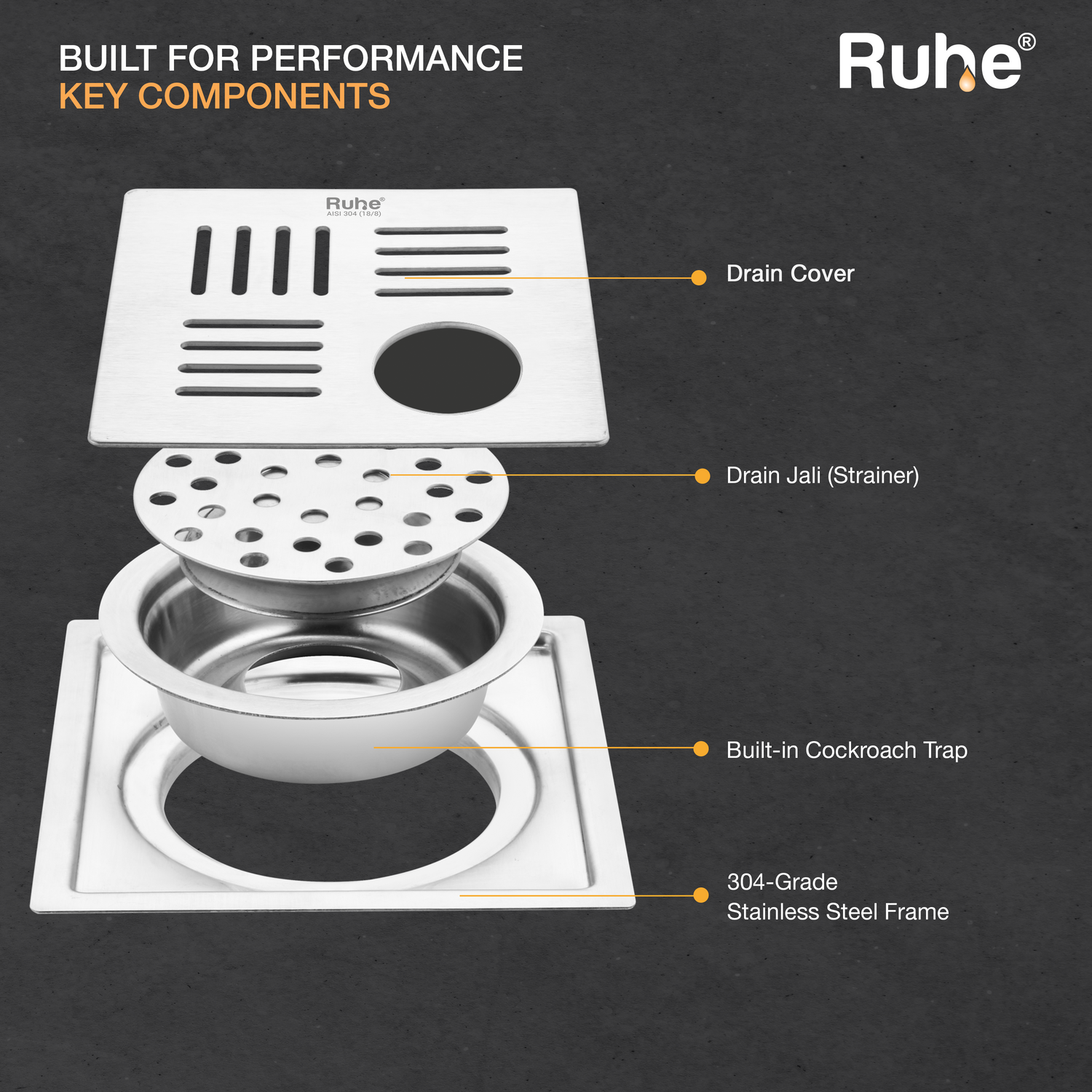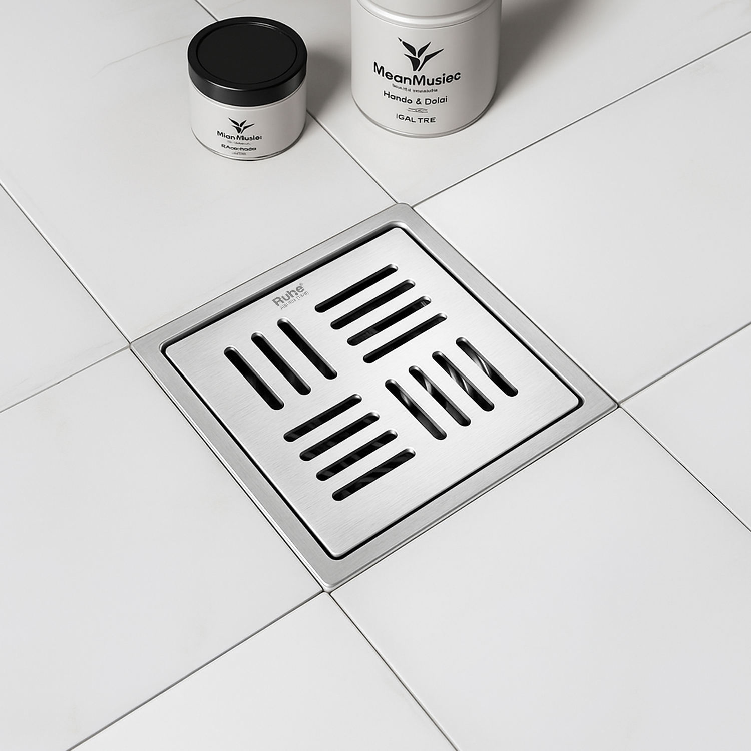 Ruhe Ruby Square Flat Cut Floor Drain is built with 1mm Thick 304-Grade Stainless Steel, has a Contemporary Grating Top/Jali, a cockroach trap for prevention of pests/blockages/odour and comes with 10 Years warranty.