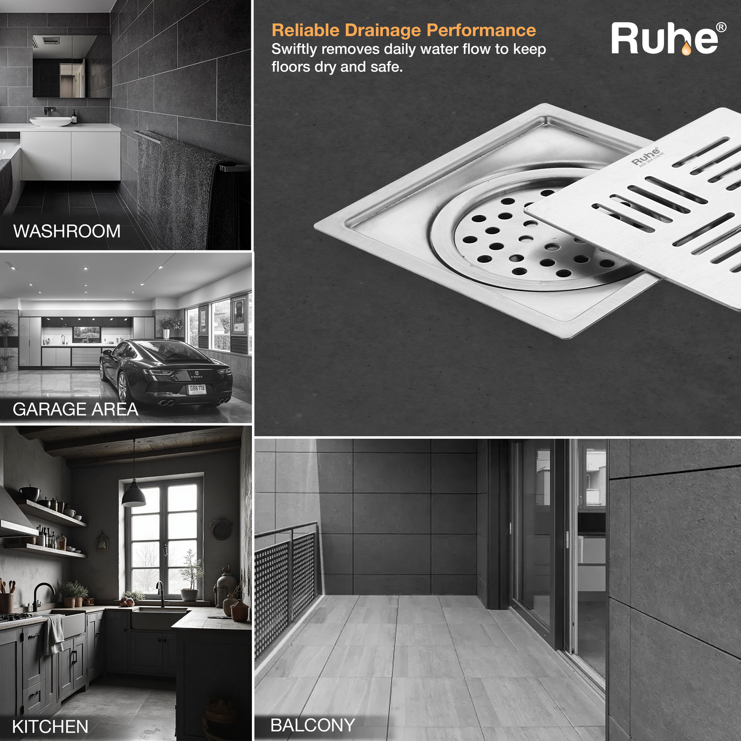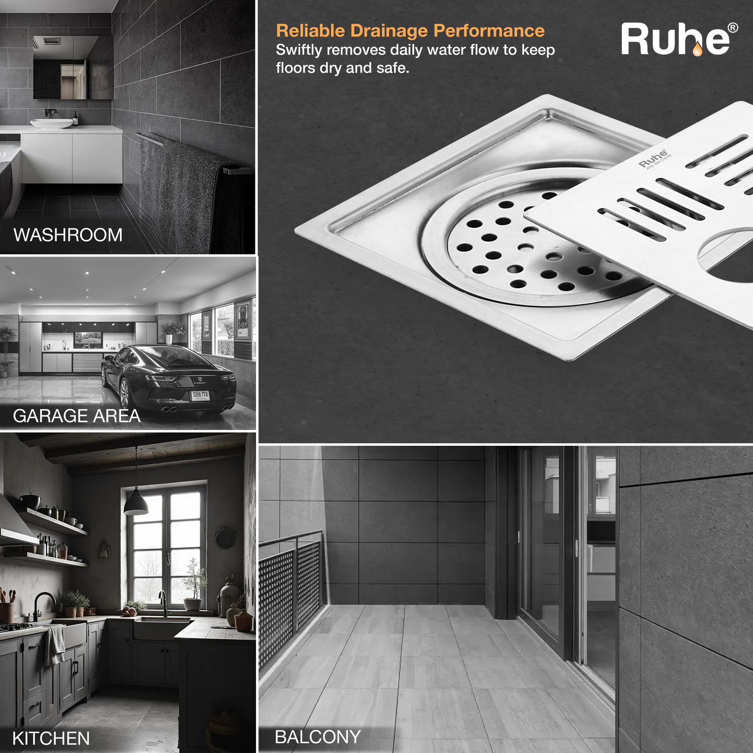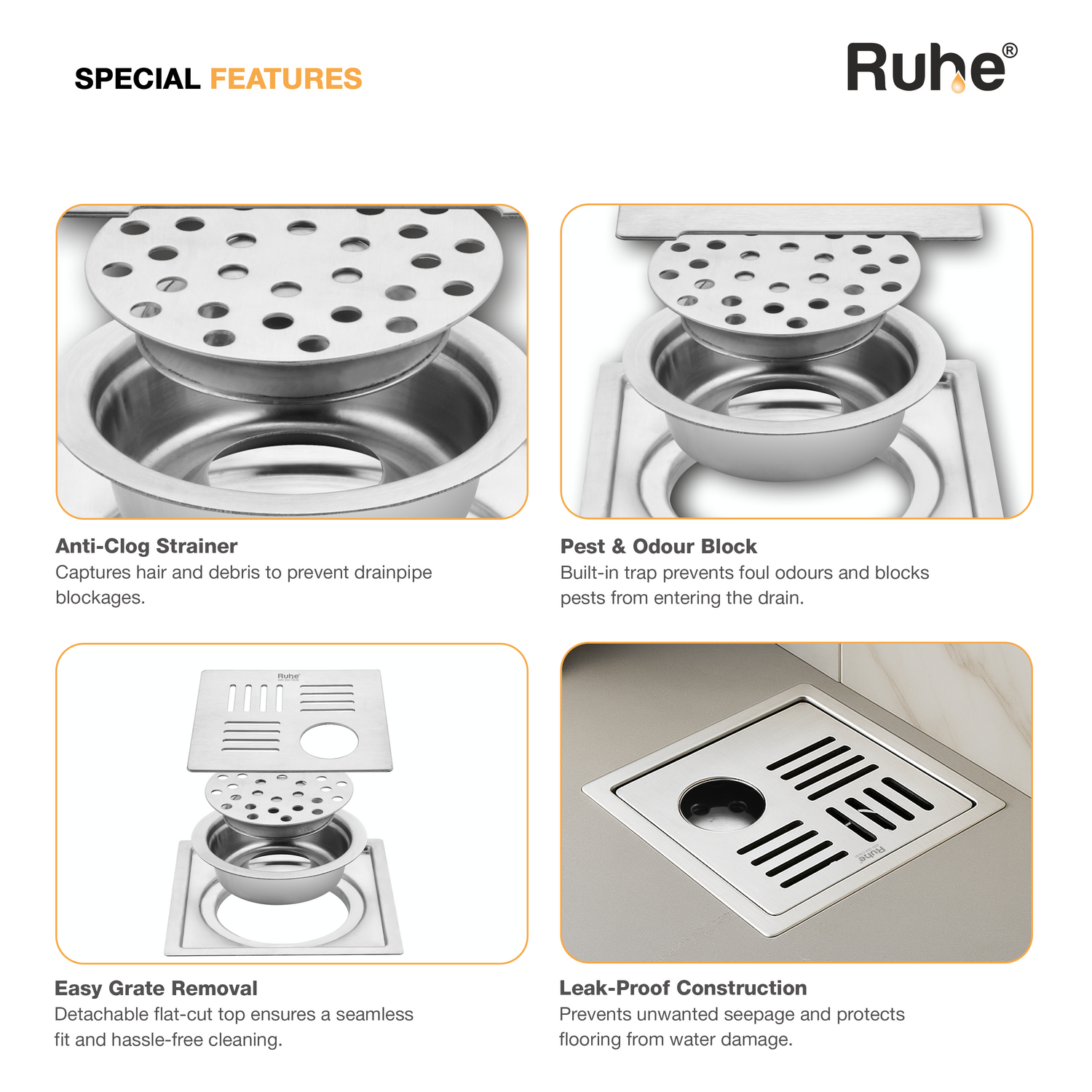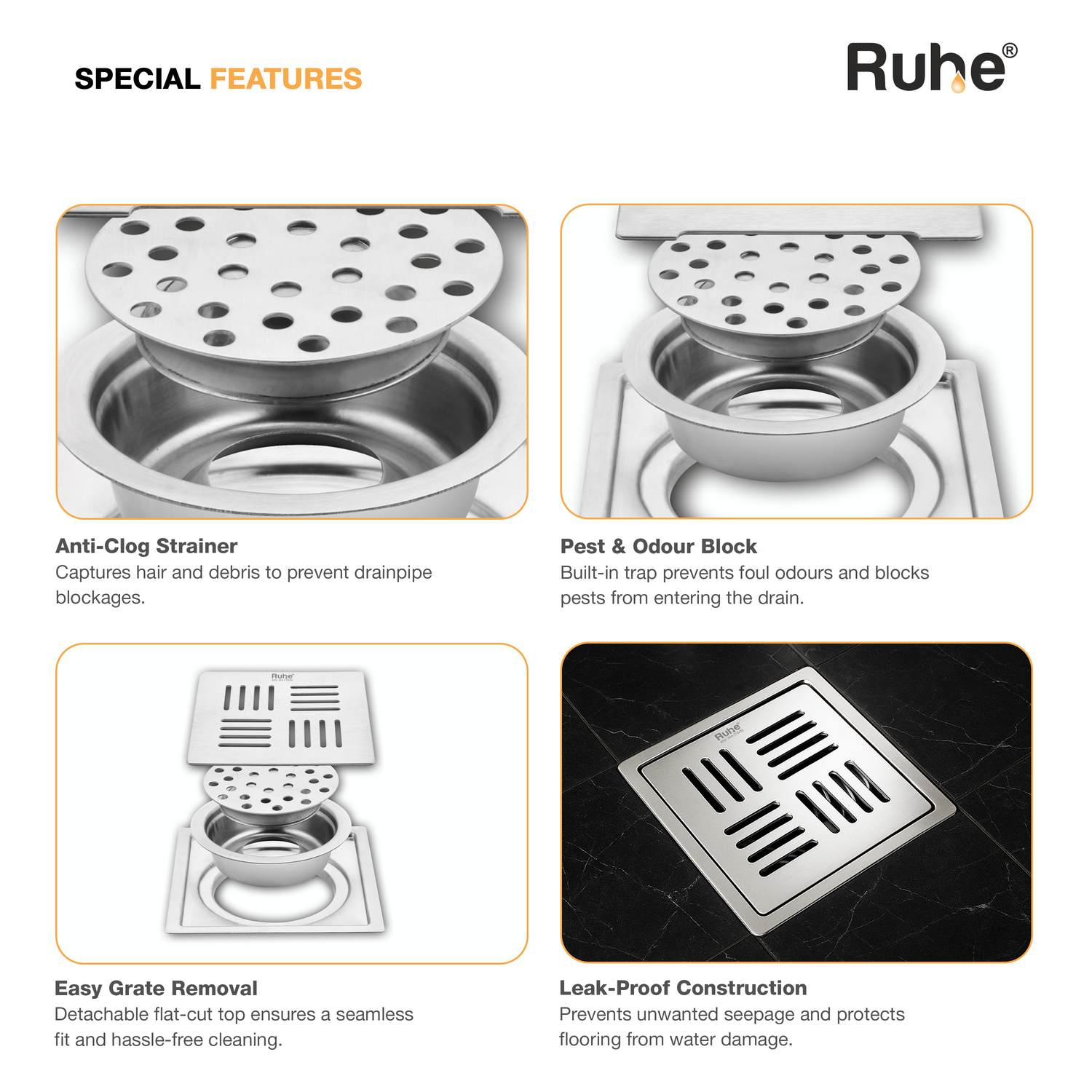 Ruhe Ruby Square Flat Cut Floor Drain is built with 1mm Thick 304-Grade Stainless Steel, has a Contemporary Grating Top/Jali, a cockroach trap for prevention of pests/blockages/odour and comes with 10 Years warranty.