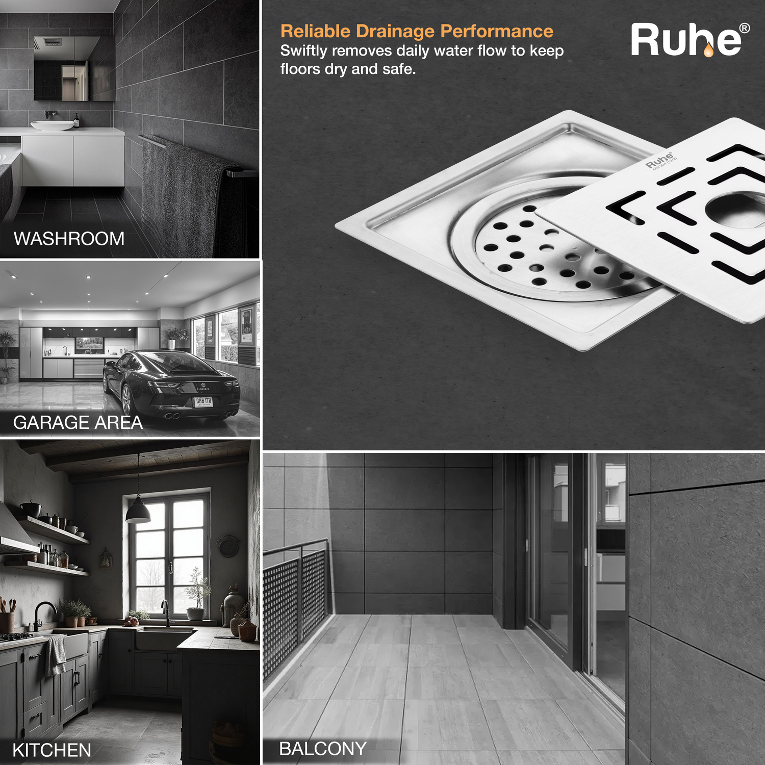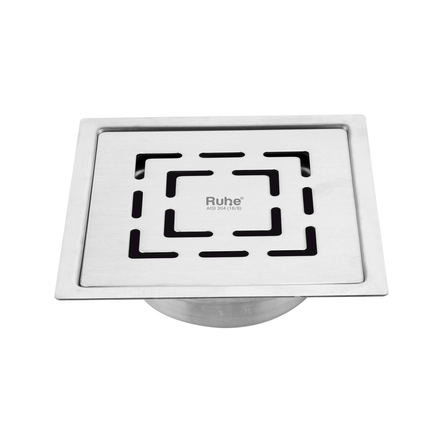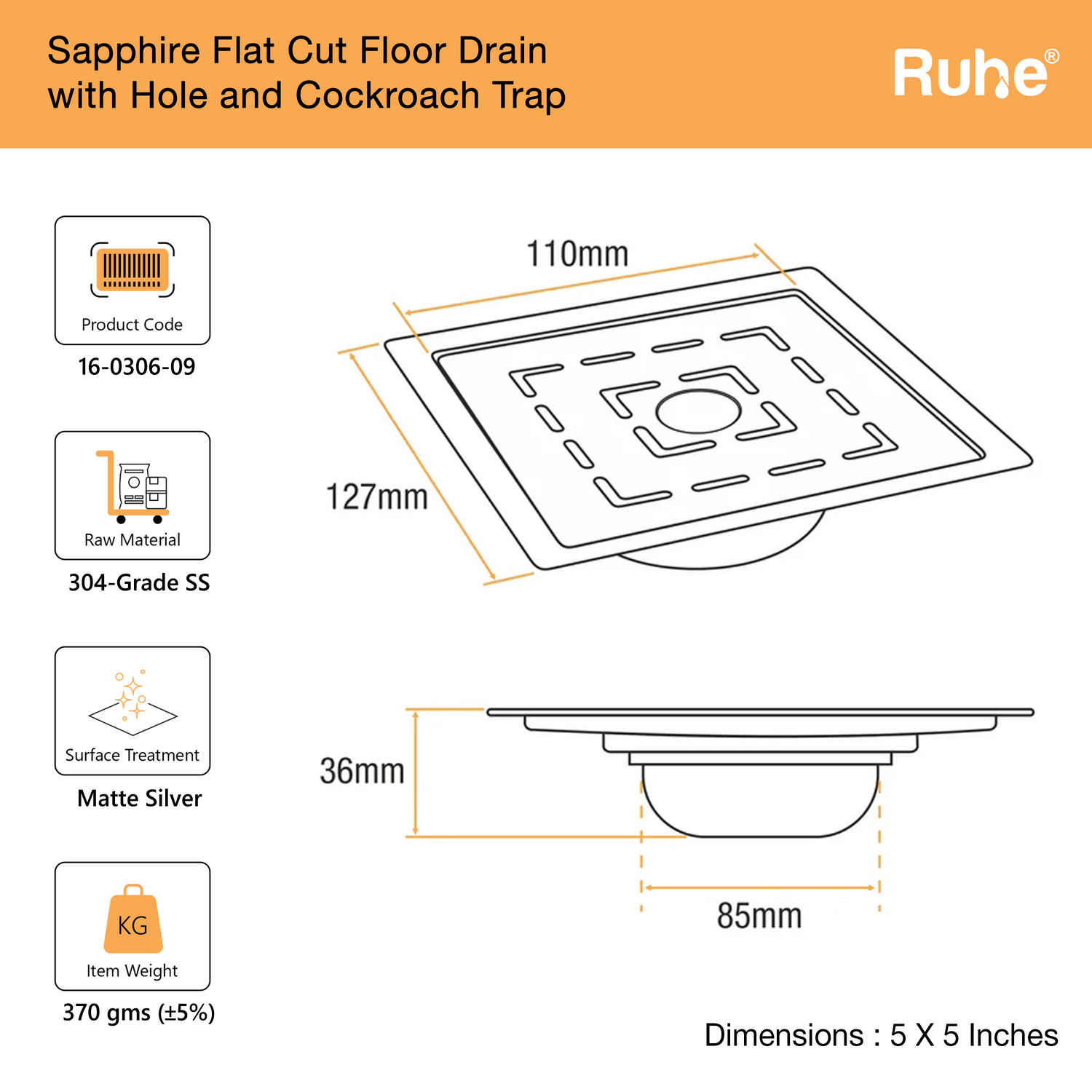 Sapphire Square Flat Cut 304-Grade Floor Drain with Cockroach Trap (5 x 5 Inches) - by Ruhe