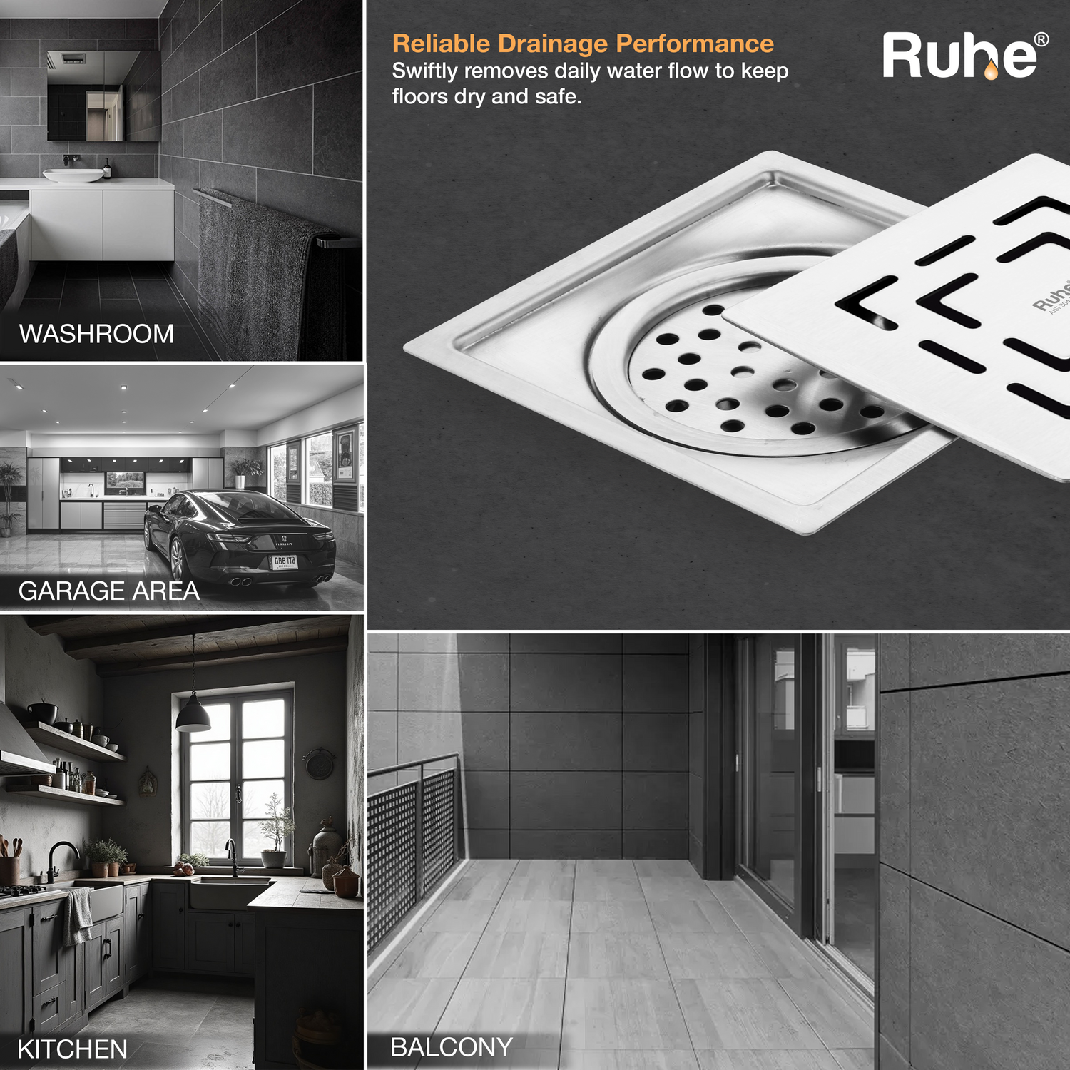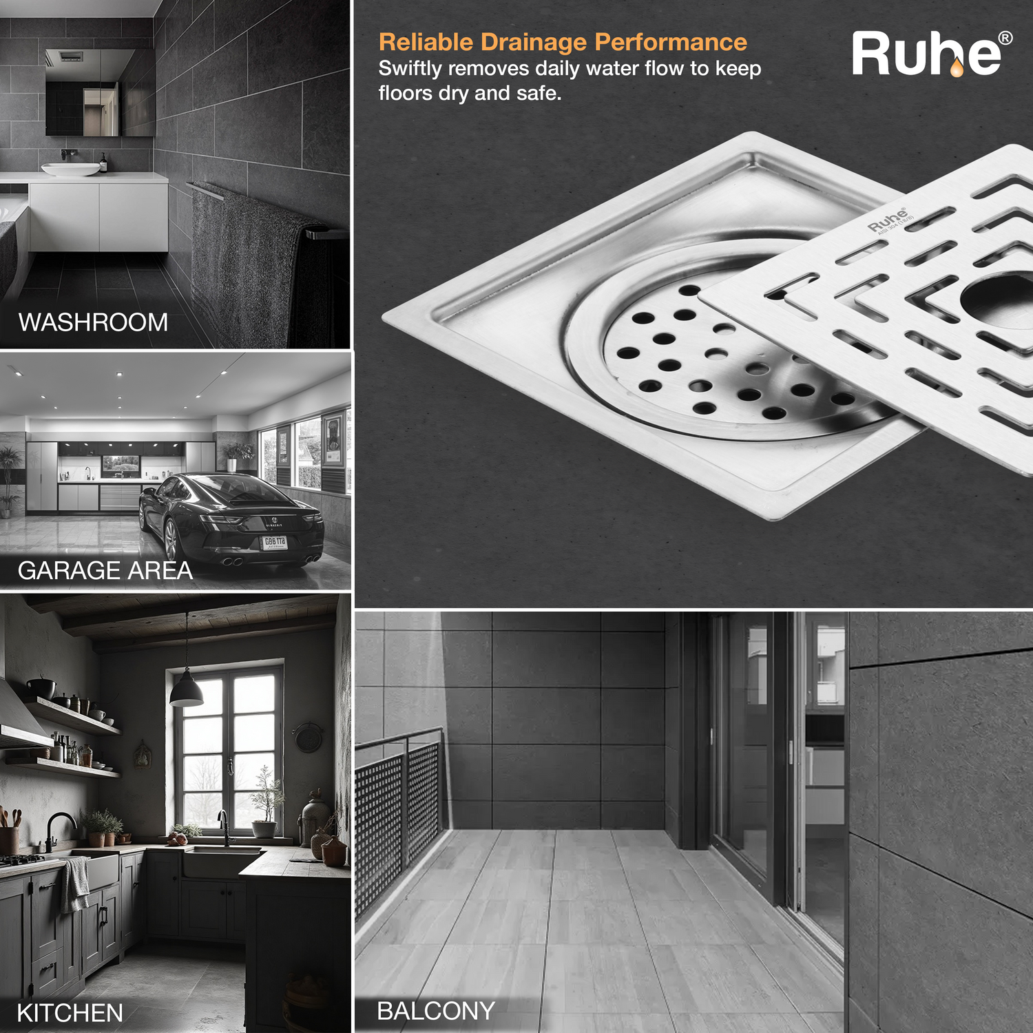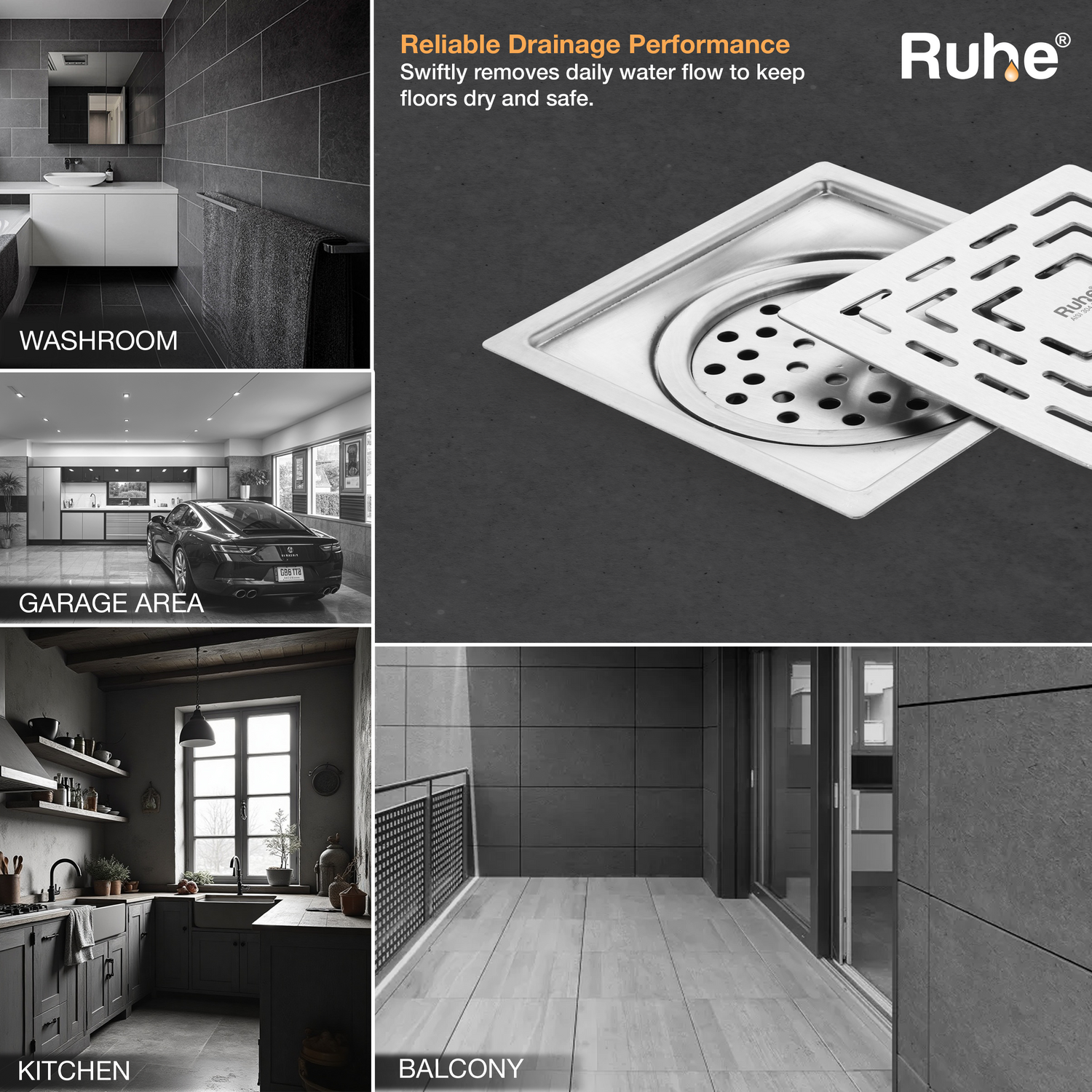 Sapphire Square Flat Cut 304-Grade Floor Drain with Cockroach Trap (5 x 5 Inches) - by Ruhe