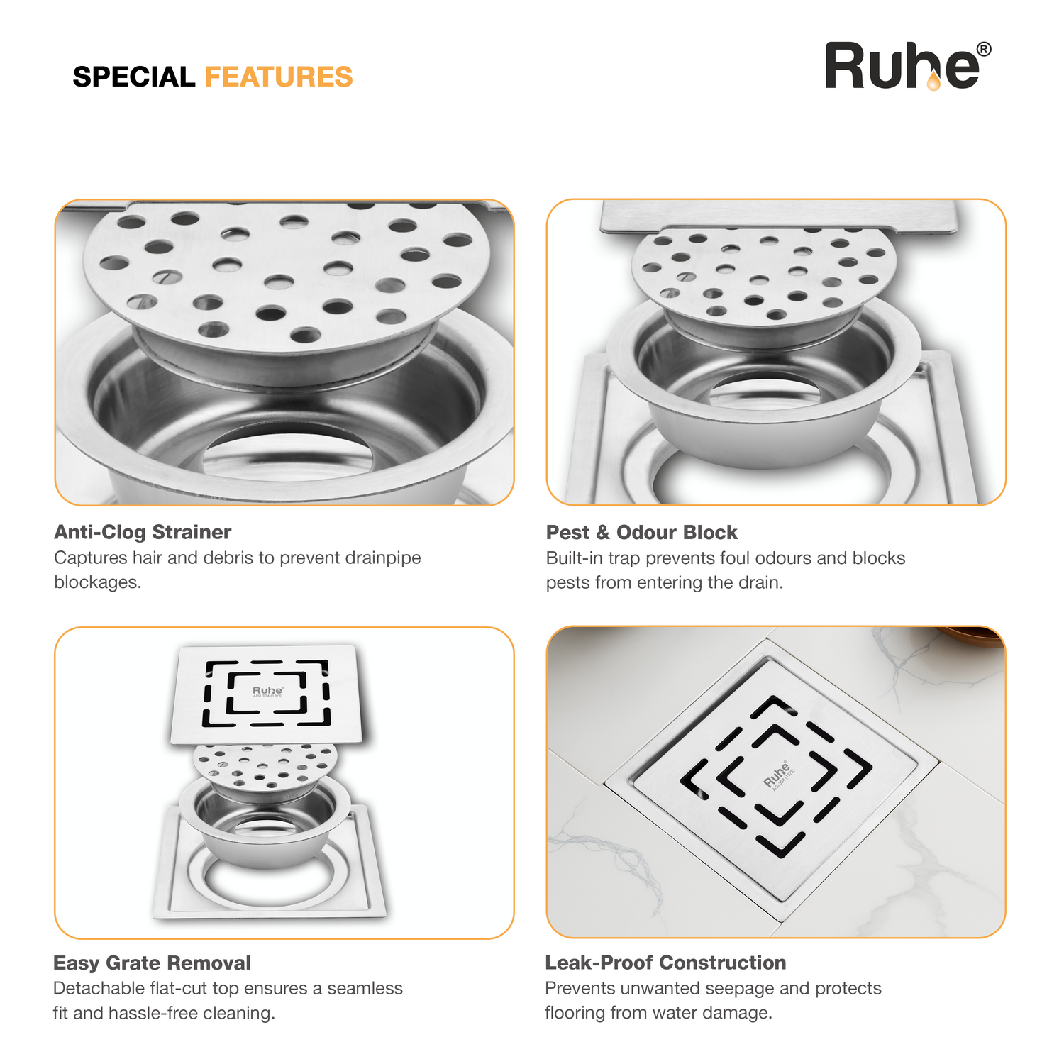 Made from 1.5 mm thick 304-grade stainless steel with a matte Silver finish, this floor drain ensures efficient drainage.