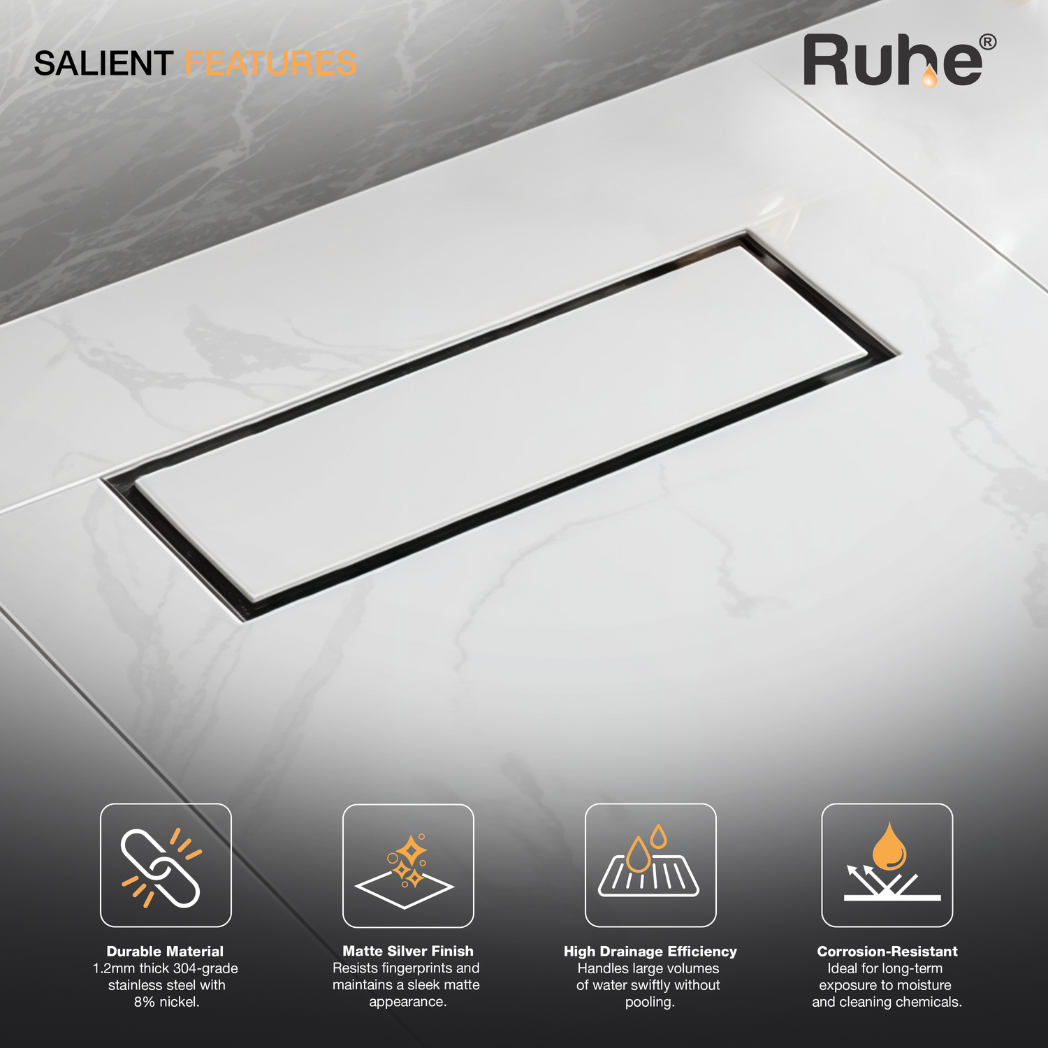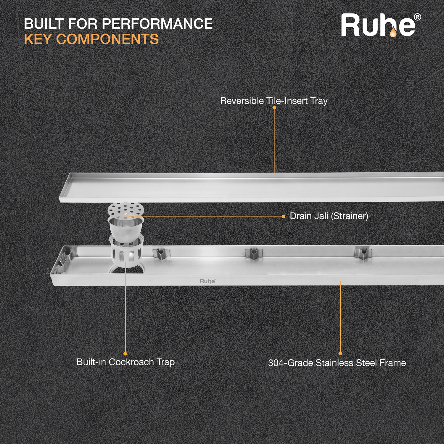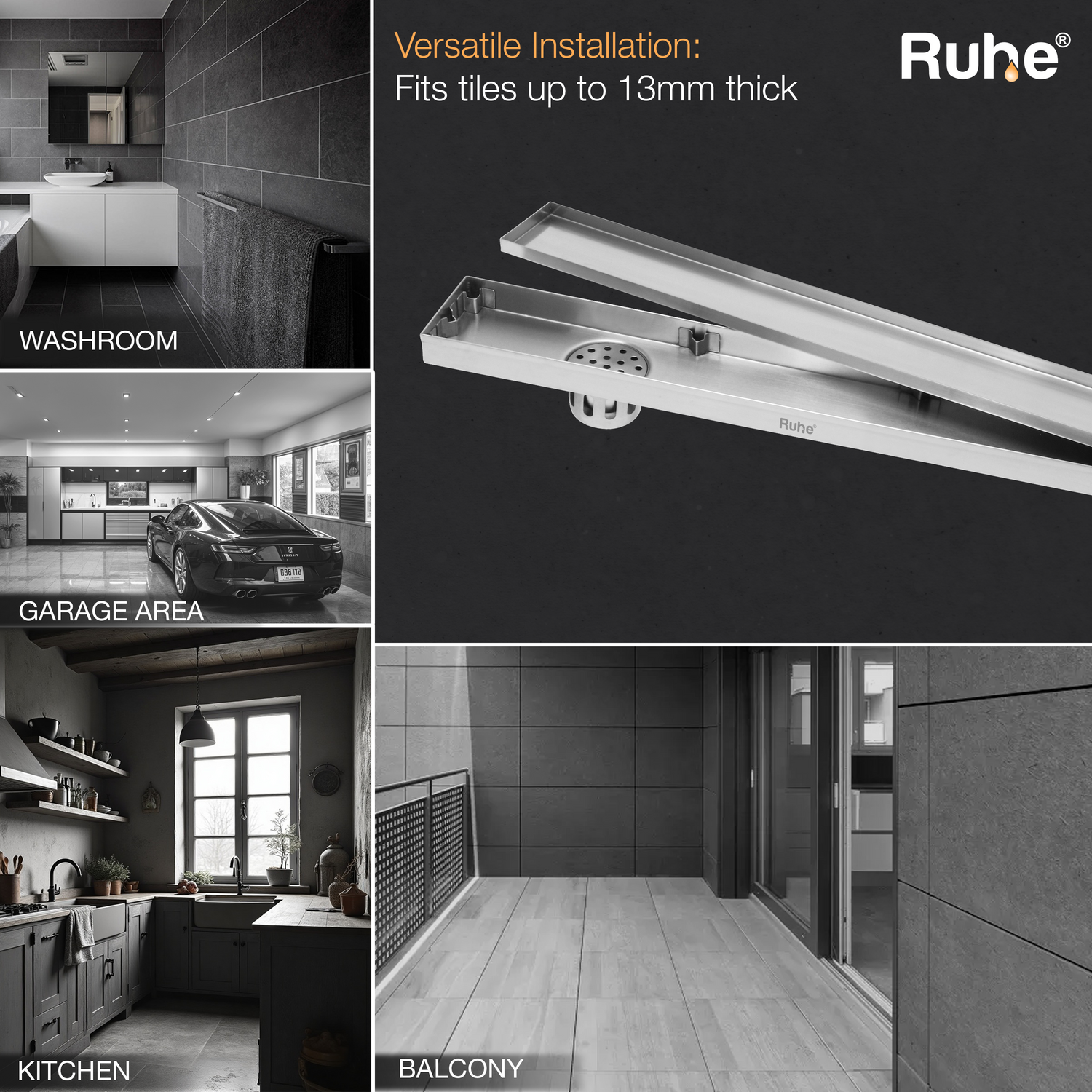 Ruhe Tile insert Shower Drain channels or Invisible Linear Floor Drains built with 1mm Thick 304-Grade Stainless Steel are meant to handle large volumes of water, offer a seamless look, are specially designed for tiles upto 13mm Thick, come with a drain frame, tray, cockroach trap and 10 years warranty.