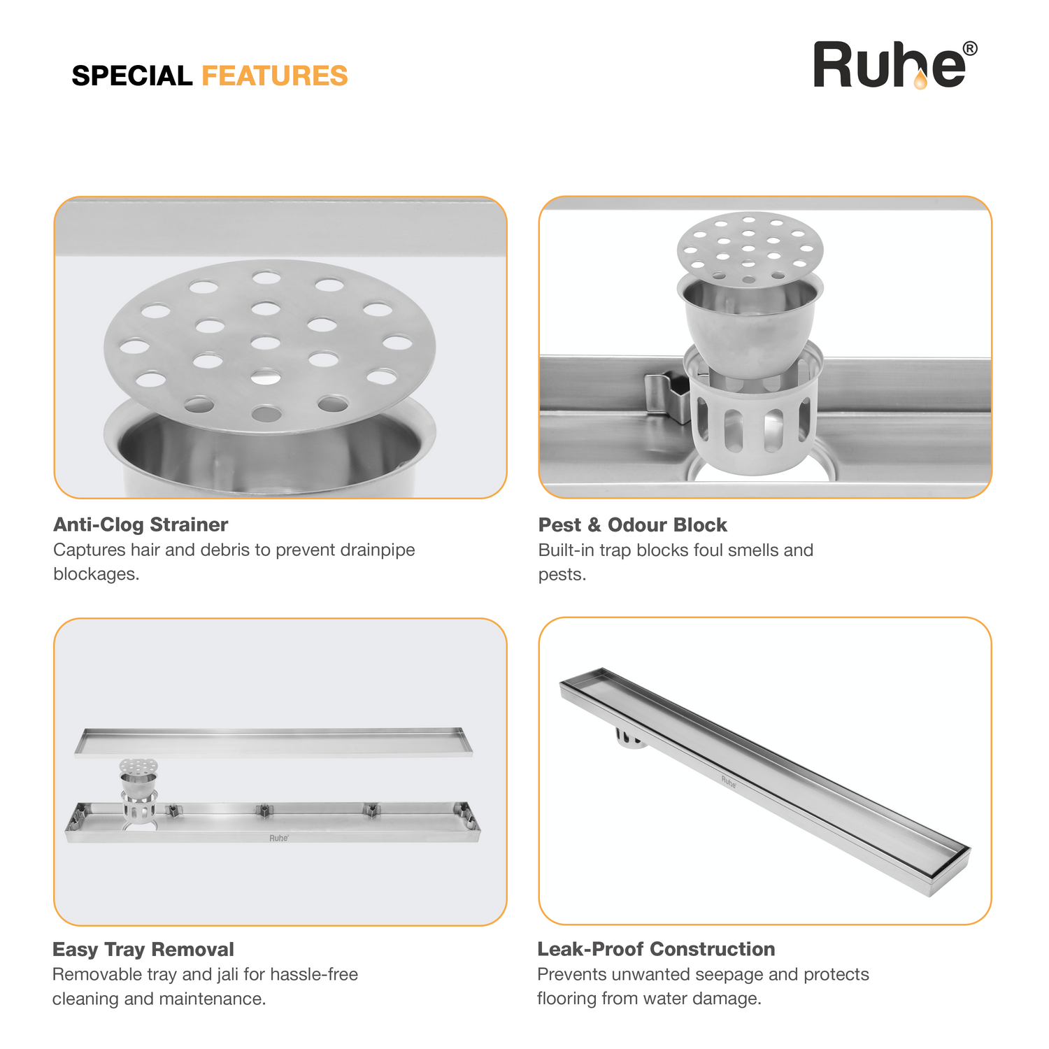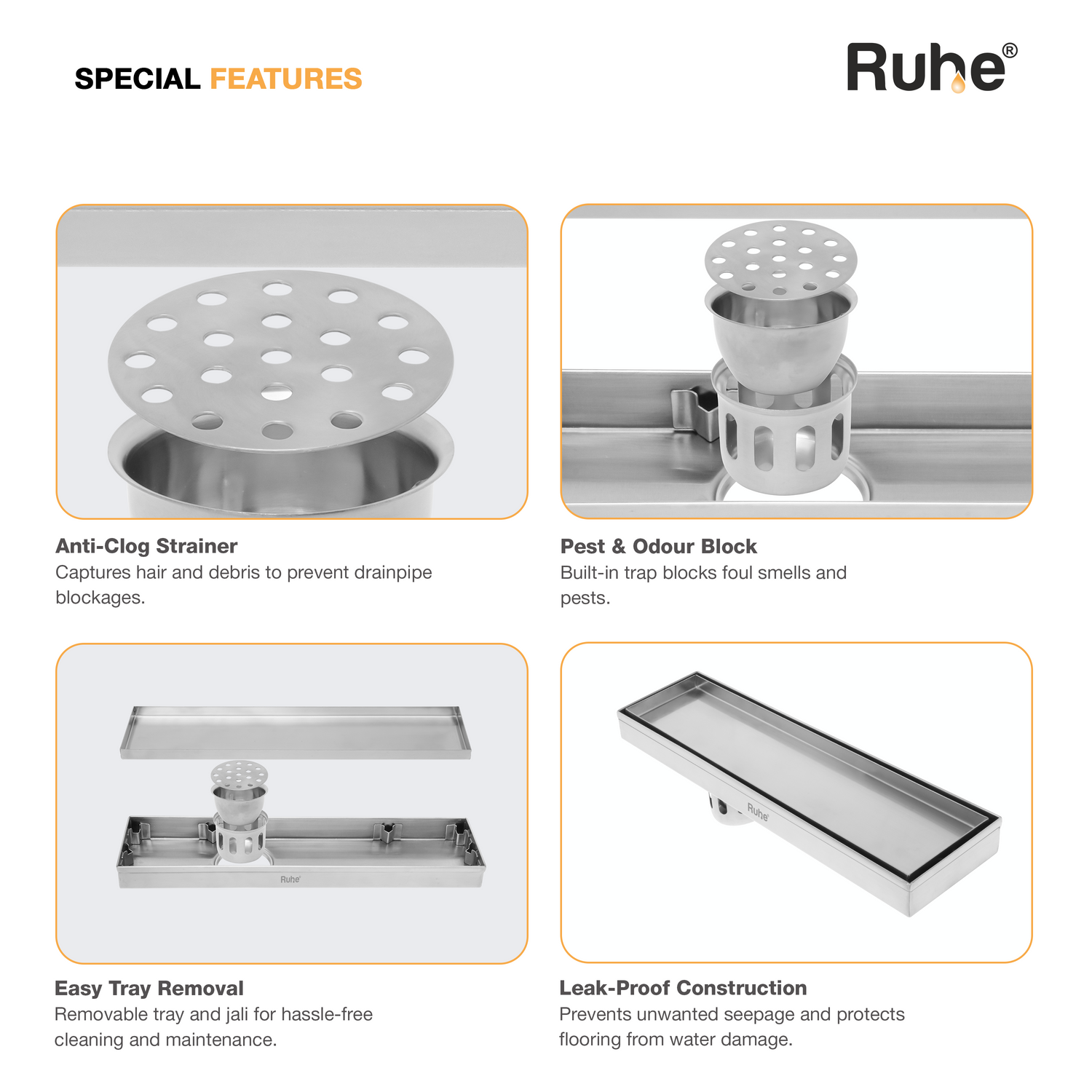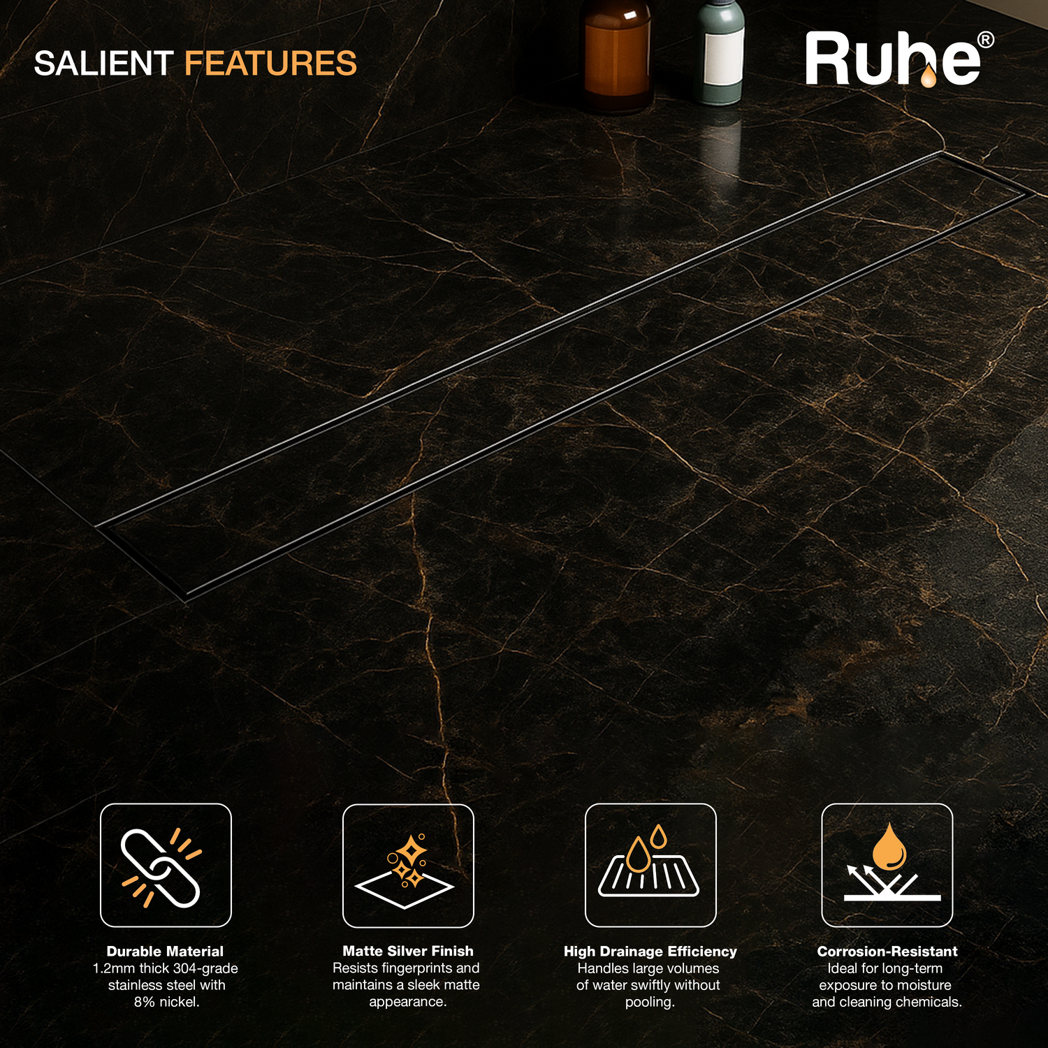 Ruhe Tile insert Shower Drain channels or Invisible Linear Floor Drains built with 1mm Thick 304-Grade Stainless Steel are meant to handle large volumes of water, offer a seamless look, are specially designed for tiles upto 13mm Thick, come with a drain frame, tray, cockroach trap and 10 years warranty.