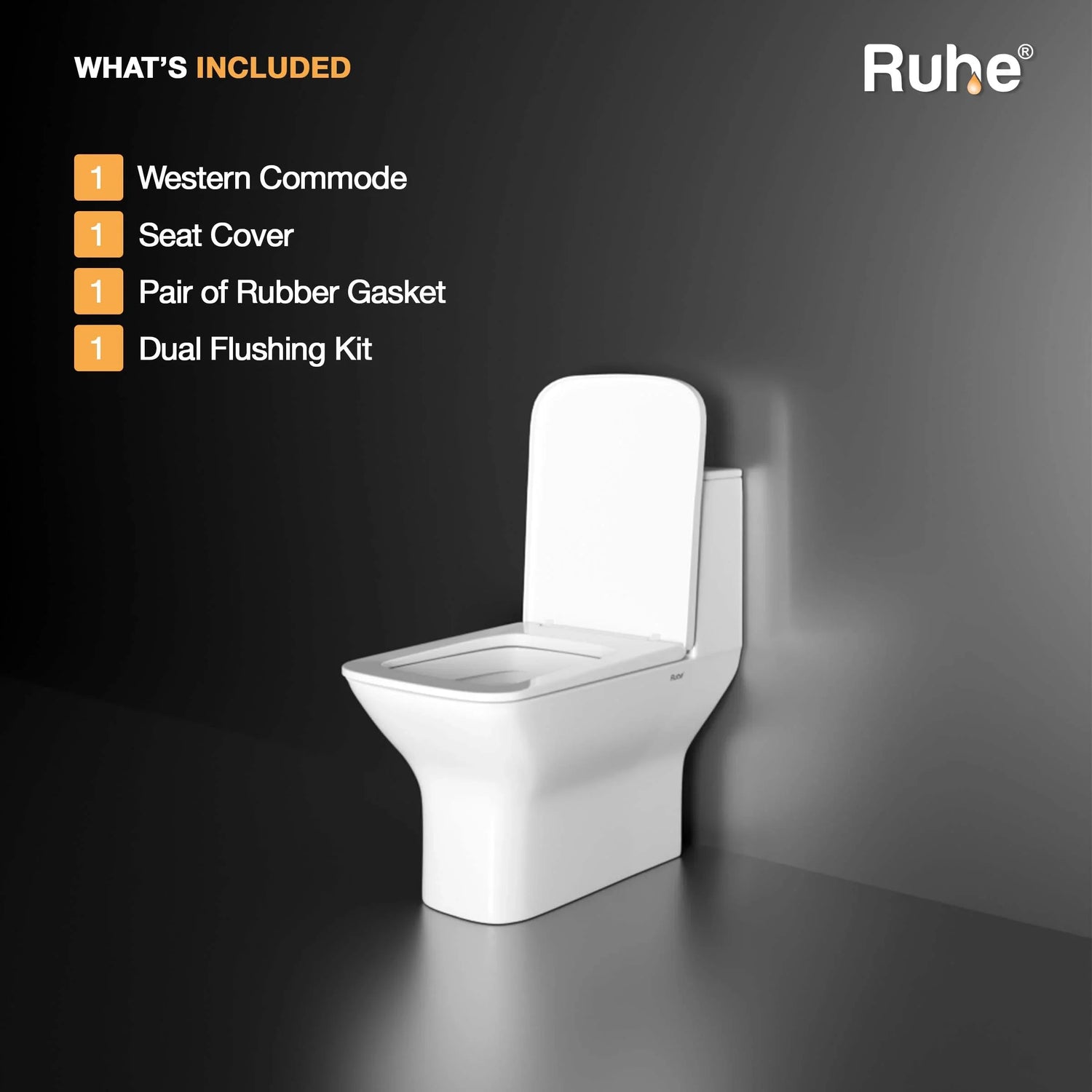 PACKAGE CONTENTS: The package includes 1 western commode, 1 seat cover, 1 Dual Flow Flushing Kit and 1 Gasket.