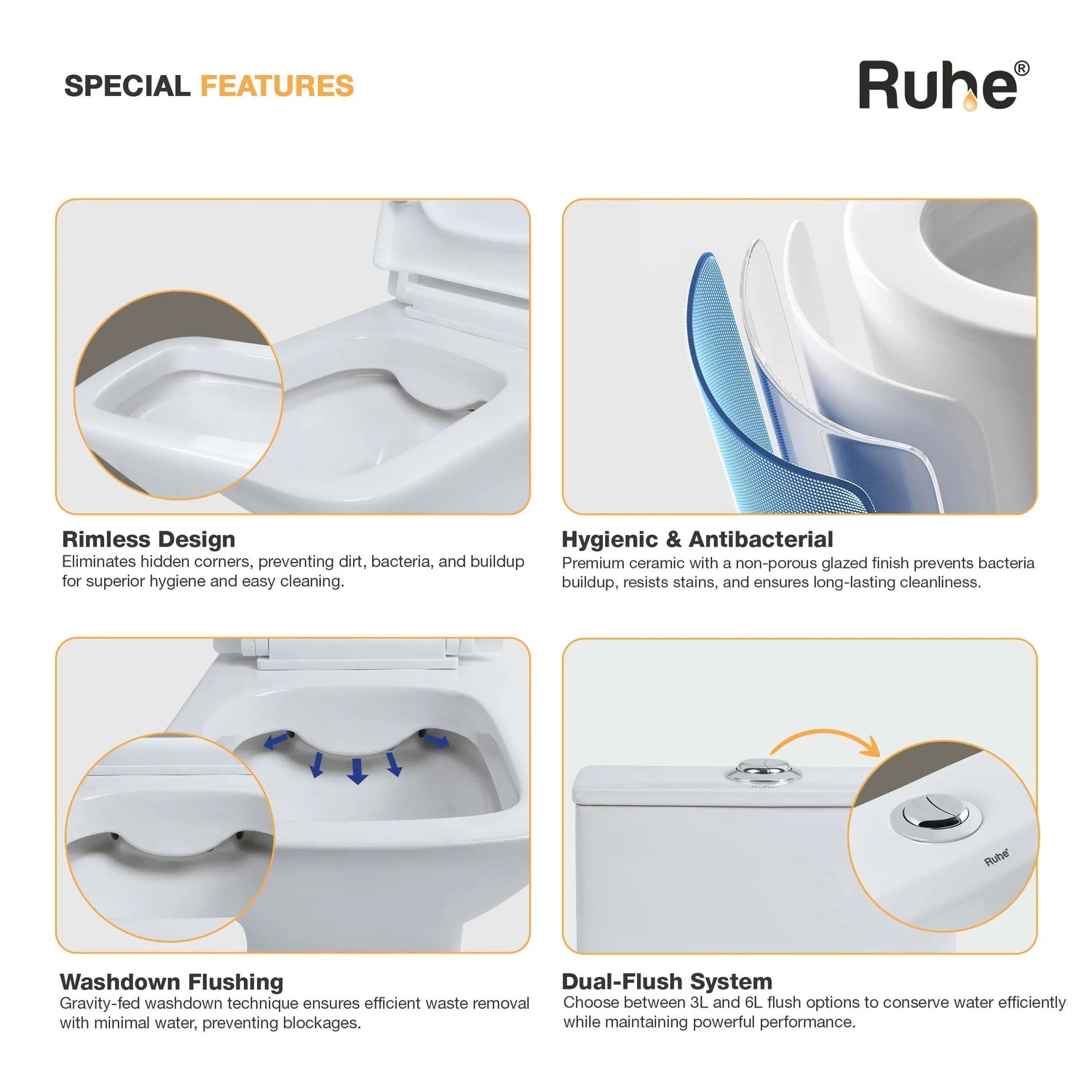 DUAL-FLUSH SYSTEM: Features two flush options—3 litres for liquid waste and 6 litres for solid waste—allowing users to conserve water efficiently without compromising performance.