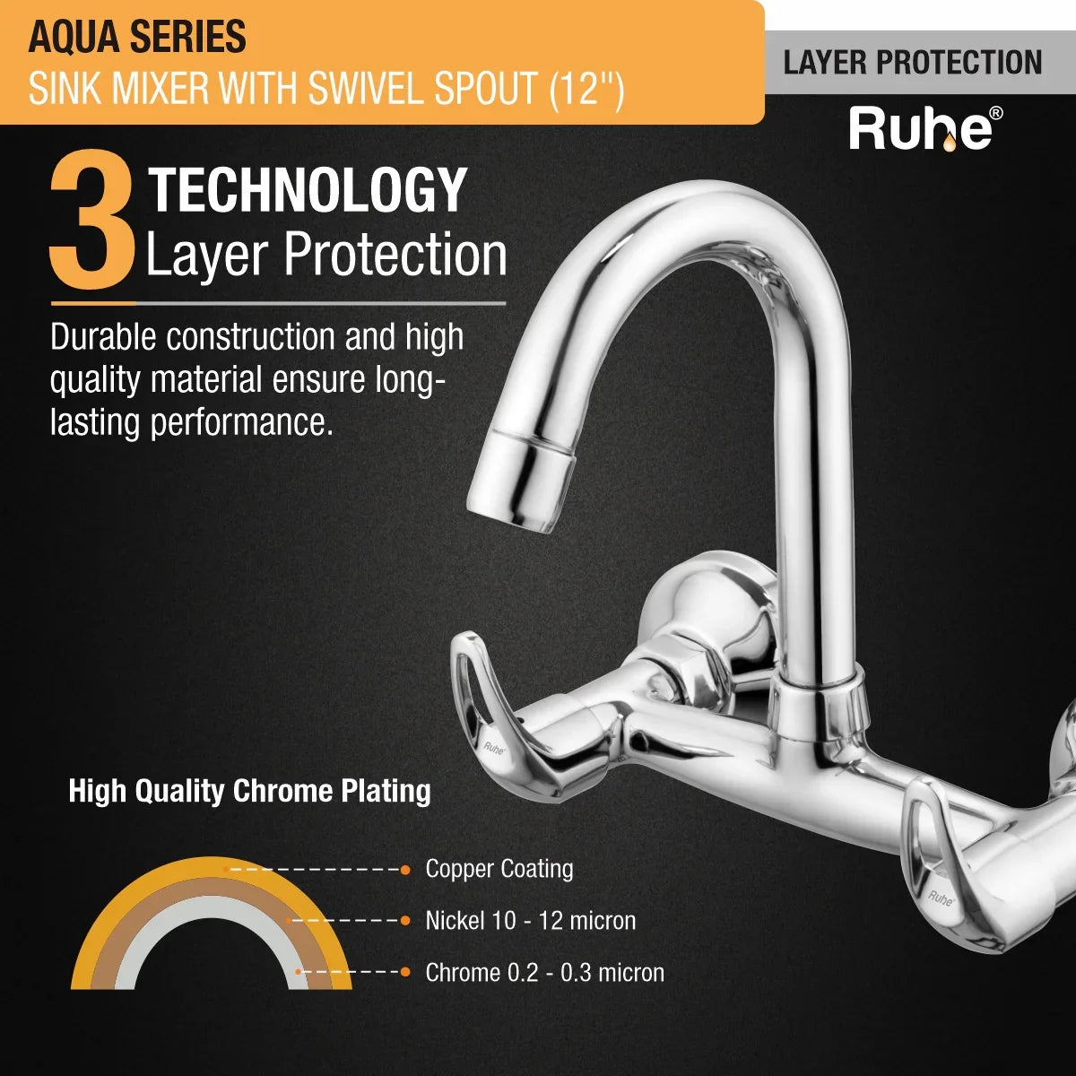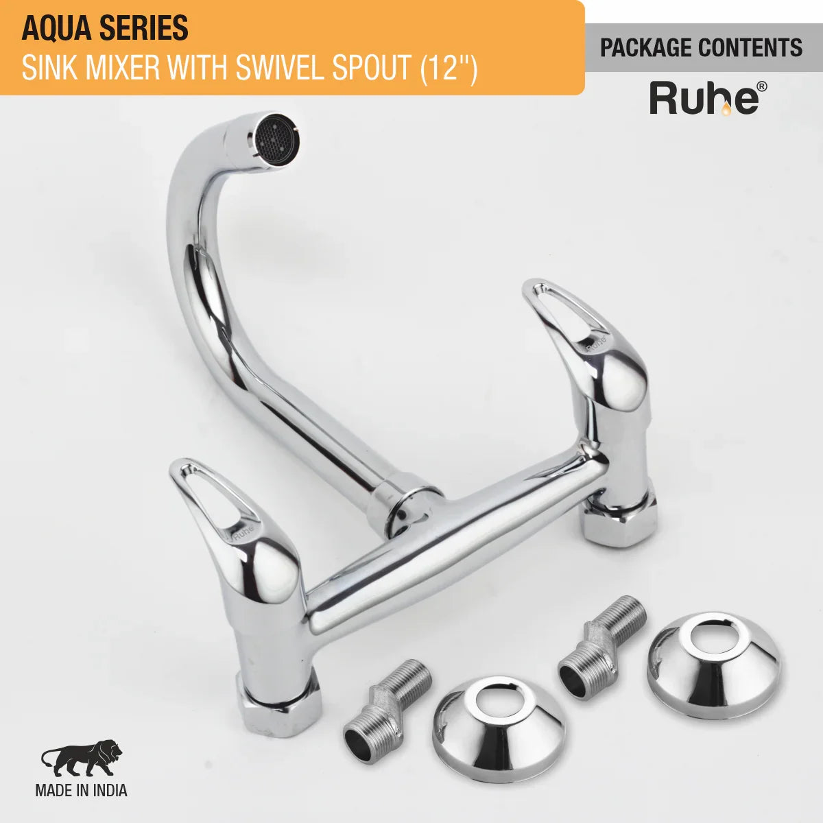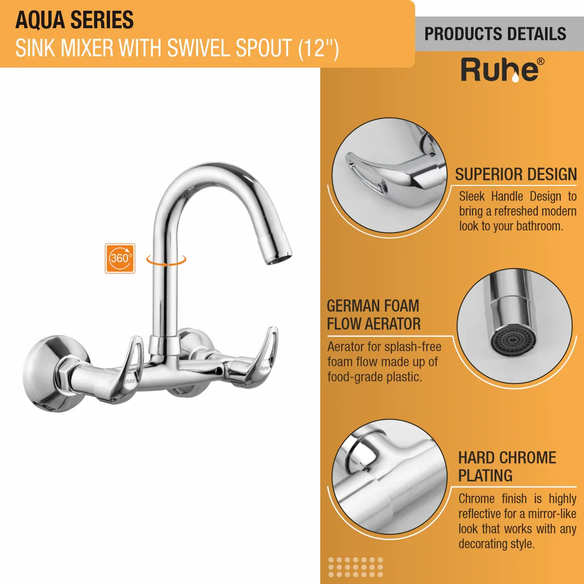 RUHE Sink Mixer with Round Swivel Spout Faucet from its Aqua collection is meant especially for wall mount installations for sinks/basins, and has a 360° rotating 12 inches small round spout that enables you to control the direction of the water flow, and allows you to mix hot and cold water.