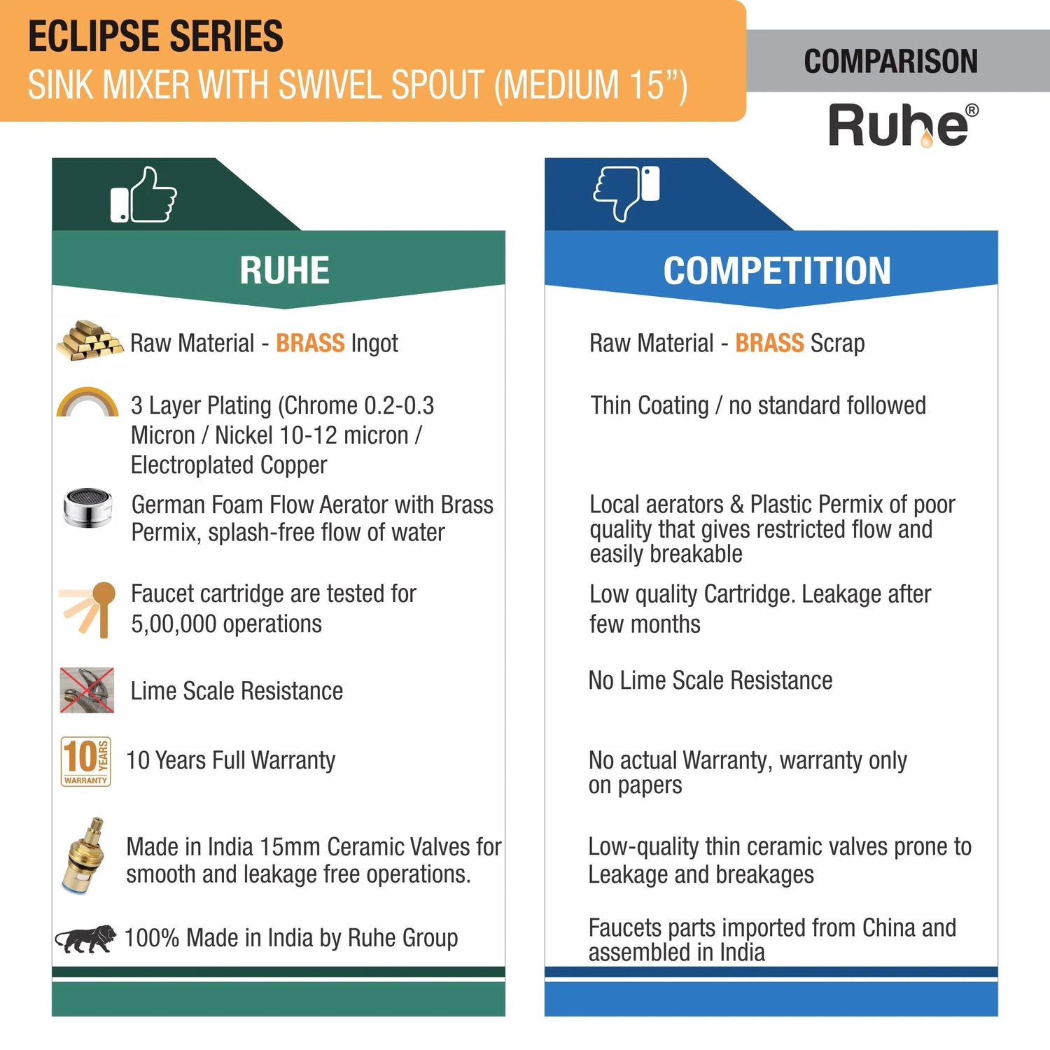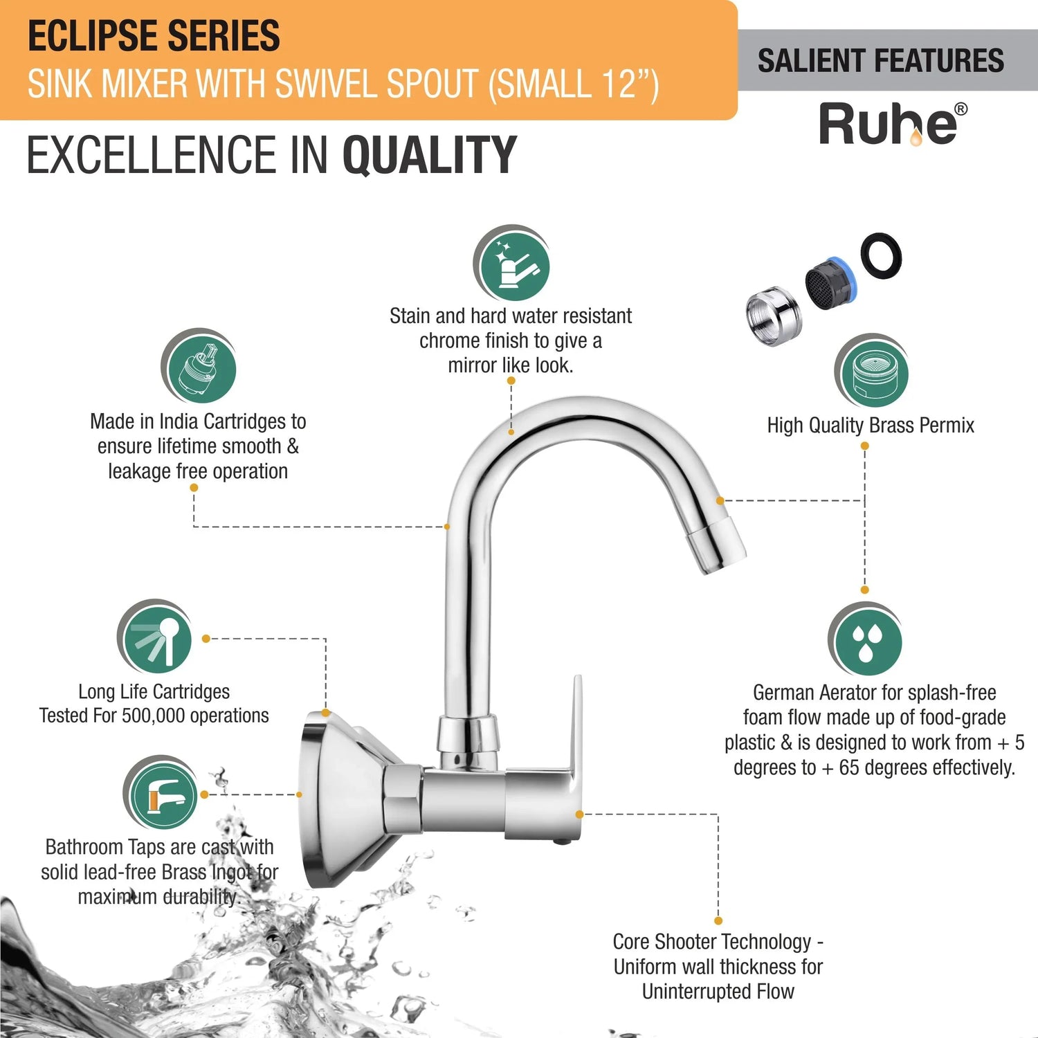 RUHE Sink Mixer with Round Swivel Spout Faucet from its Eclipse collection is meant especially for wall mount installations for sinks/basins, and has a 360° rotating 7 inches small round spout that enables you to control the direction of the water flow, and allows you to mix hot and cold water.