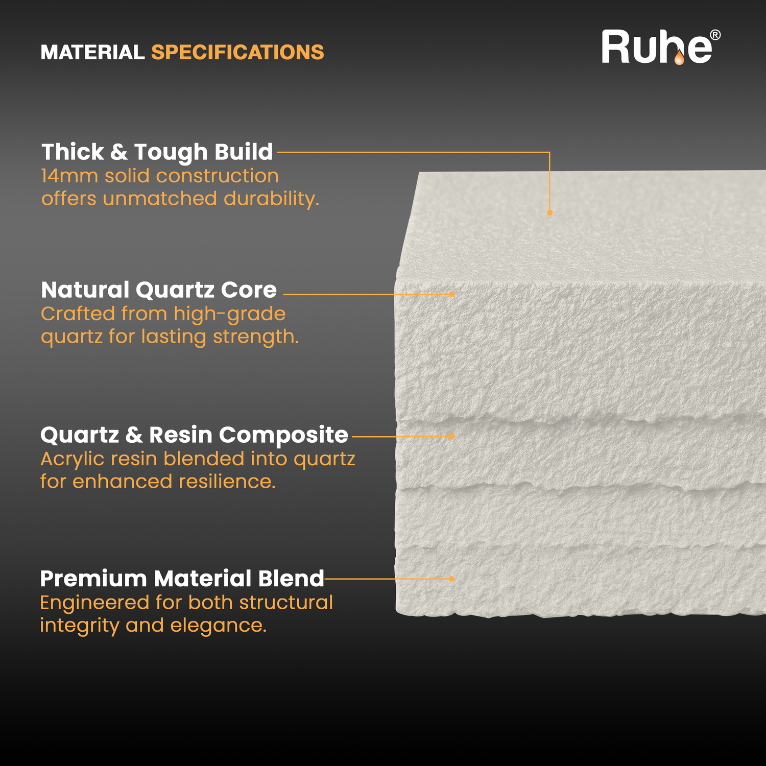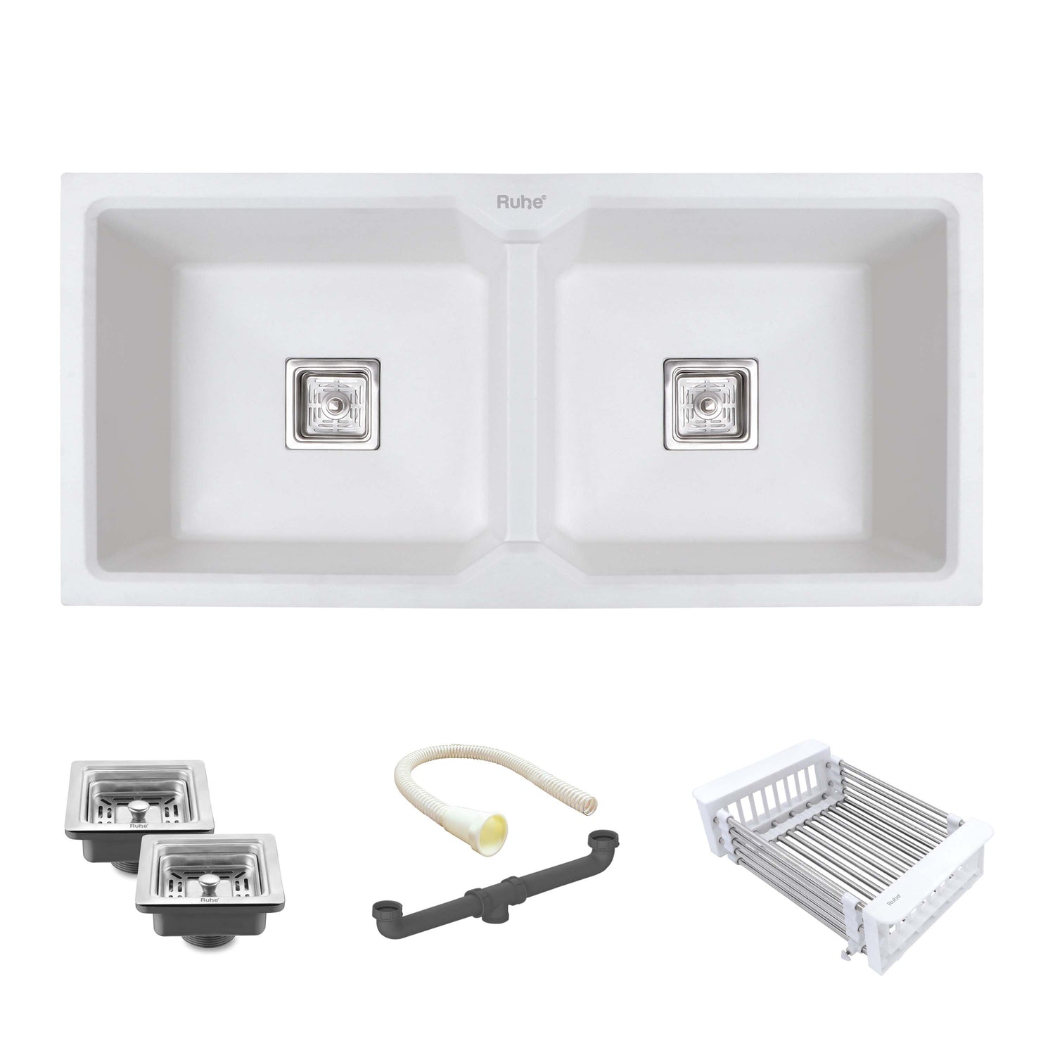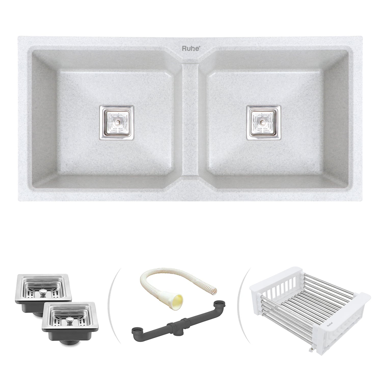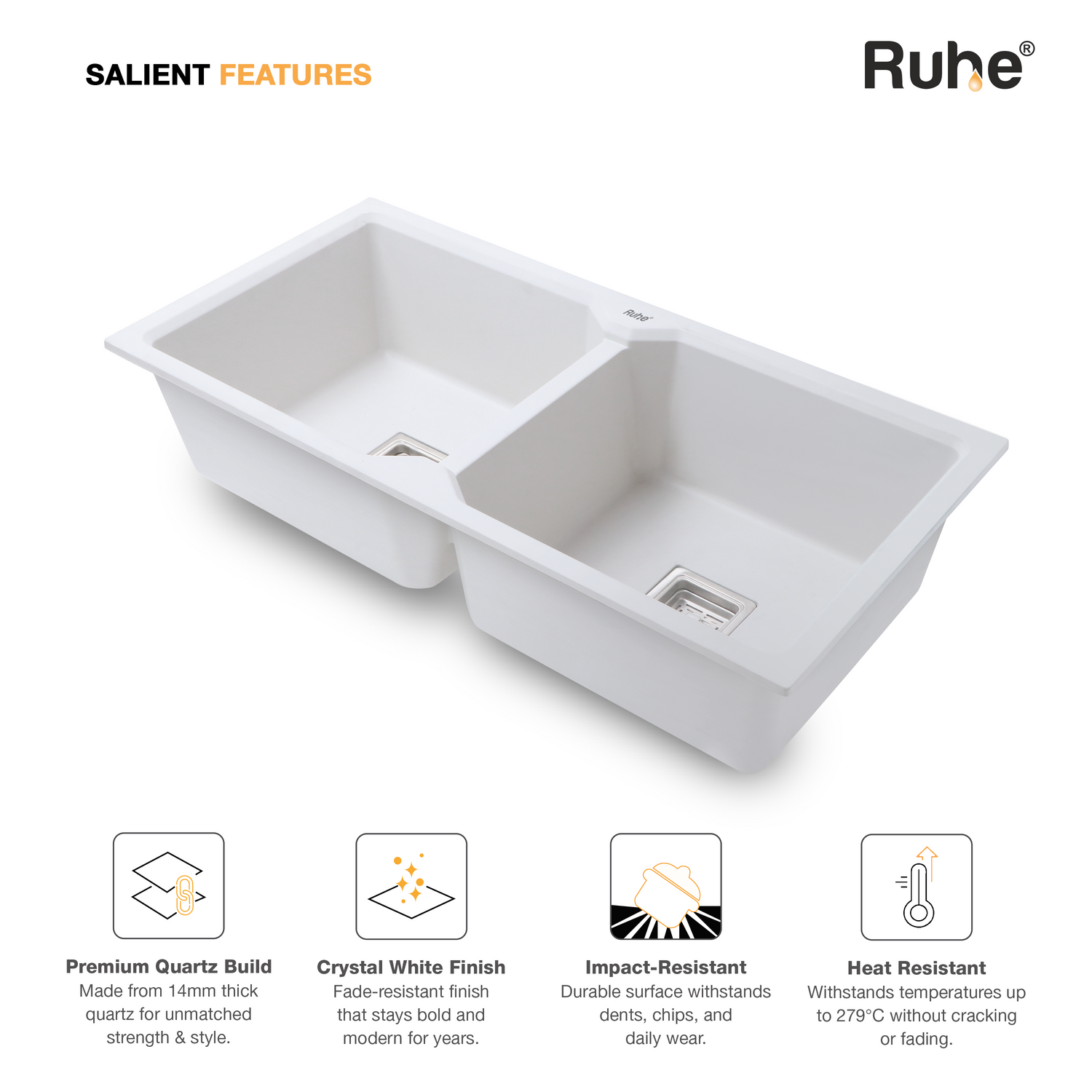 Crafted from 14mm thick quartz and resin, this sink combines a double-bowl design for efficient multitasking and a pristine Crystal White finish.