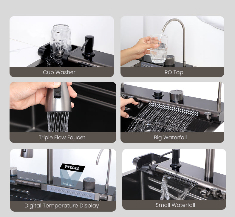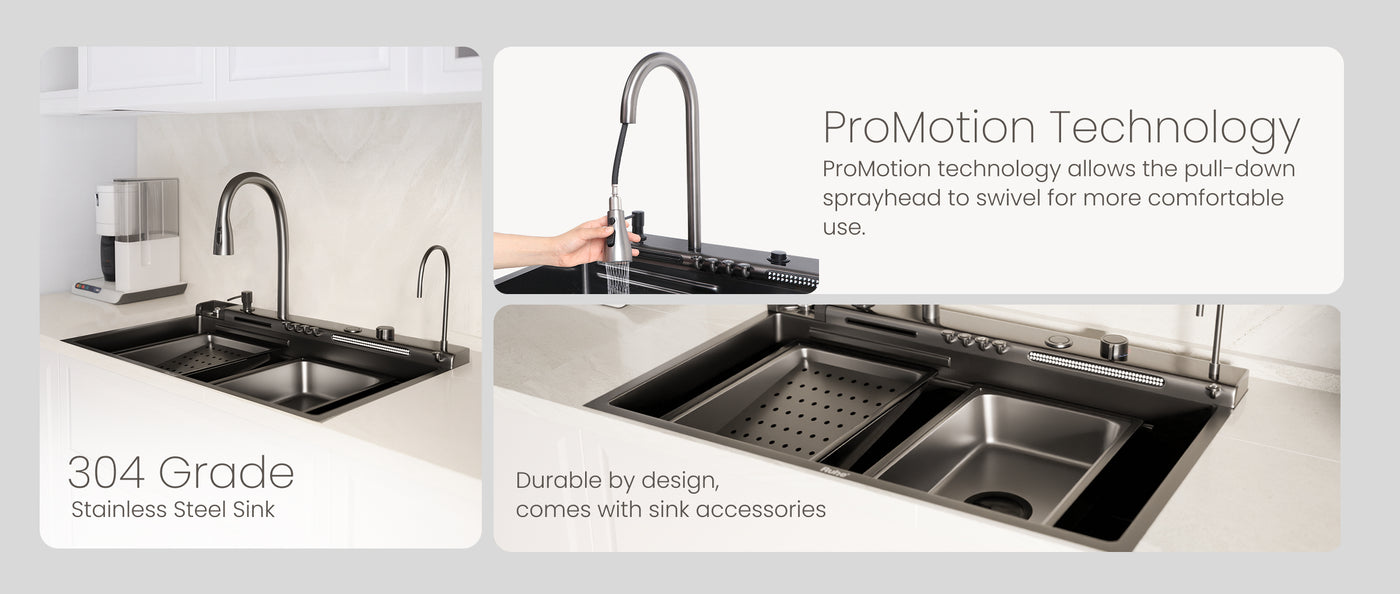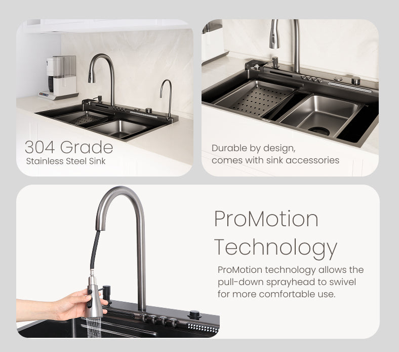 Opera Black 304-Grade SS Smart Kitchen Sink with Integrated Waterfalls, Digital Display, Pull-Out &