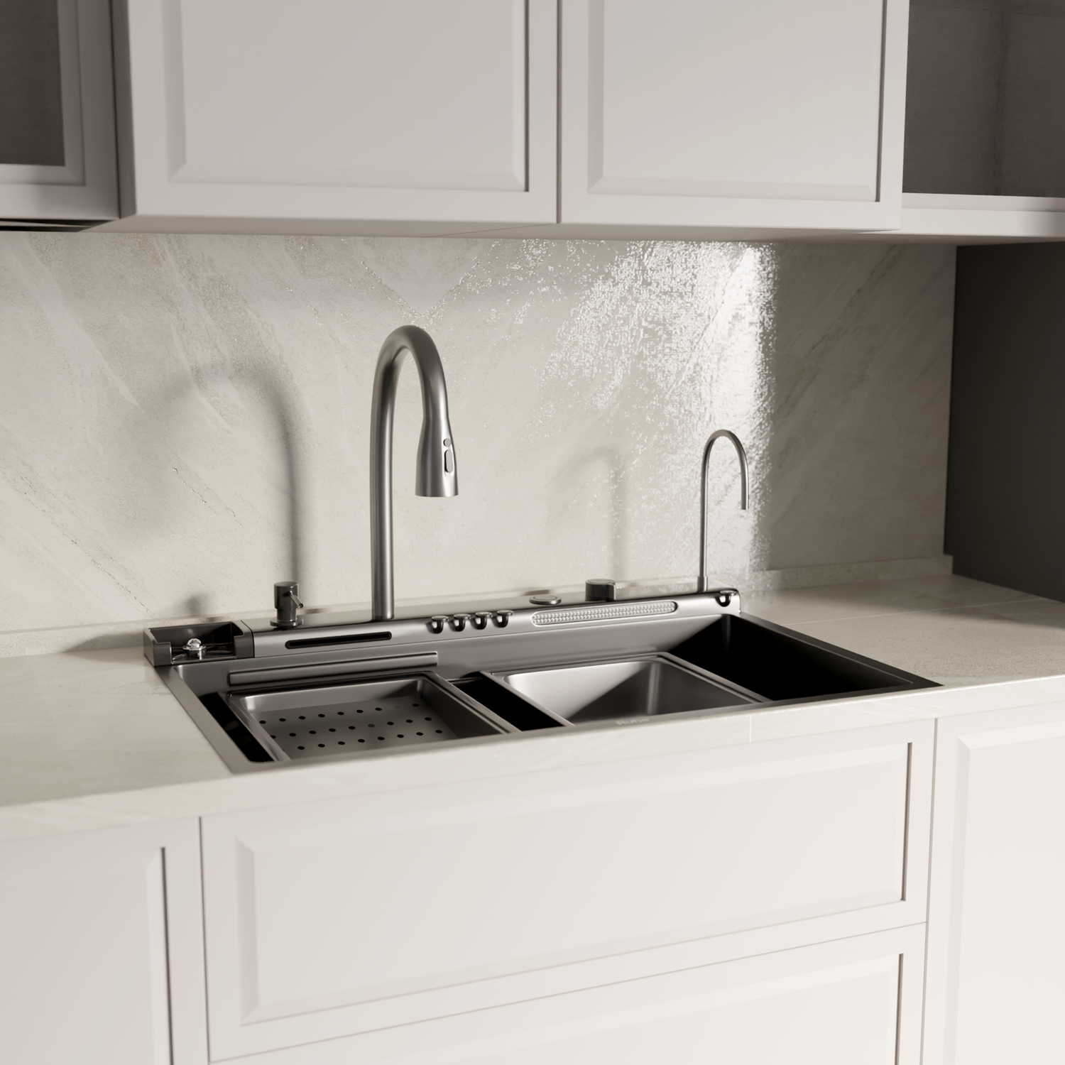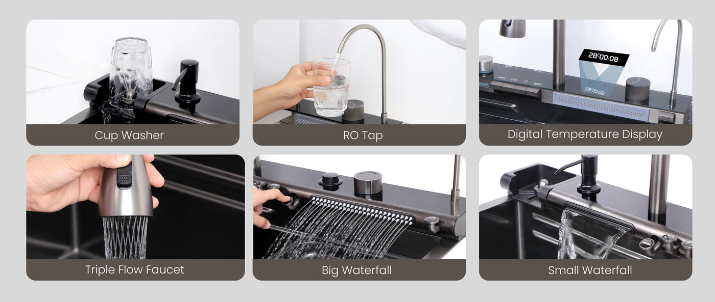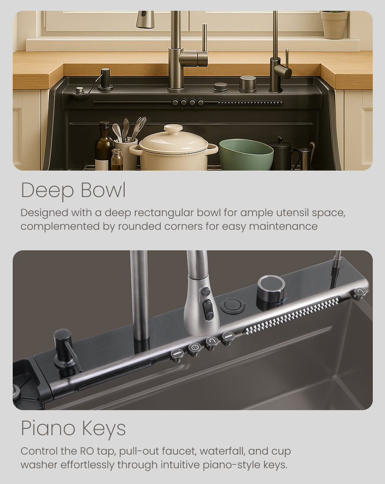 ROUND PIANO BUTTONS: Intuitively designed circular piano-style control buttons for effortless activation of built-in sink functions, including the RO tap, pull-out faucet, dual waterfall outlets, and automatic cup washer.