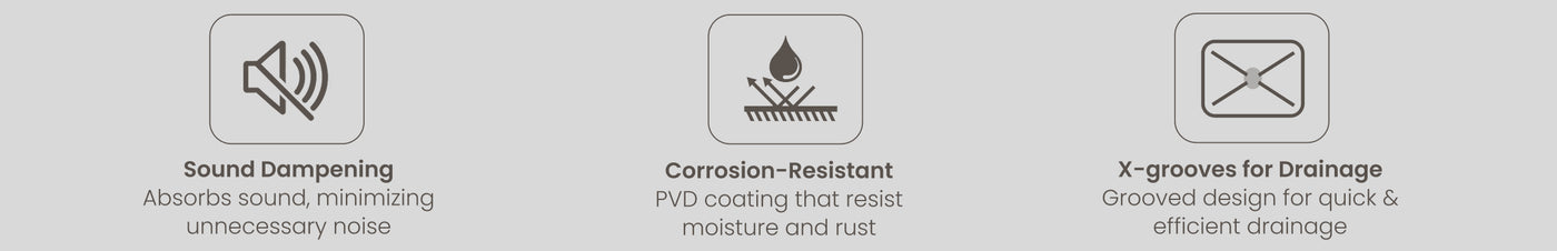 SOUND-ABSORPTION: Fitted with sound-dampening rubber pads and a waterproof noise-absorbing coating to minimize the sound of running water and utensil clatter.