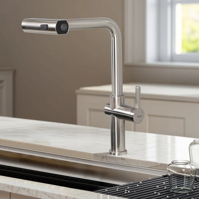 SELF-RETRACTING PULL-OUT SPRAYER: Includes a detachable pre-rinse head for enhanced functionality and ease of use, and smoothly returns to its original position after every use for a clean, clutter-free sink.