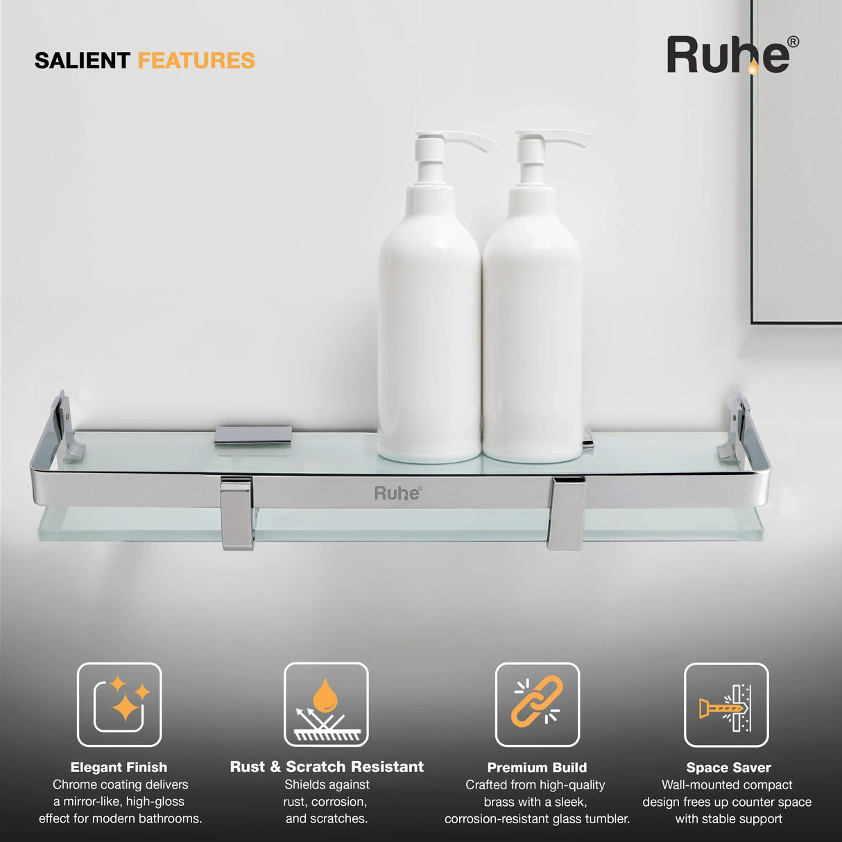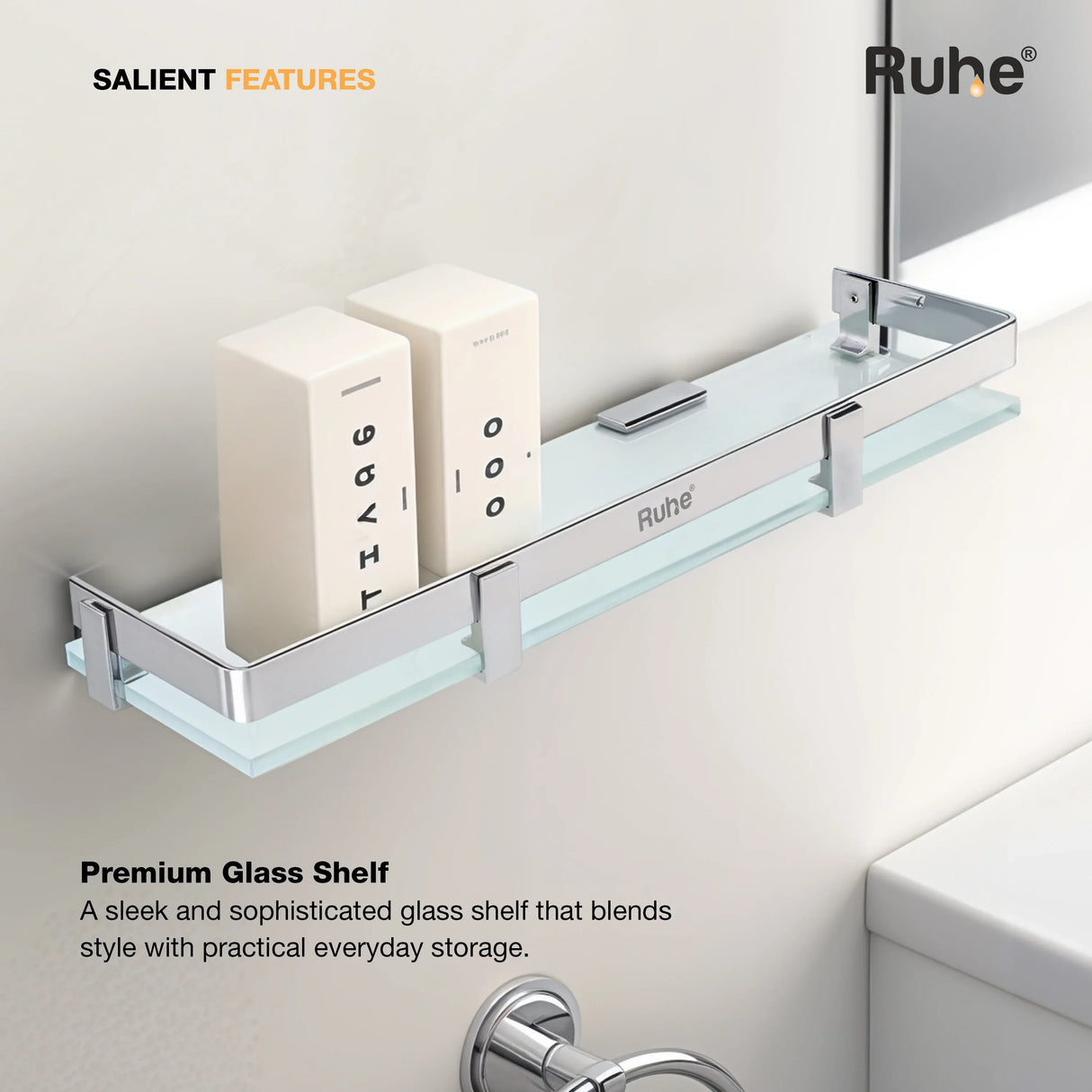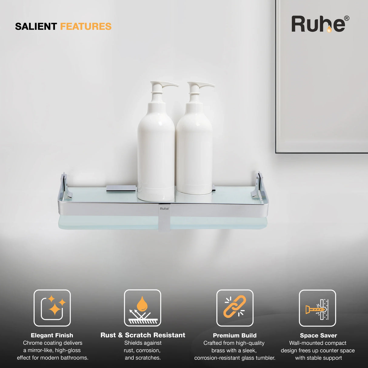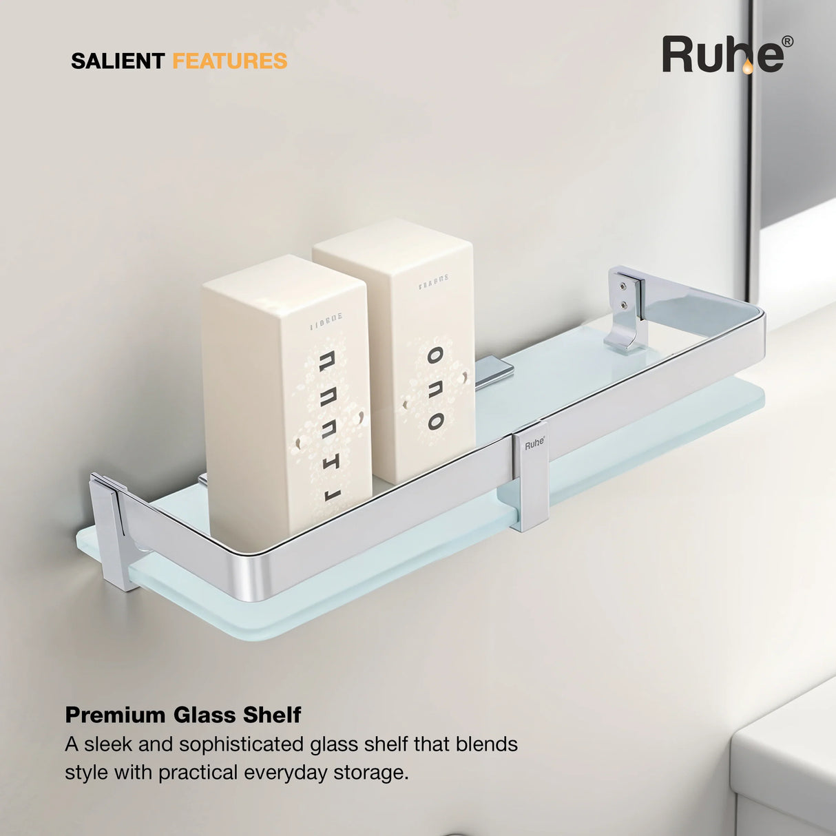FINISH: A sleek chrome finish on high-grade brass pairs elegantly with the frosted glass shelf, bringing a modern, minimalist aesthetic to any bathroom.
