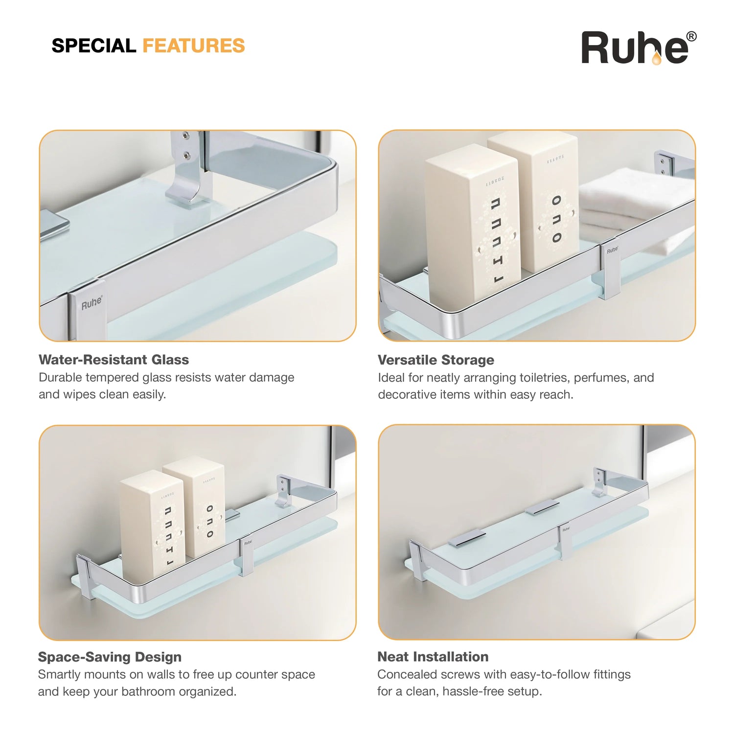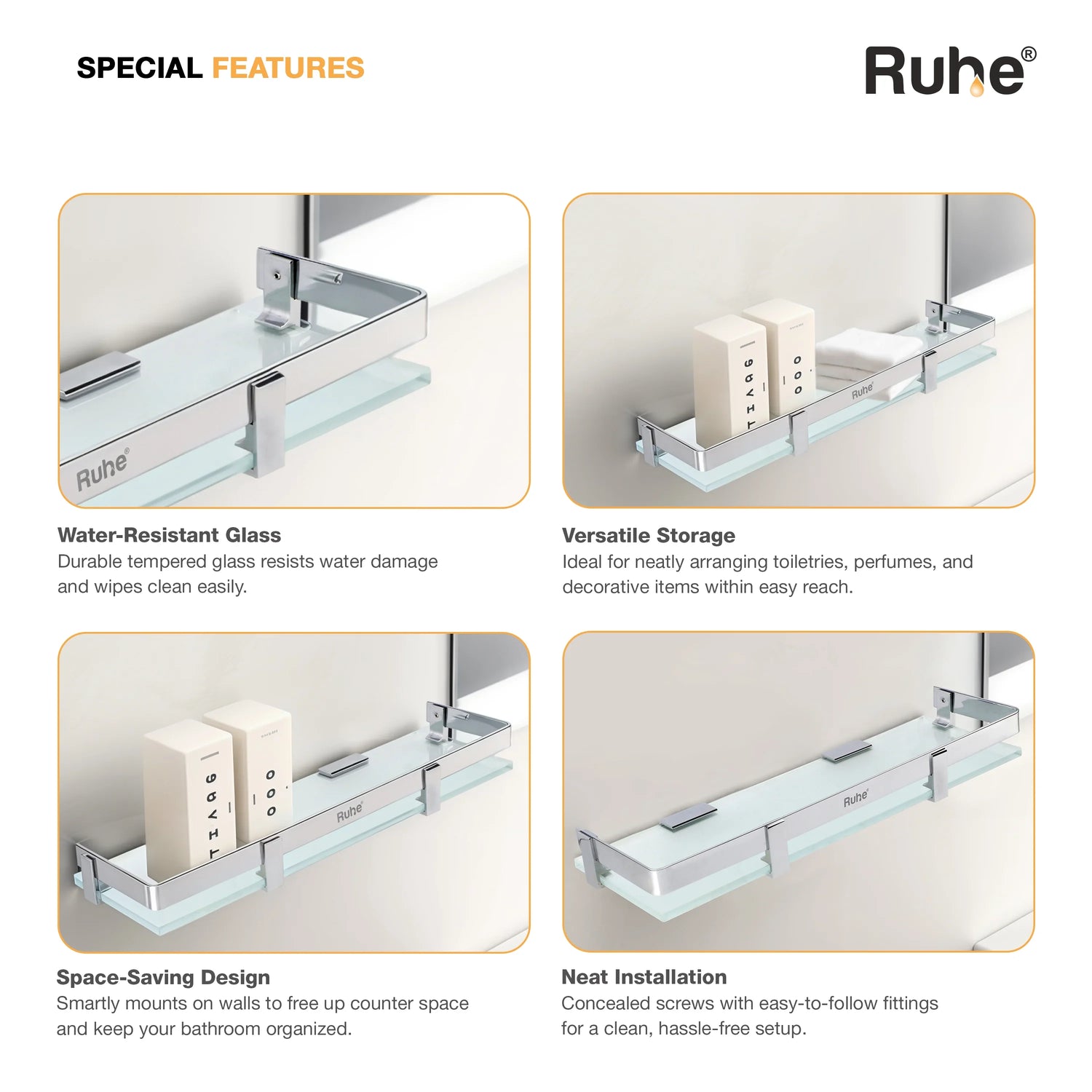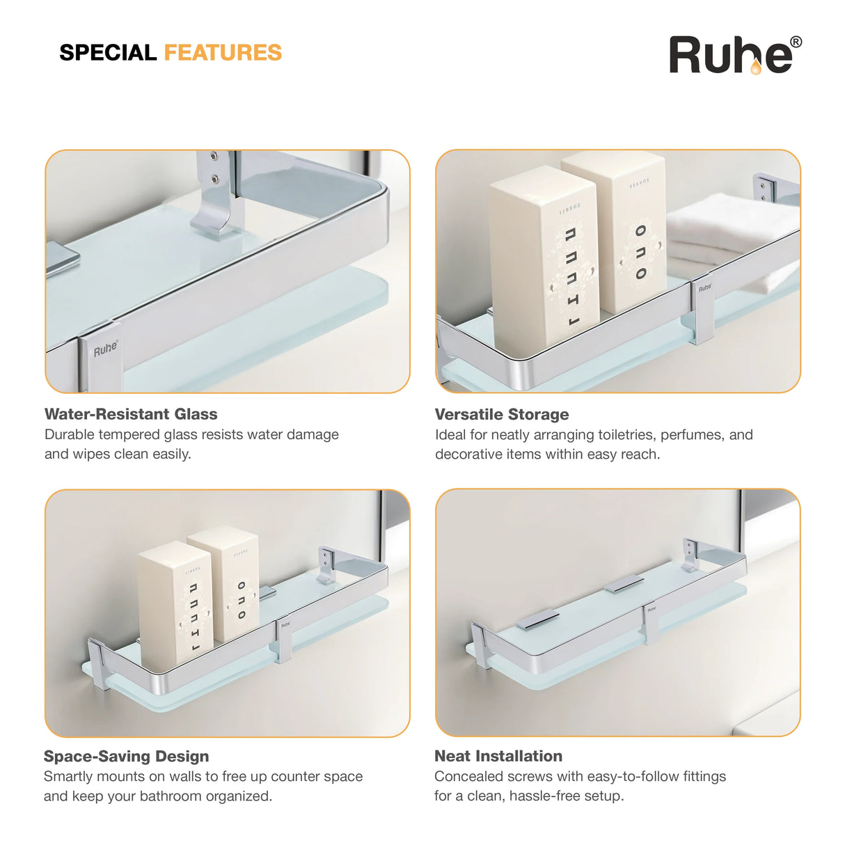 GLASS SHELF: A toughened frosted glass shelf that adds understated elegance while providing a robust surface for storing essentials neatly.
