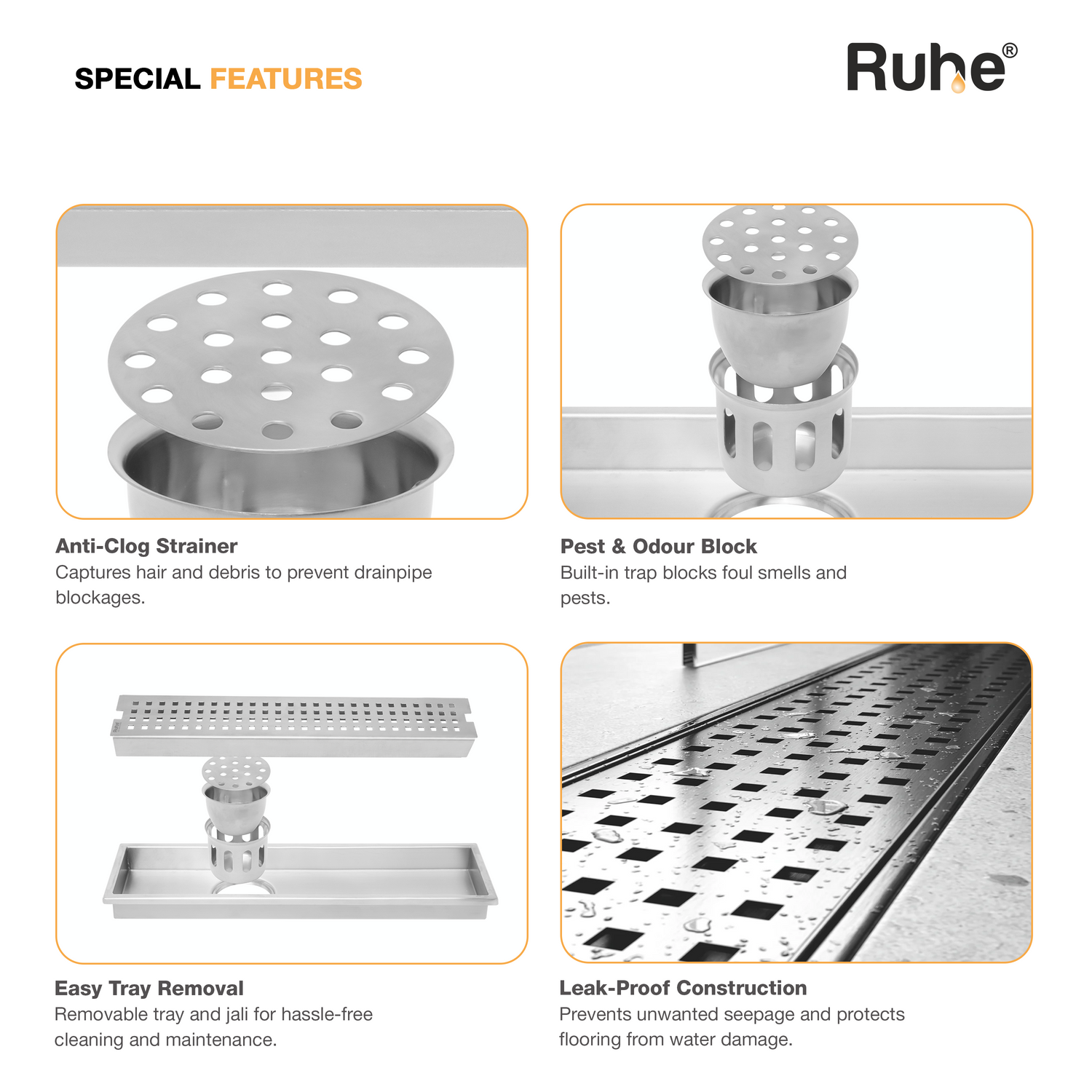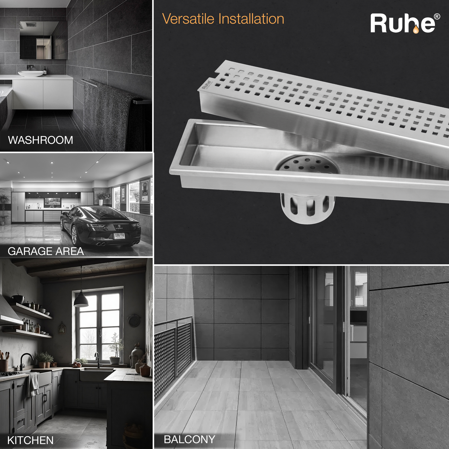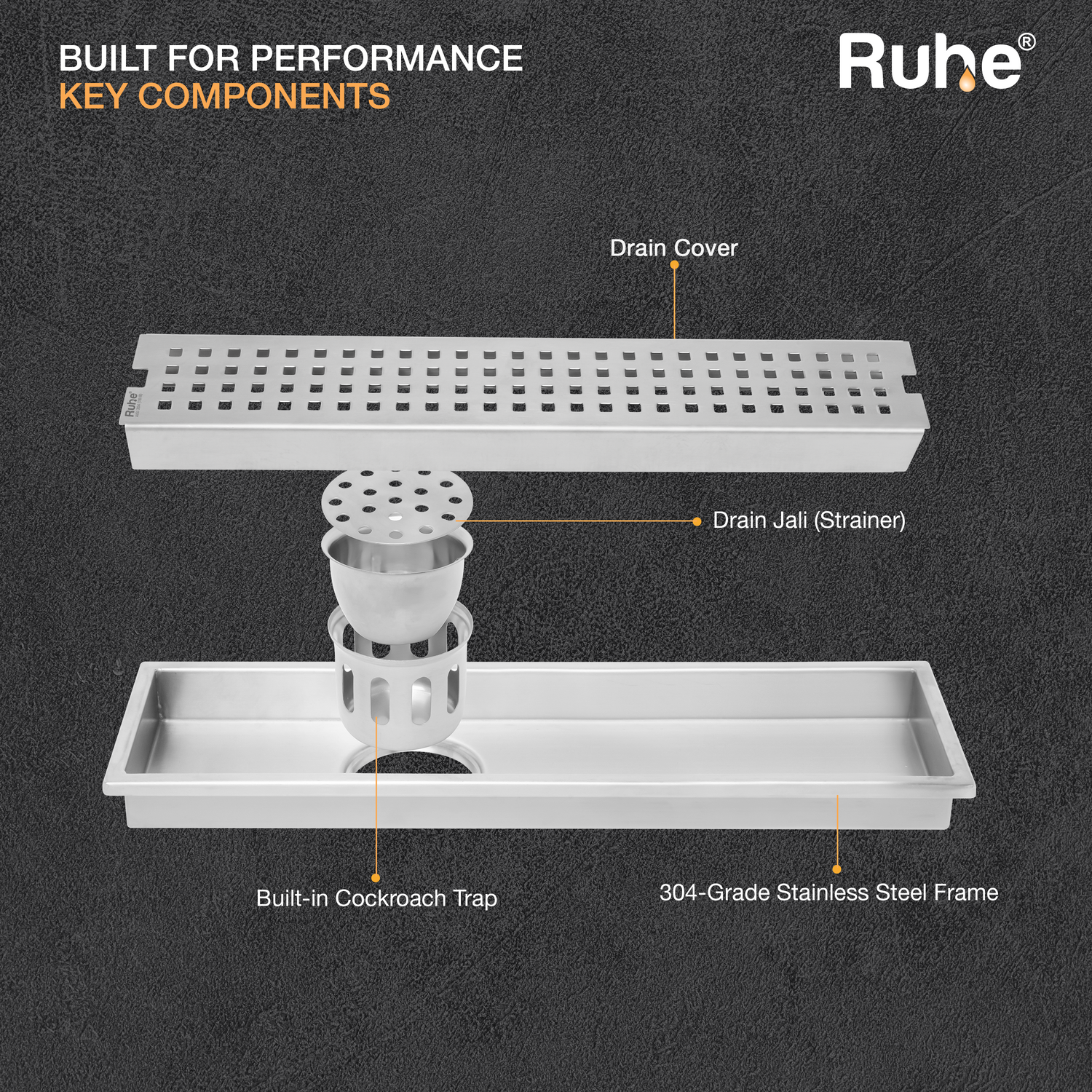 Ruhe Palo Shower Drain Channels made with 1mm Thick 304-Grade Stainless Steel are meant to handle large volumes of water and come with a Side Hole (customisable), Drain Cover, Tray, Cockroach Trap and a 10 Year Warranty.