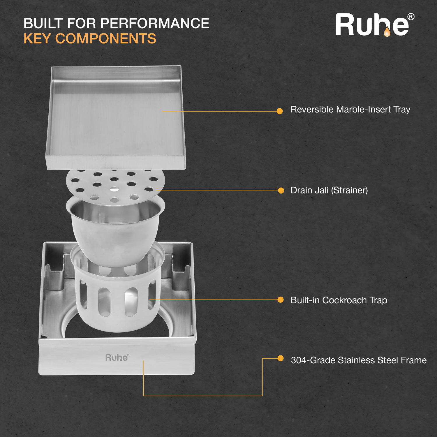 Ruhe Marble insert Shower Drain channels or Invisible Square Floor Drains built with 1mm Thick 304-Grade Stainless Steel are meant to handle large volumes of water, offer a seamless look, are specially designed for 21mm Thick Marble, come with a drain frame, tray, cockroach trap and 10 years warranty.