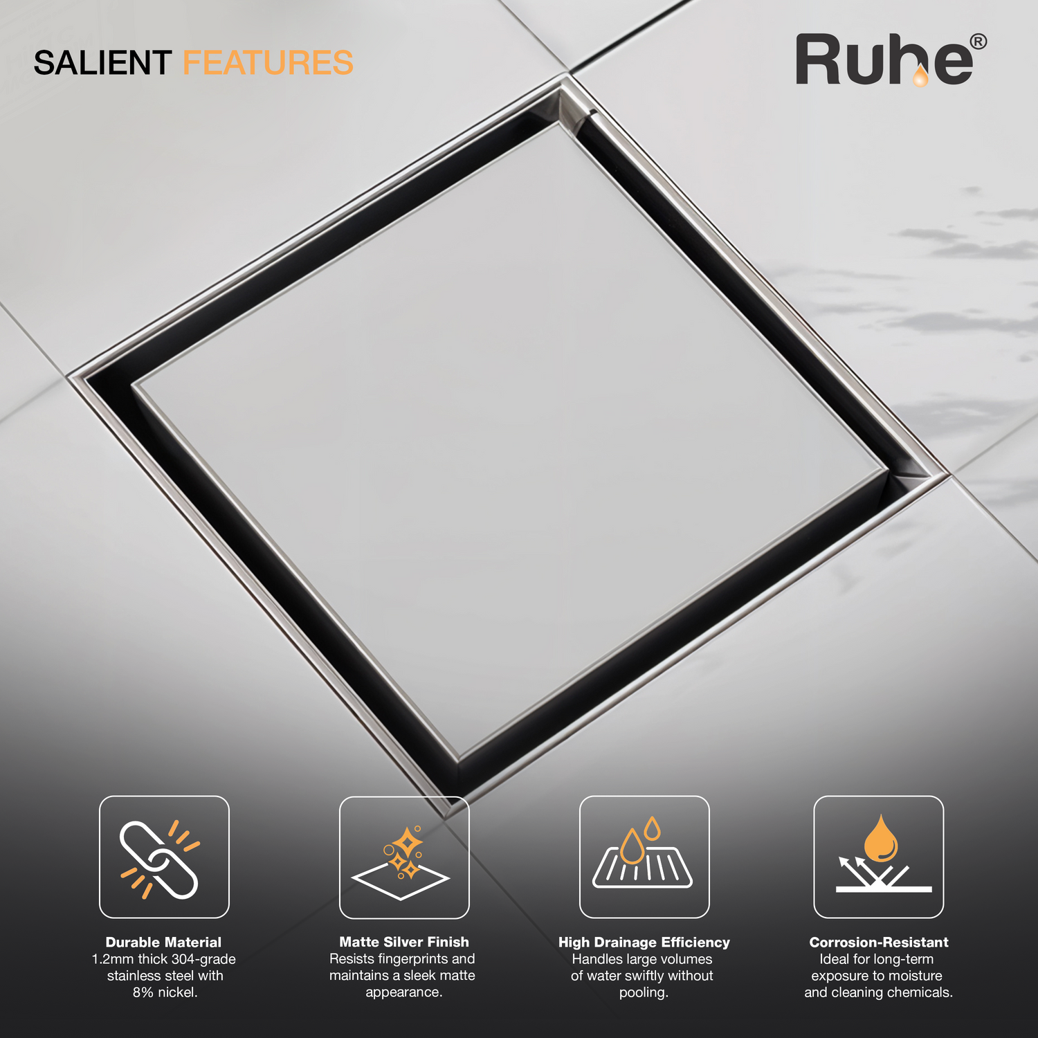 Ruhe Marble insert Shower Drain channels or Invisible Square Floor Drains built with 1mm Thick 304-Grade Stainless Steel are meant to handle large volumes of water, offer a seamless look, are specially designed for marbles upto 21mm Thick, come with a drain frame, tray, cockroach trap and 10 years warranty.