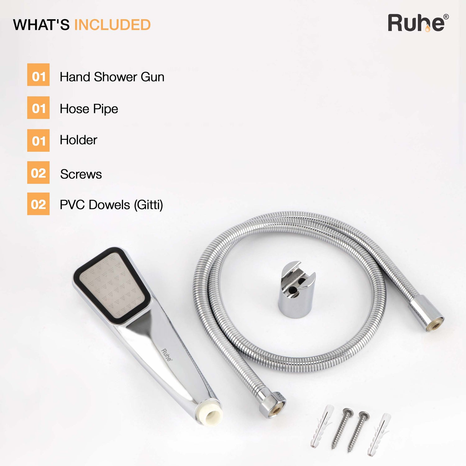 PACKAGE CONTENTS: An all-inclusive set that includes, 1 hand shower gun, 1.5m 304-grade stainless steel flexible hose pipe, ABS holder, 2 screws and 2 PVC dowels.