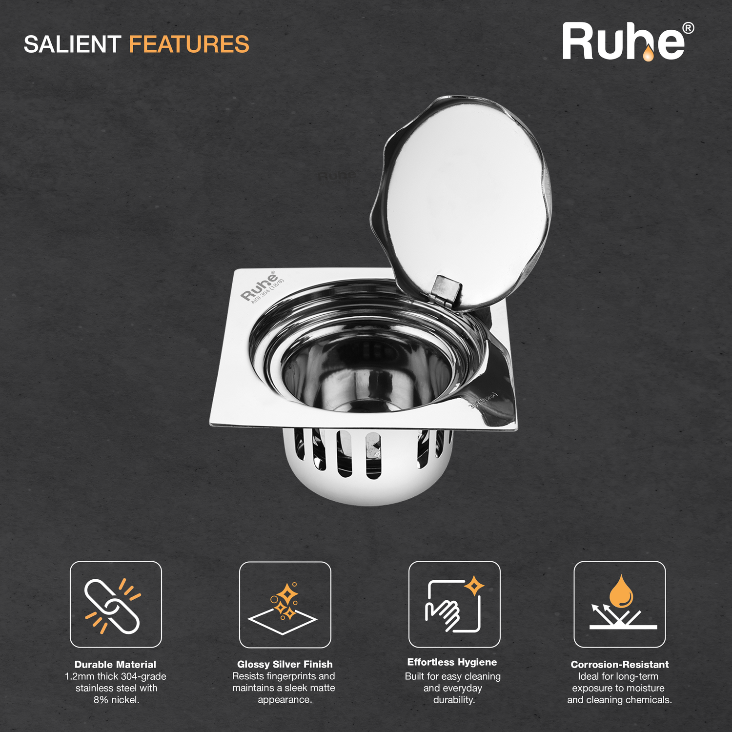 Full Moon Square 304-Grade Floor Drain with Cockroach Trap (5 x 5 Inches) - by Ruhe