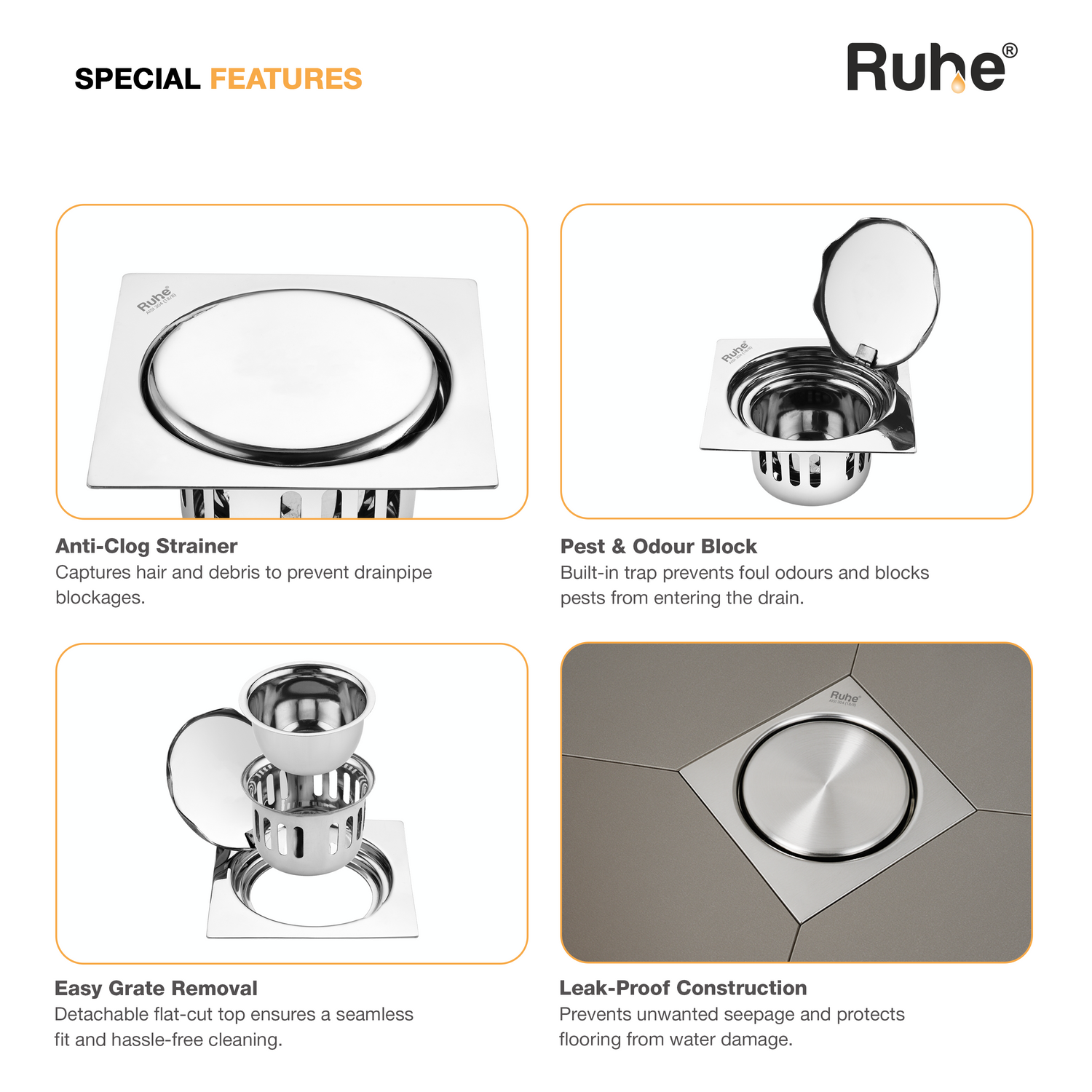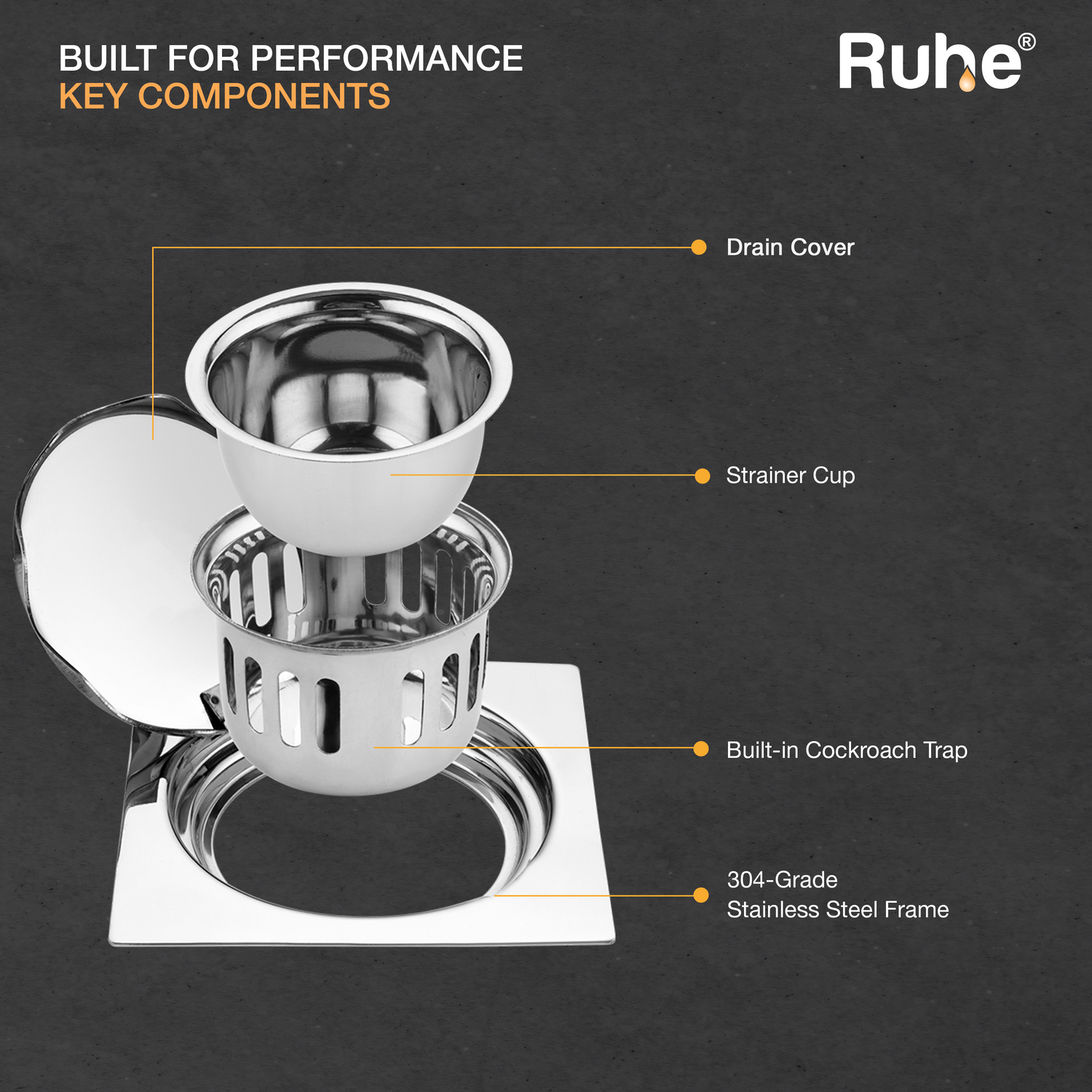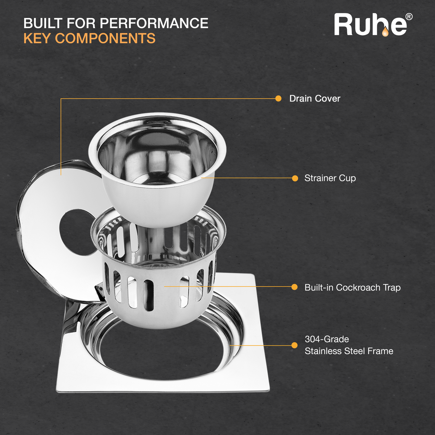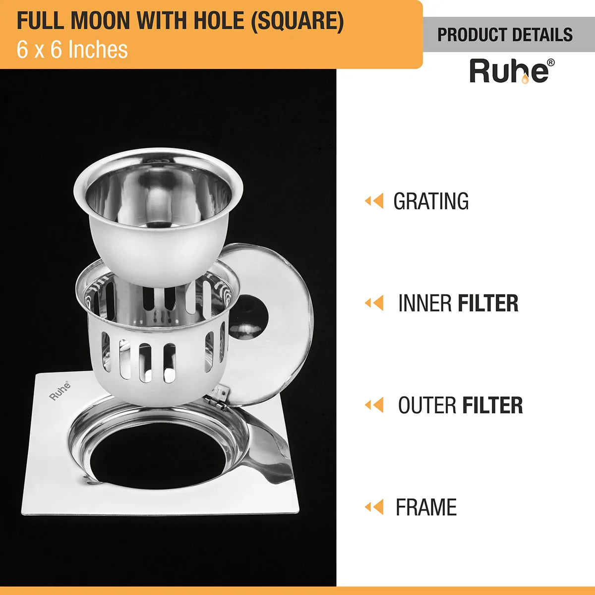 • Includes a drain frame, jali, inner and outer strainer.