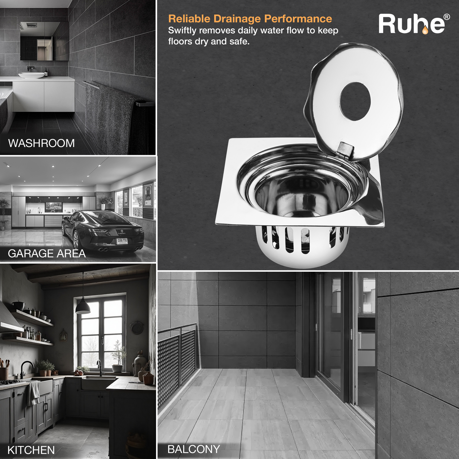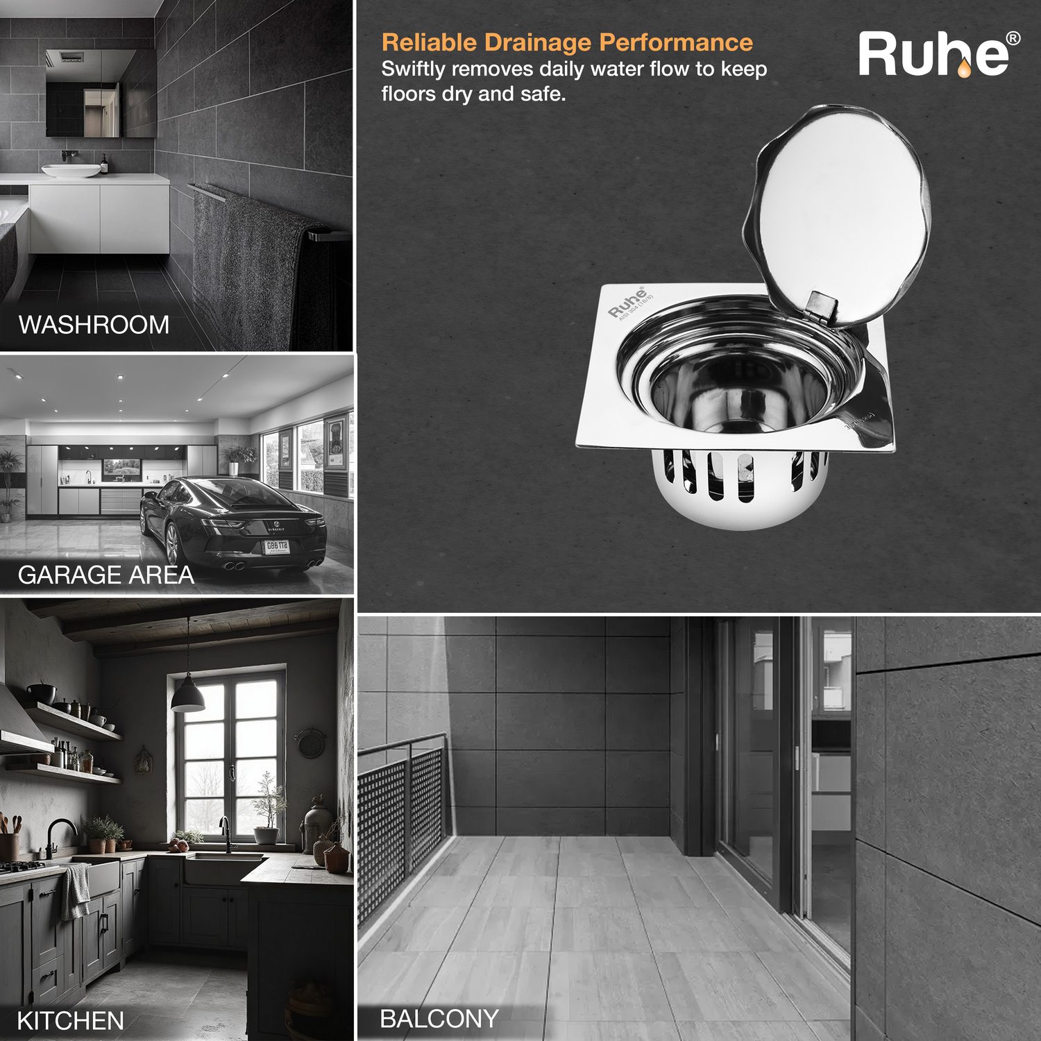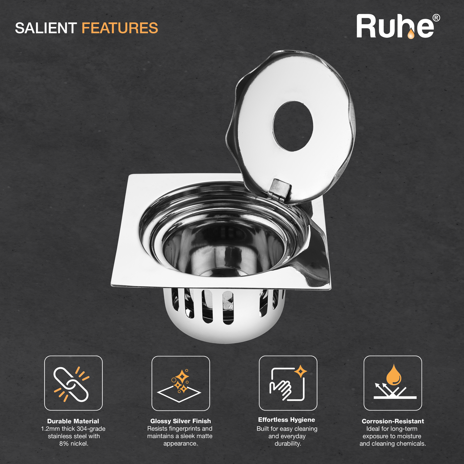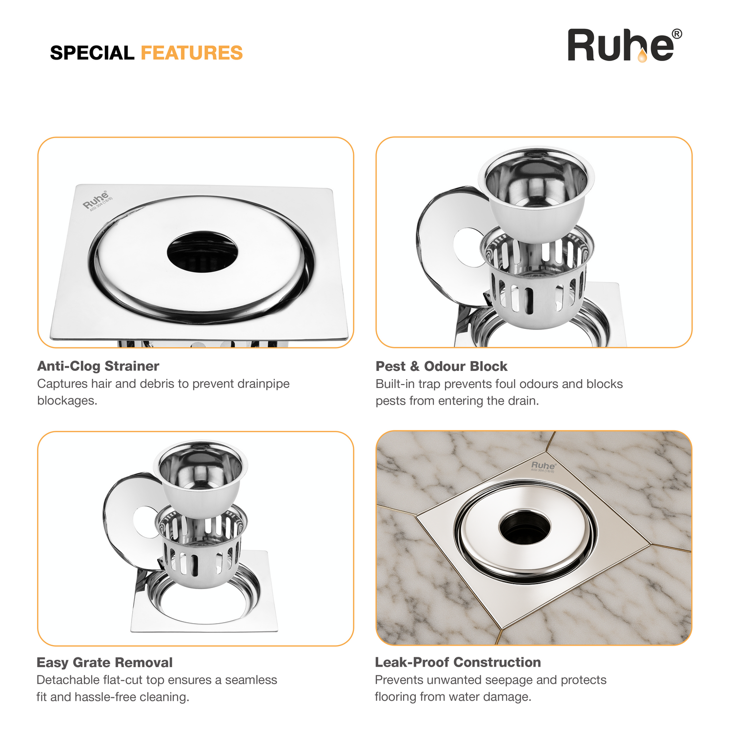 • Includes a drain frame, jali, inner and outer strainer.