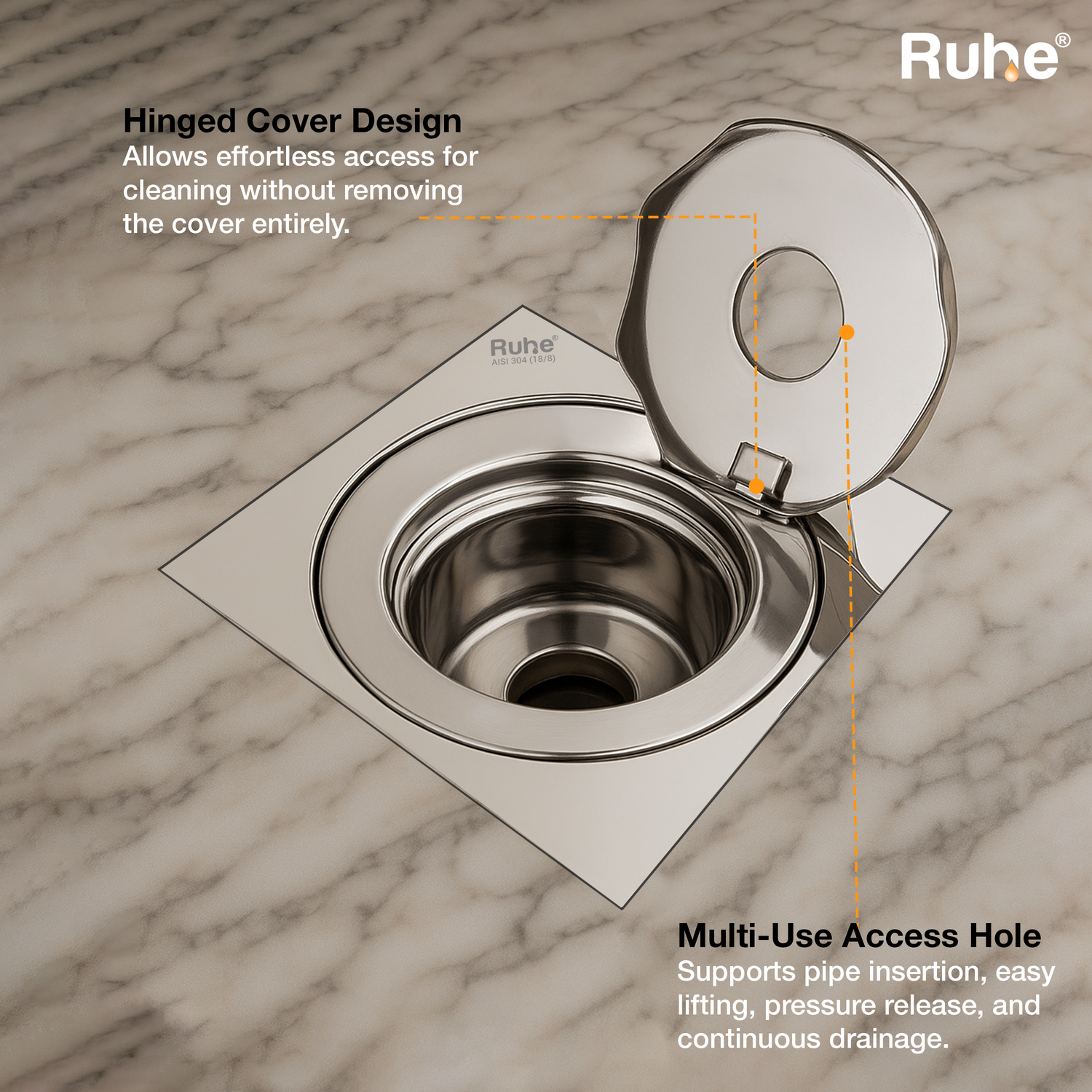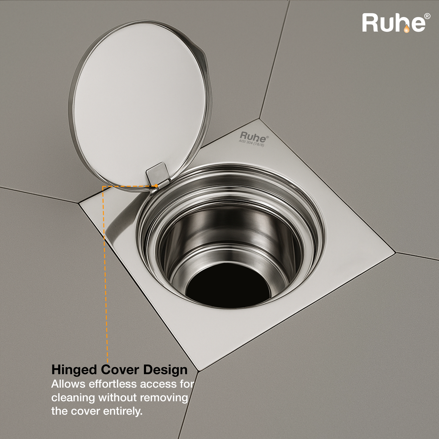 • Hinged round cover conceals the drain completely and stays secured, preventing misplacement.