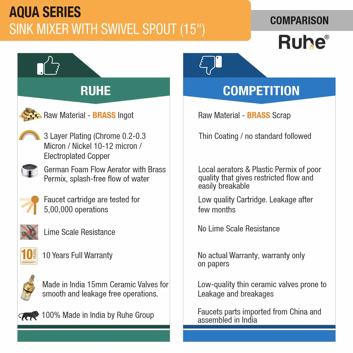 RUHE Sink Mixer with Round Swivel Spout Faucet from its Aqua collection is meant especially for wall mount installations for sinks/basins, and has a 360° rotating 12 inches small round spout that enables you to control the direction of the water flow, and allows you to mix hot and cold water.