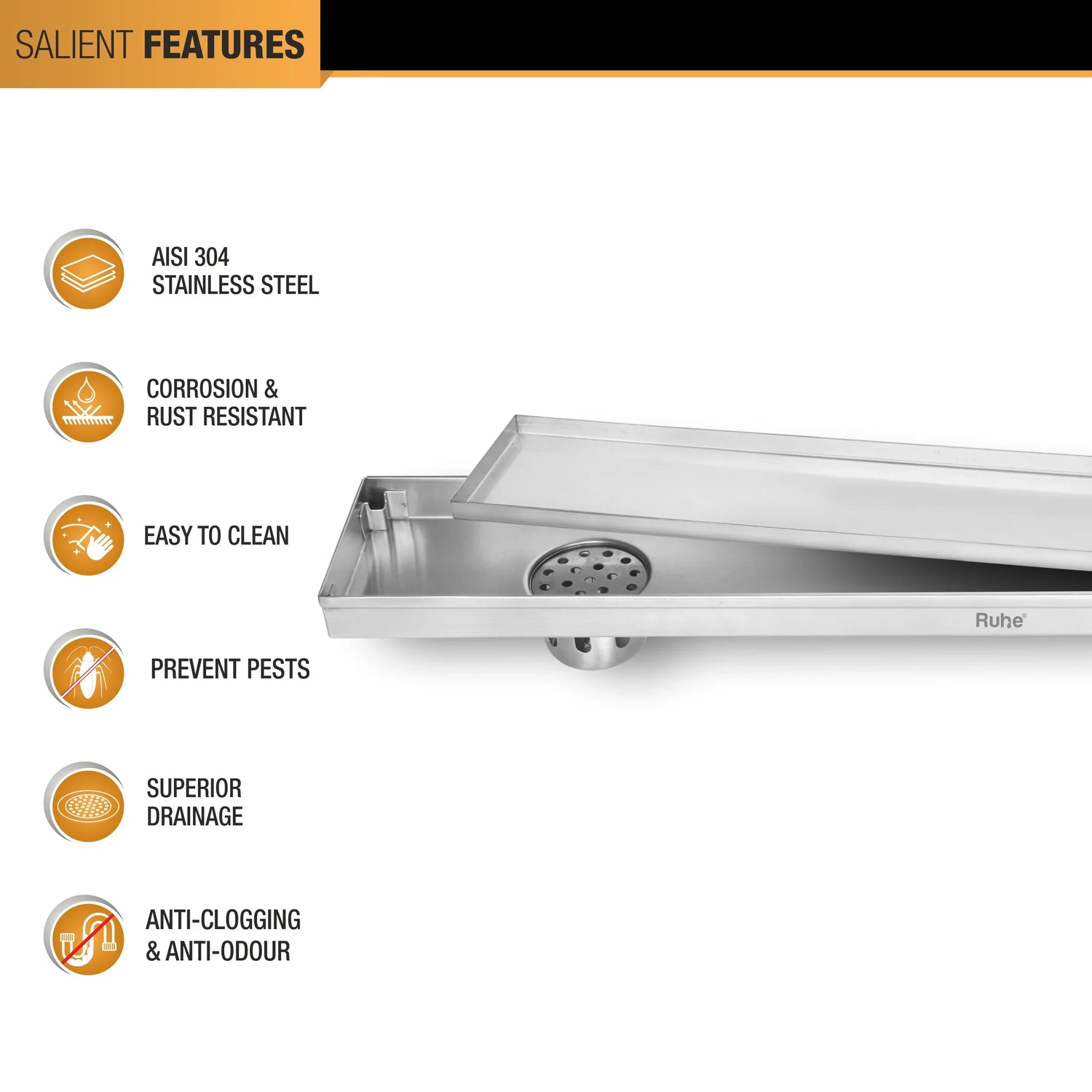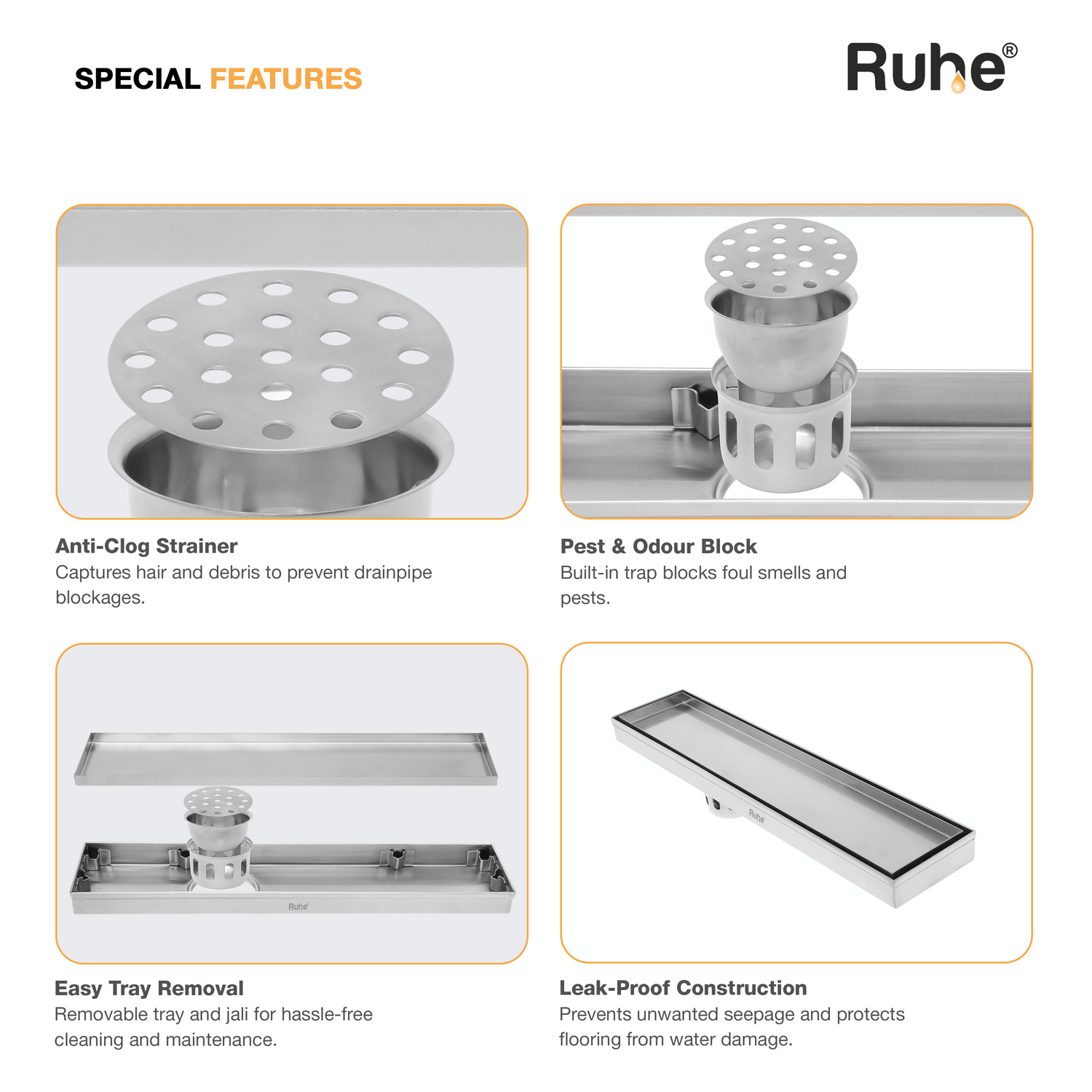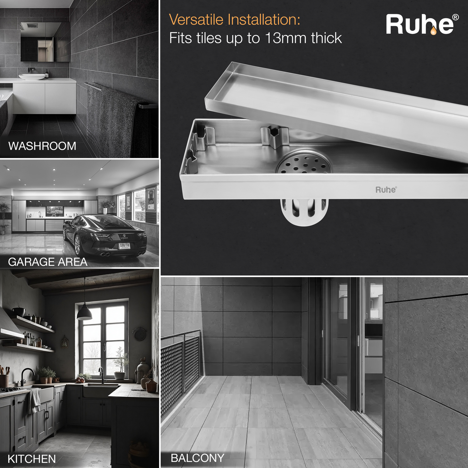 Ruhe Tile insert Shower Drain channels or Invisible Linear Floor Drains built with 1mm Thick 304-Grade Stainless Steel are meant to handle large volumes of water, offer a seamless look, are specially designed for tiles upto 13mm Thick, come with a drain frame, tray, cockroach trap and 10 years warranty.
