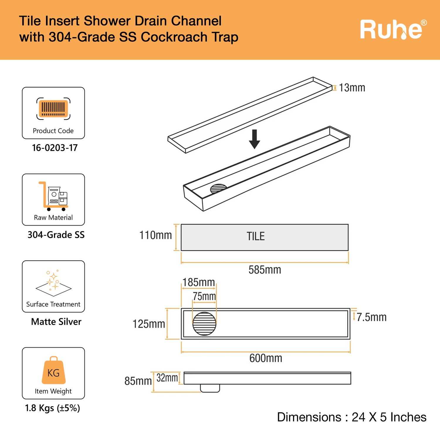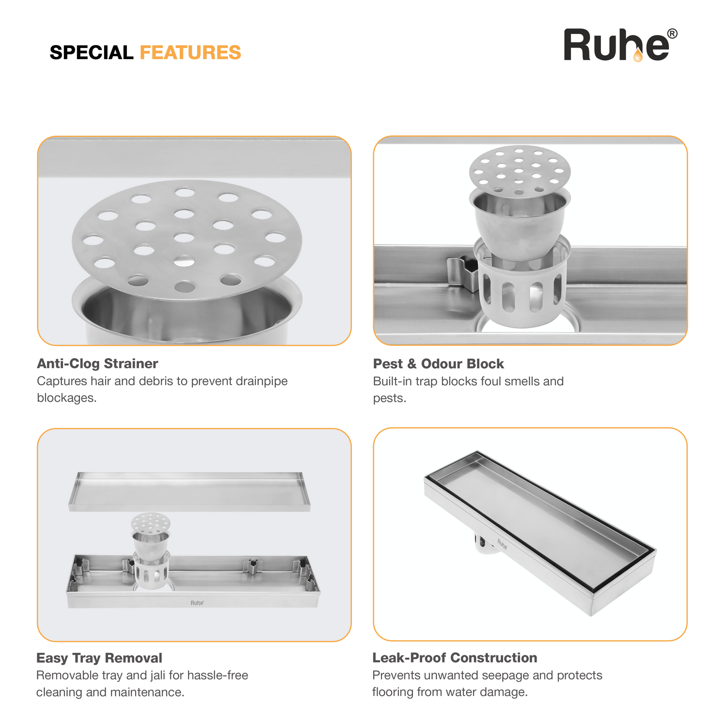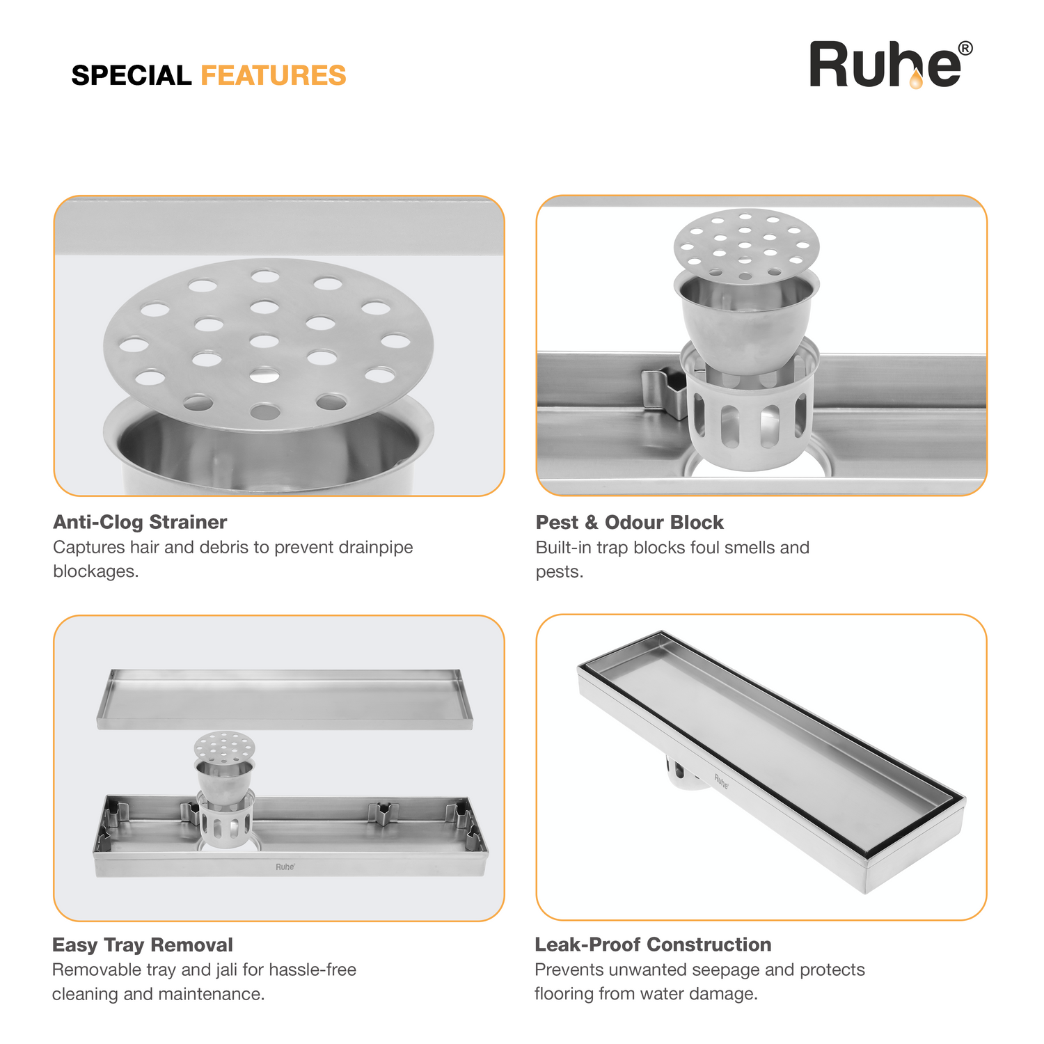 Tile Insert Shower Drain Channel (12 x 5 Inches) with Cockroach Trap (304 Grade) - by Ruhe®