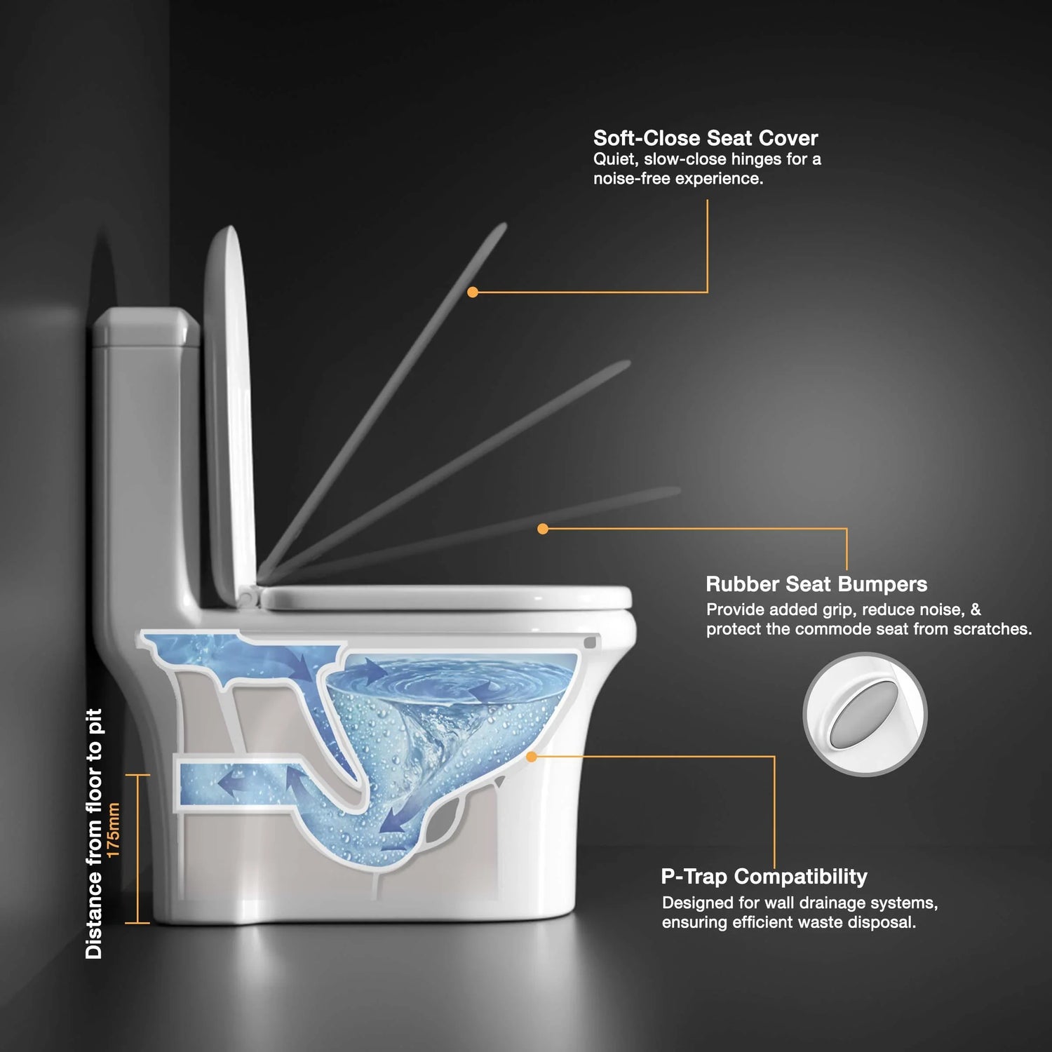 SOFT CLOSE SEAT COVER: Equipped with slow-closing hinges to prevent sudden slamming, providing a quiet and durable user experience. Fitted with rubber bumpers for added stability, noise reduction and surface protection.