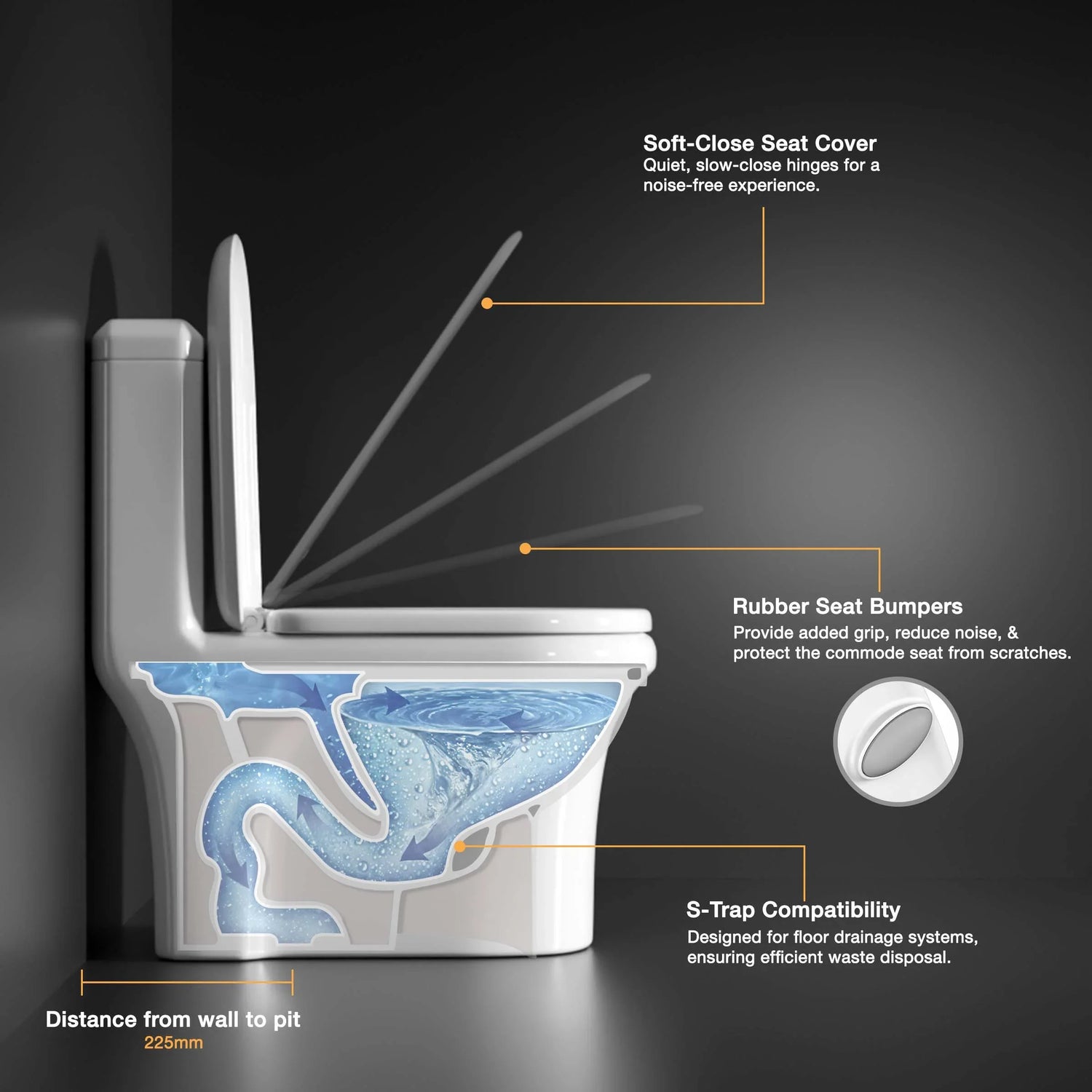 PIT DISTANCE FROM THE WALL: Spaced at 225mm for seamless installation and compatibility with standard plumbing configurations.