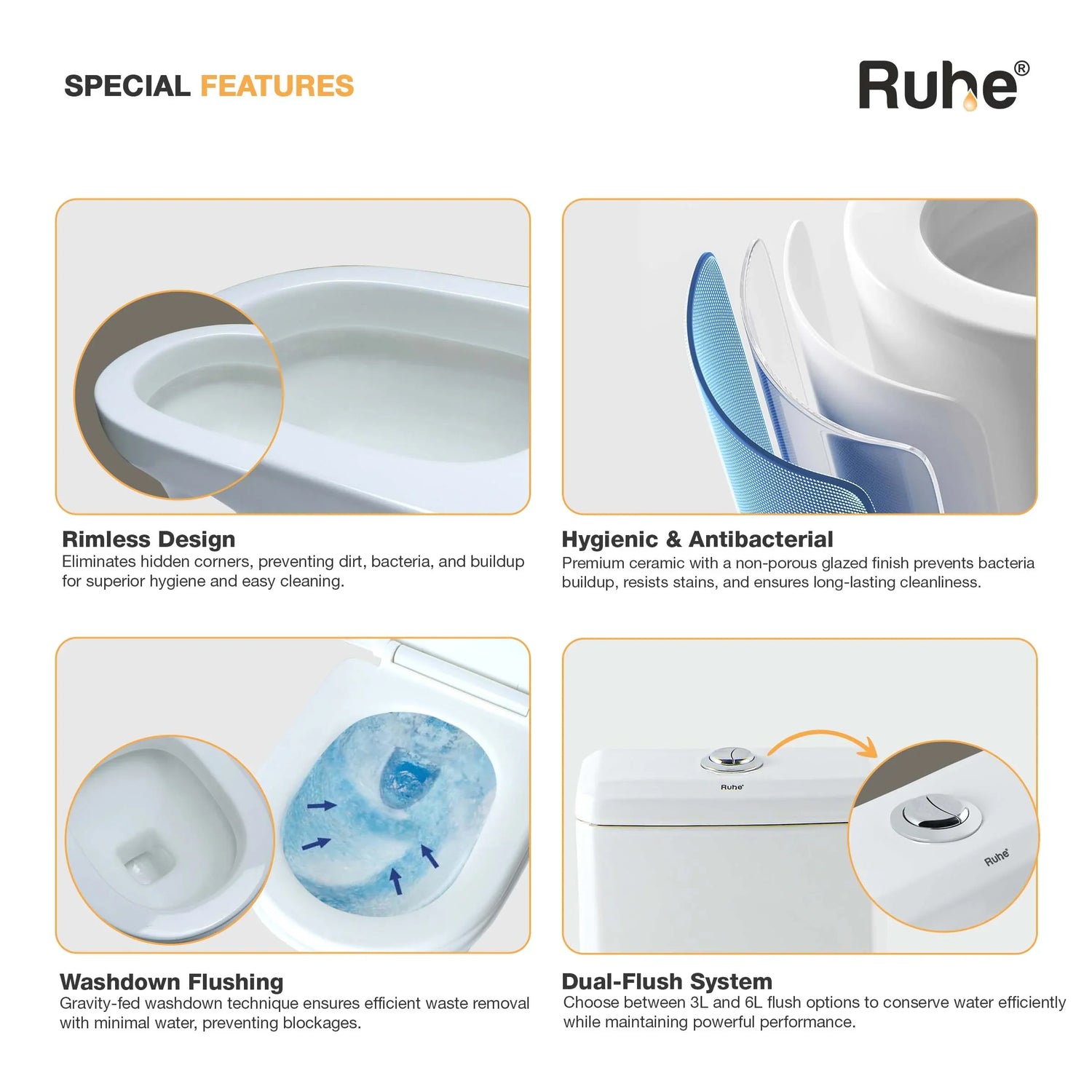 HYGIENIC & ANTI-BACTERIAL: The non-porous ceramic surface is infused with antibacterial properties, minimizing germ buildup and maintaining a healthier bathroom environment.