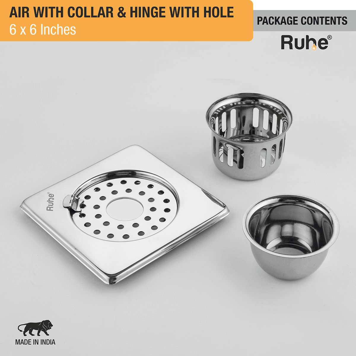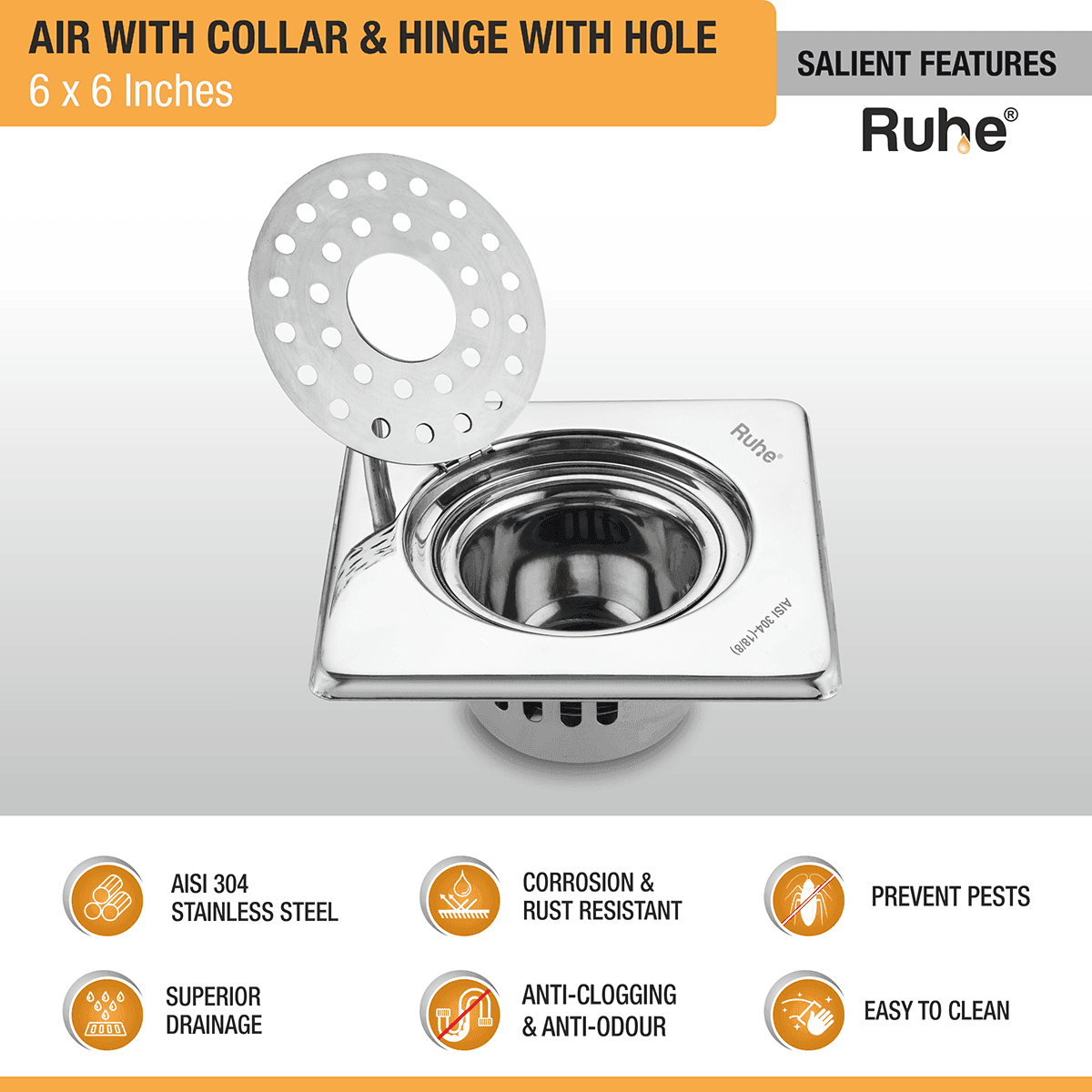 Air Square 304-Grade Floor Drain with Collar, Hinge, Hole & Cockroach Trap (6 x 6 Inches) - by Ruhe is backordered and will ship as soon as it is back in stock.