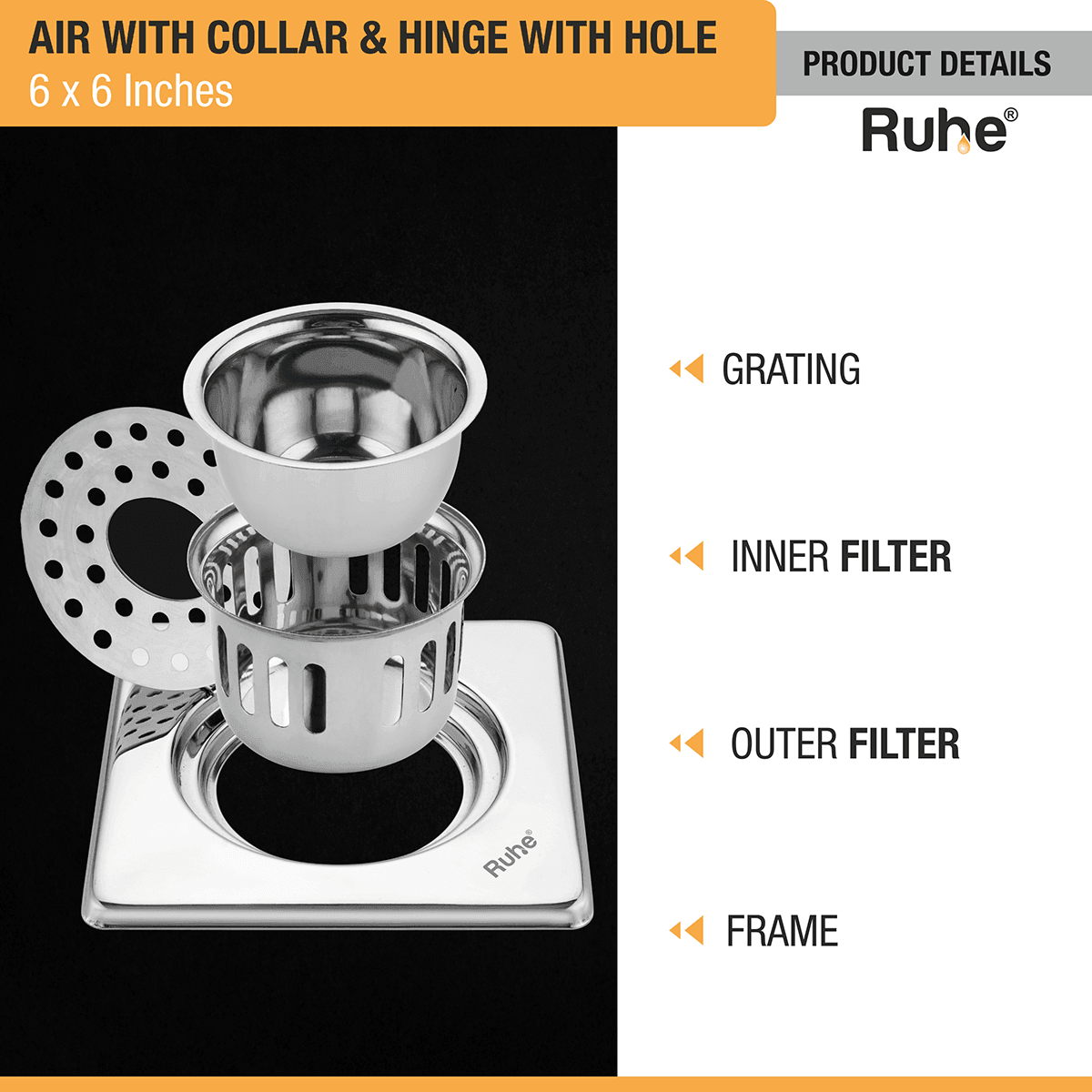Air Square 304-Grade Floor Drain with Collar, Hinge, Hole & Cockroach Trap (6 x 6 Inches) - by Ruhe is backordered and will ship as soon as it is back in stock.
