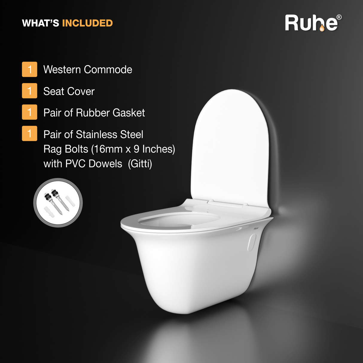 PACKAGE CONTENTS: The package includes 1 western commode, 1 seat cover and 1 pack of 2 stainless steel rag bolts (16mm x 9 inches).