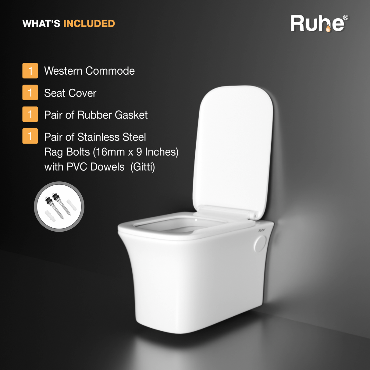 PACKAGE CONTENTS: The package includes 1 western commode, 1 seat cover and 1 pack of 2 stainless steel rag bolts (16mm x 9 inches).