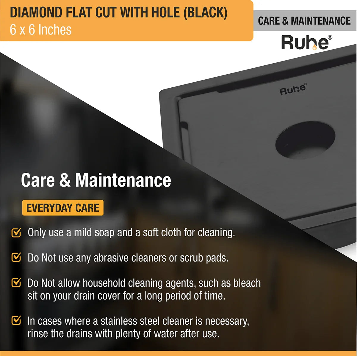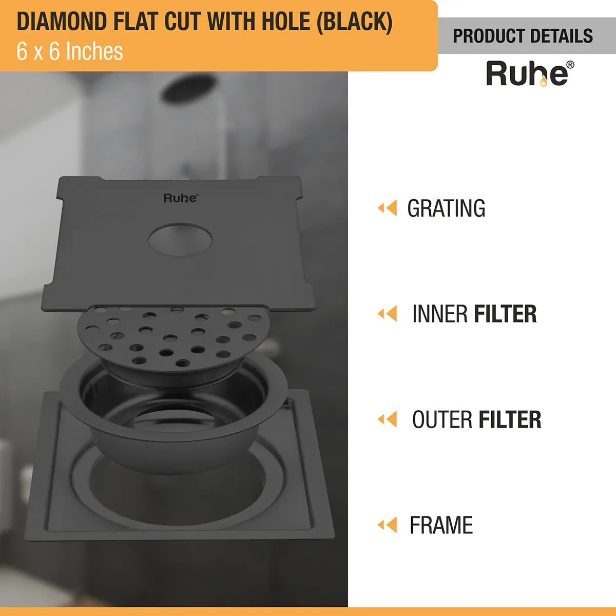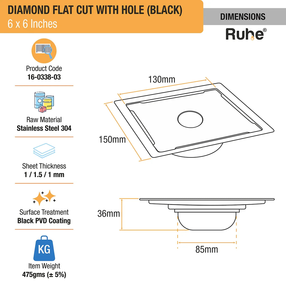 Diamond Square Flat Cut Floor Drain in Black PVD Coating (6 x 6 Inches) with Hole - by Ruhe is backordered and will ship as soon as it is back in stock.