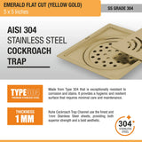 Ruhe Emerald Flat Cut Floor Drain built with 1mm Thick 304-Grade Stainless Steel and beautiful Yellow Gold PVD Coating offers a luxurious look, fast-drainage, prevention of odour, pests and blockages and comes with 10 years warranty.