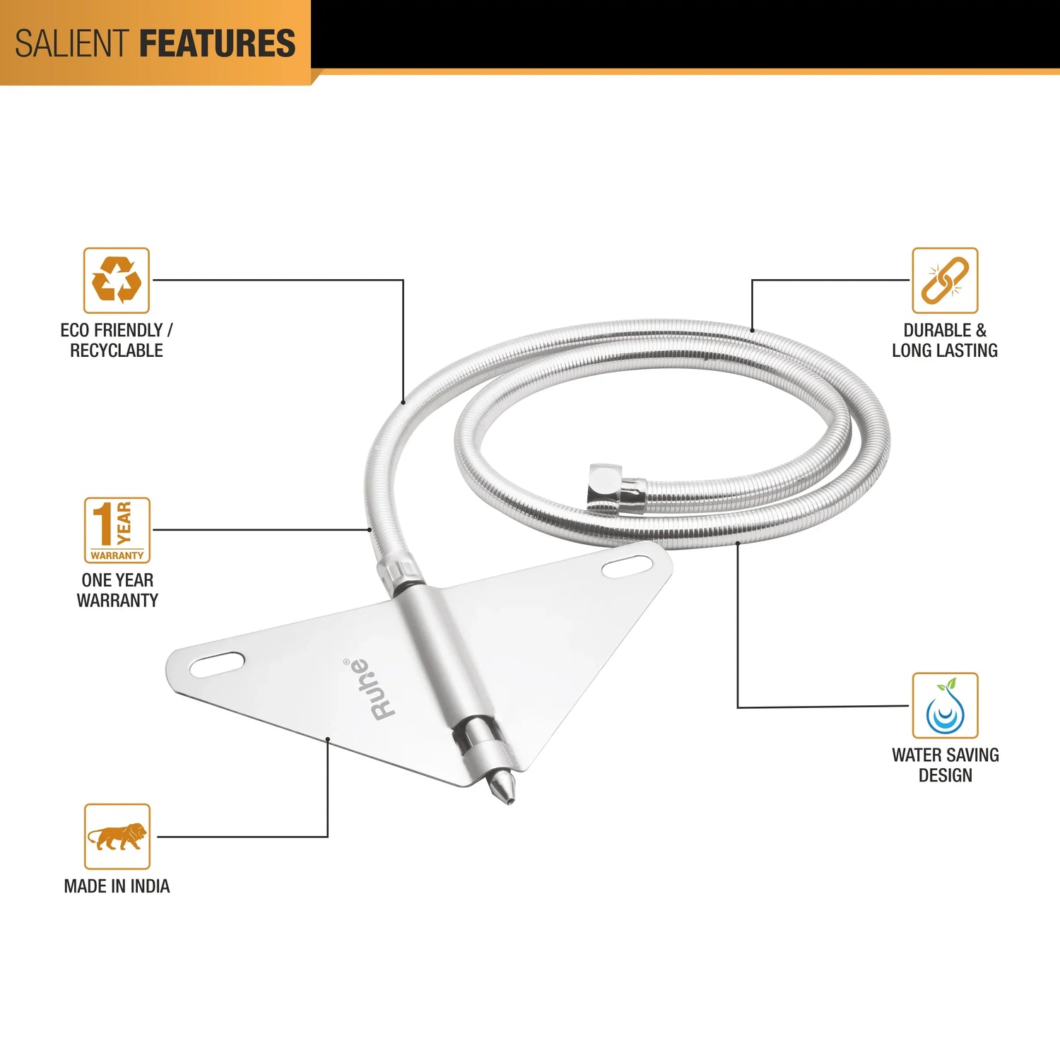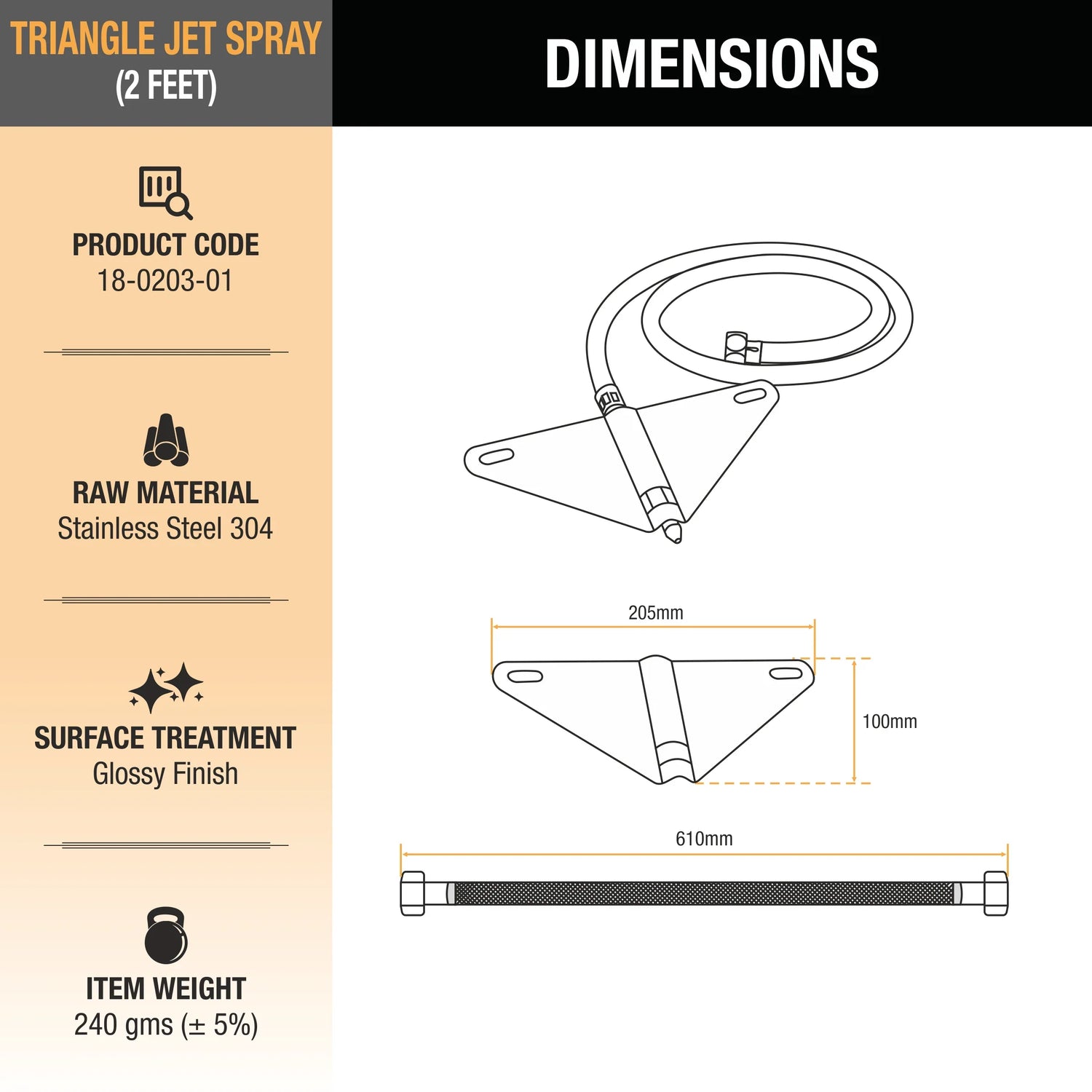 • The hands-free jet spray nozzle and its holder are manufactured in AISI 304-grade Stainless Steel.