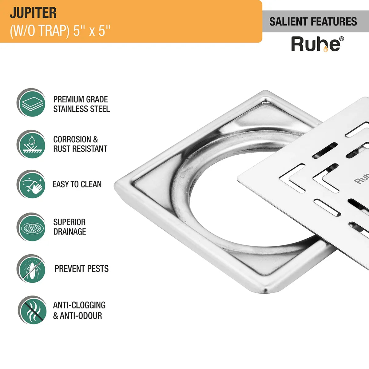 Ruhe Jupiter Square Premium Floor Drain is a contemporary, robust and beautifully designed Drain Jali that allows quick drainage and comes with 10 years warranty.
