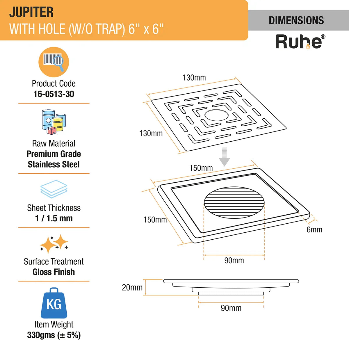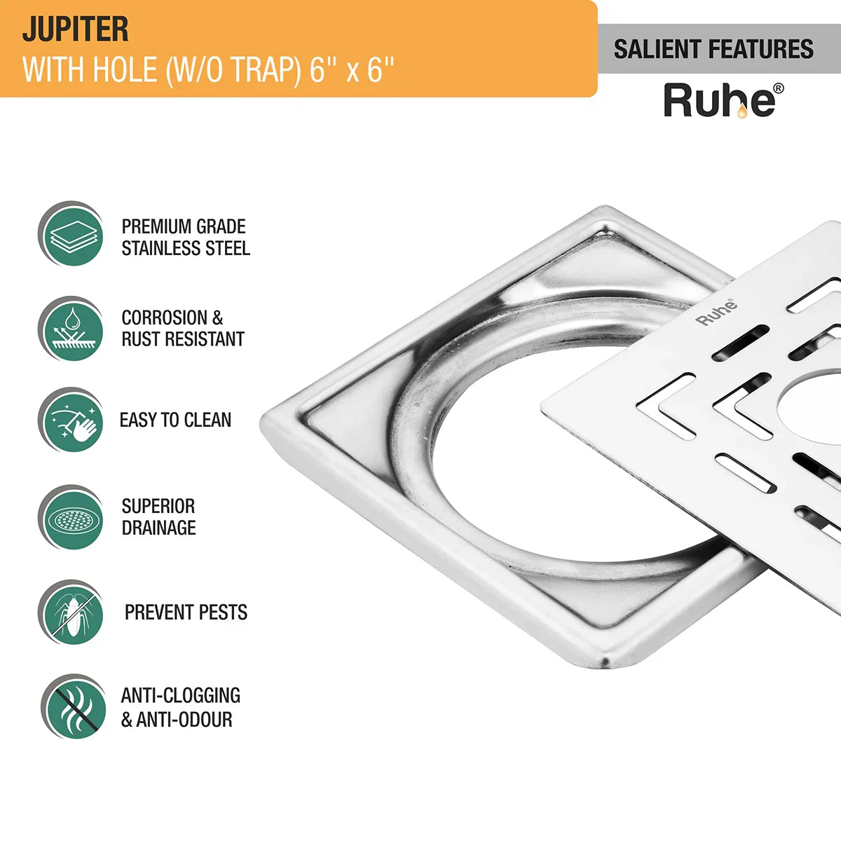 Ruhe Jupiter Square Premium Floor Drain is a contemporary, robust and beautifully designed Drain Jali that allows quick drainage and comes with an inbuilt hole for attachment of wastepipes and 10 years warranty.