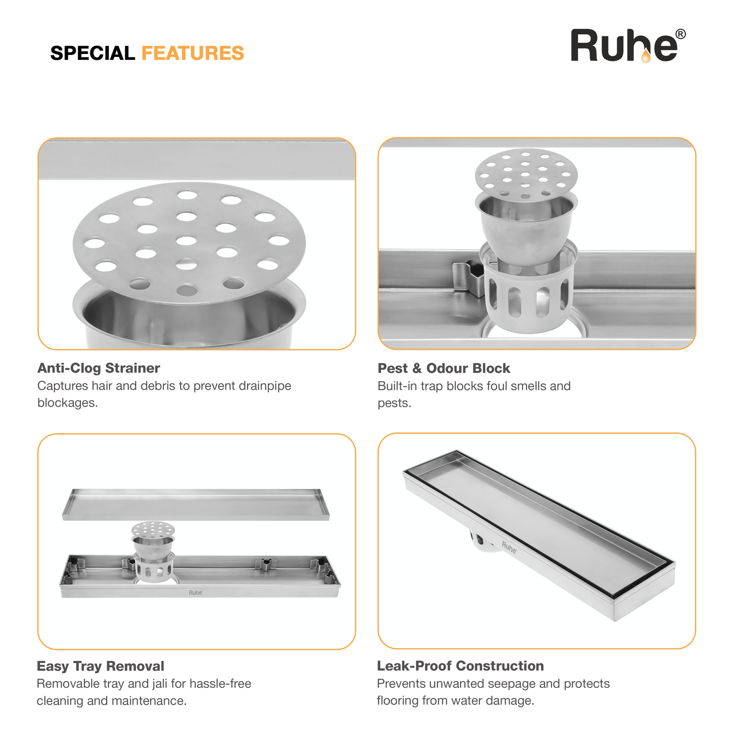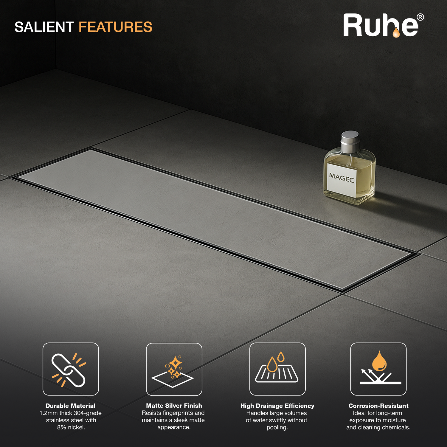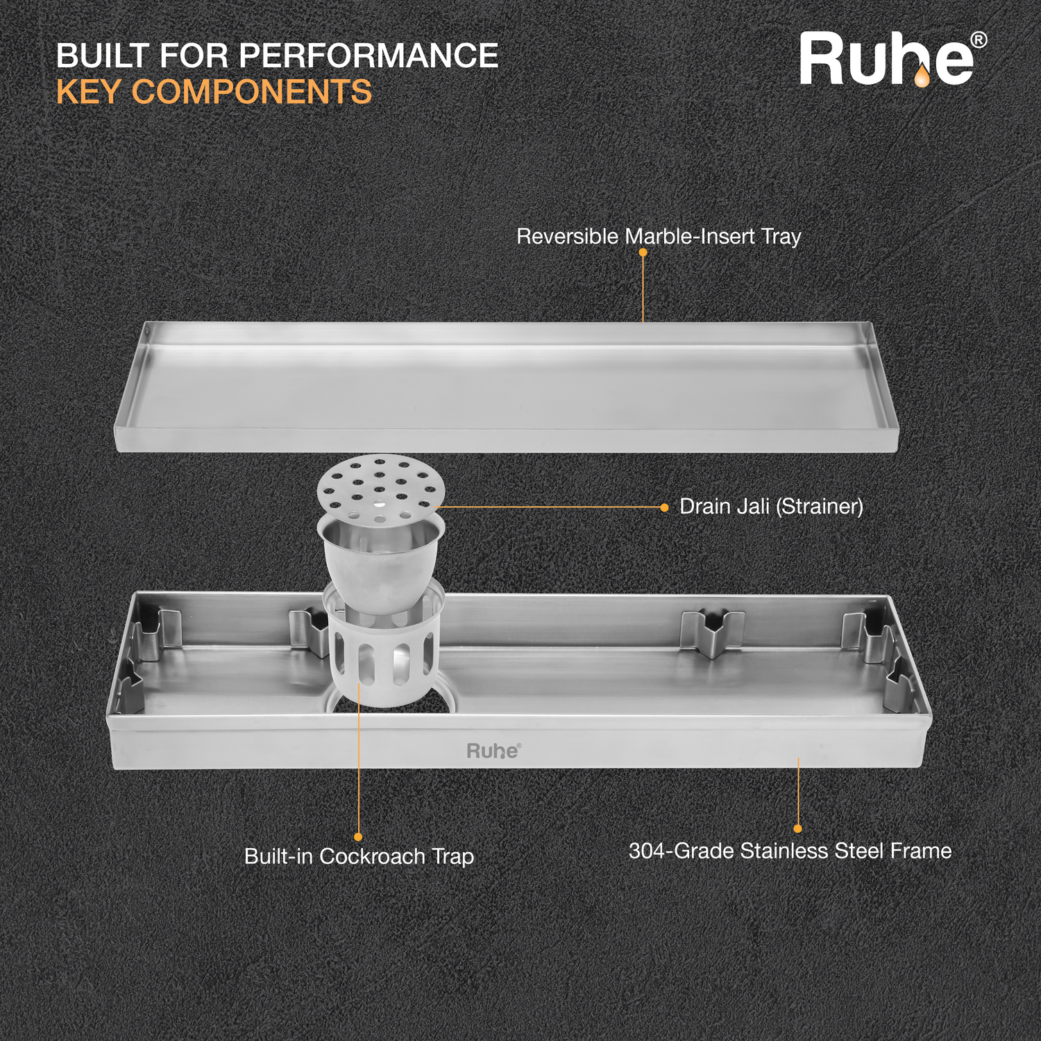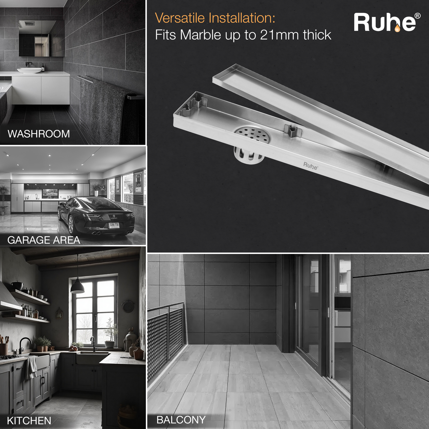 Ruhe Marble insert Shower Drain channels or Invisible Linear Floor Drains built with 1mm Thick 304-Grade Stainless Steel are meant to handle large volumes of water, offer a seamless look, are specially designed for marbles upto 21mm Thick, come with a drain frame, tray, cockroach trap and 10 years warranty.