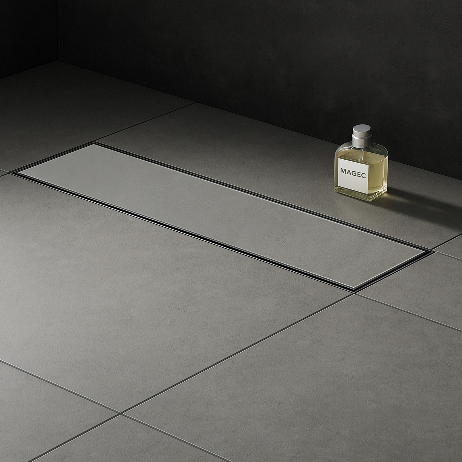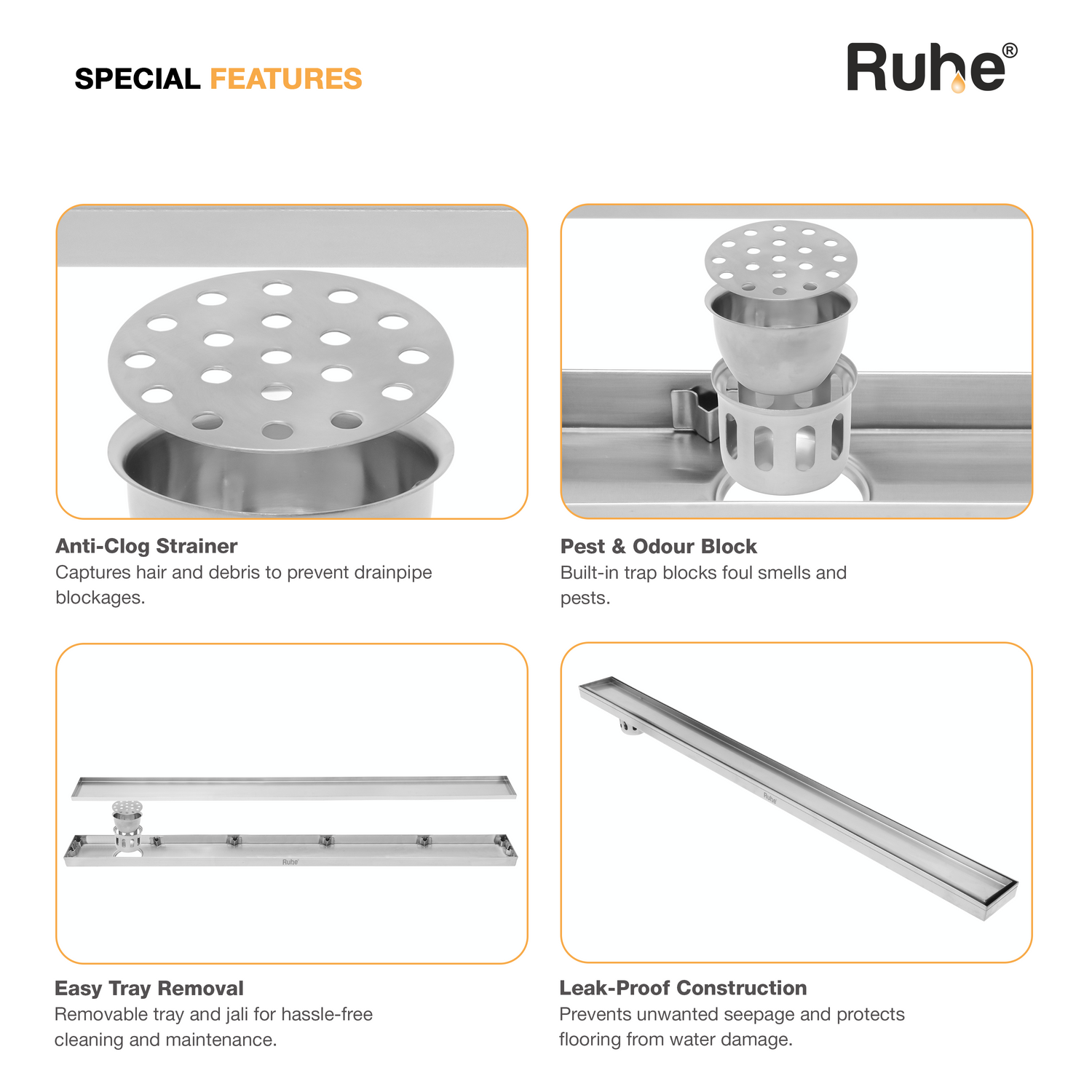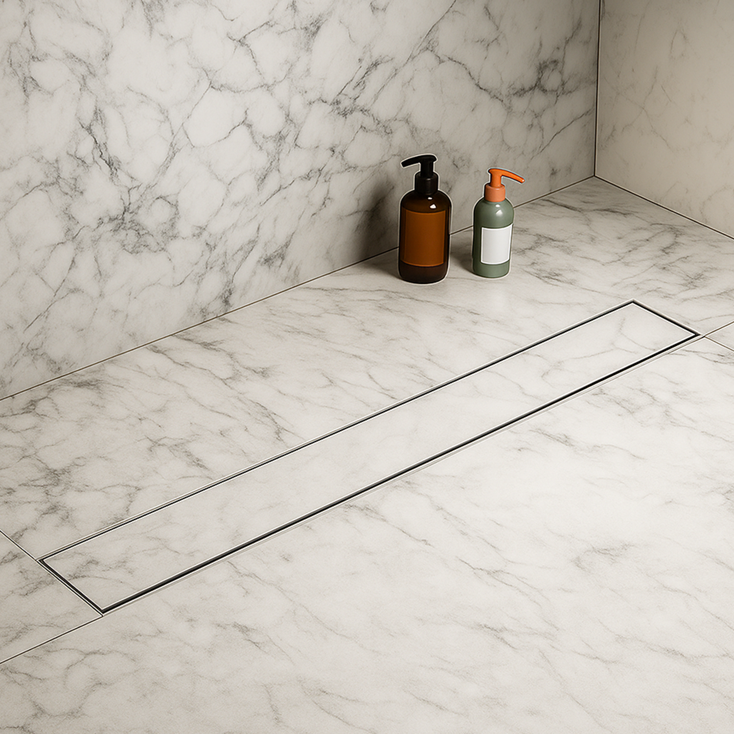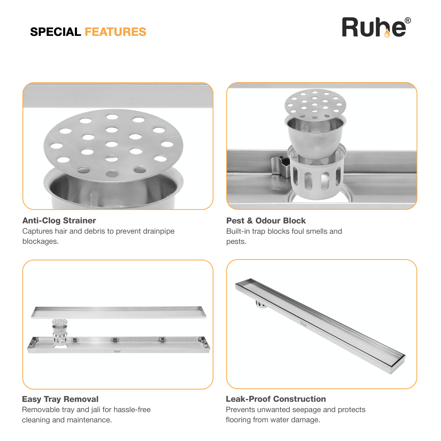 Ruhe Marble insert Shower Drain channels or Invisible Linear Floor Drains built with 1mm Thick 304-Grade Stainless Steel are meant to handle large volumes of water, offer a seamless look, are specially designed for marbles upto 21mm Thick, come with a drain frame, tray, cockroach trap and 10 years warranty.